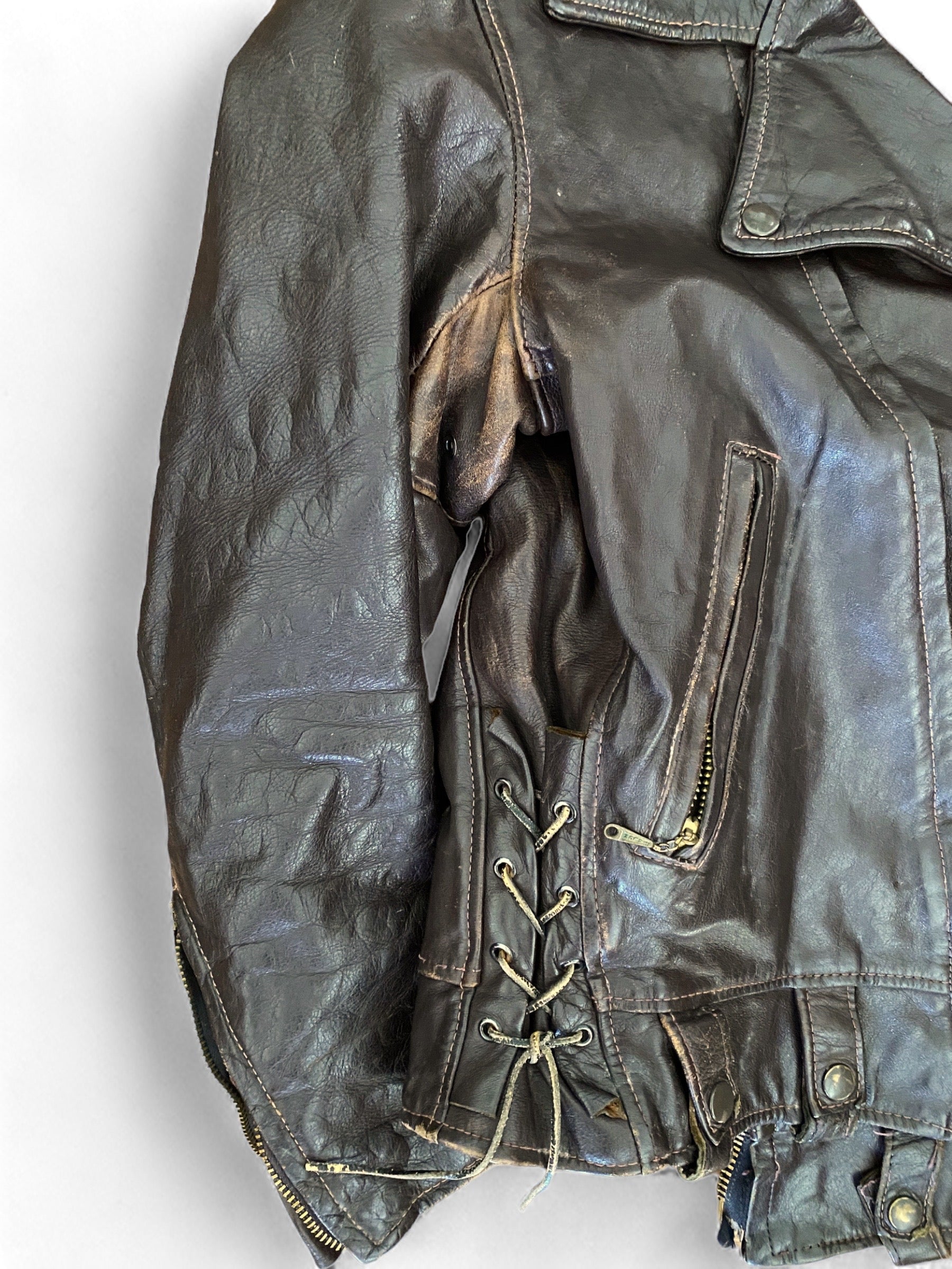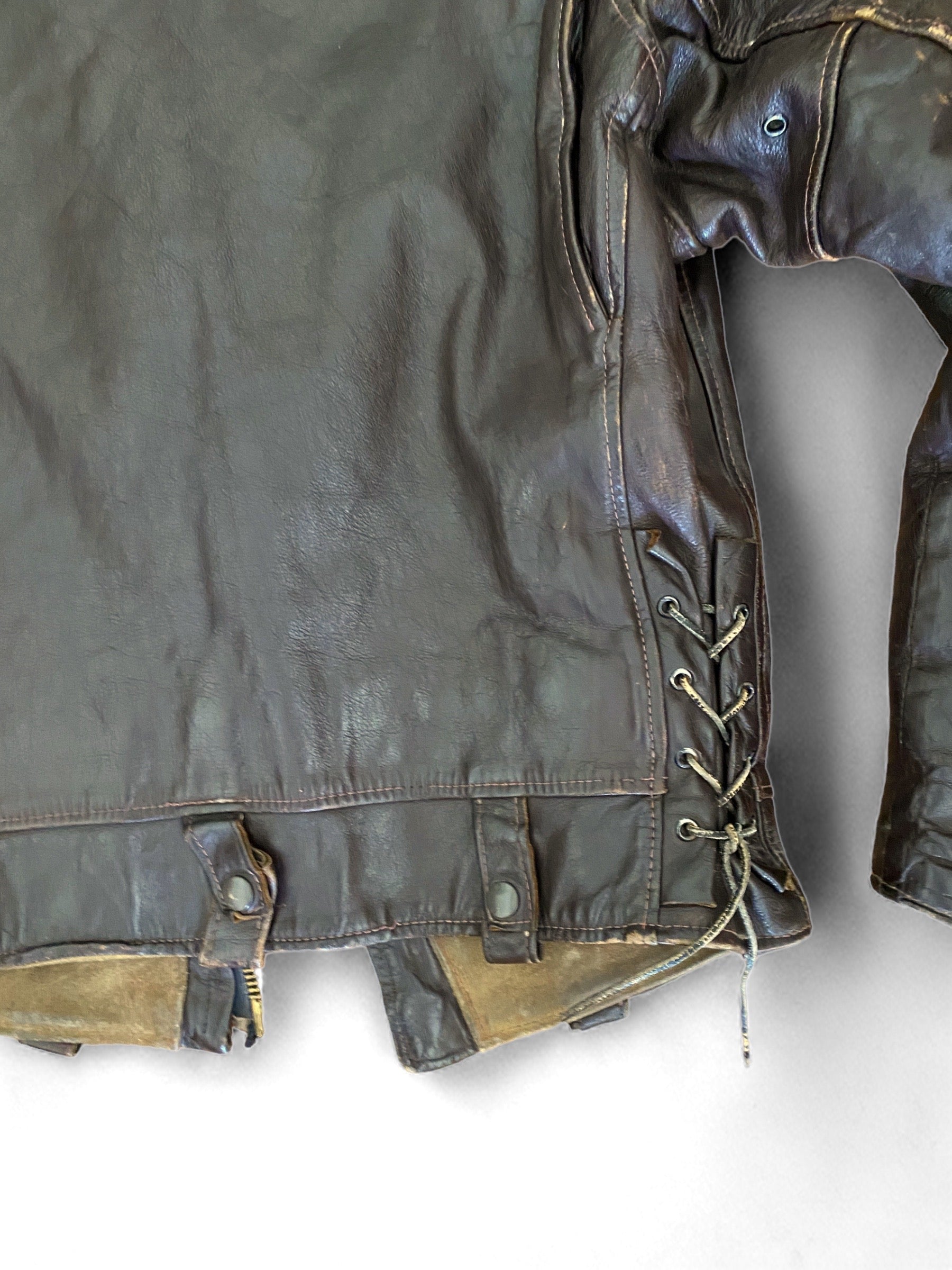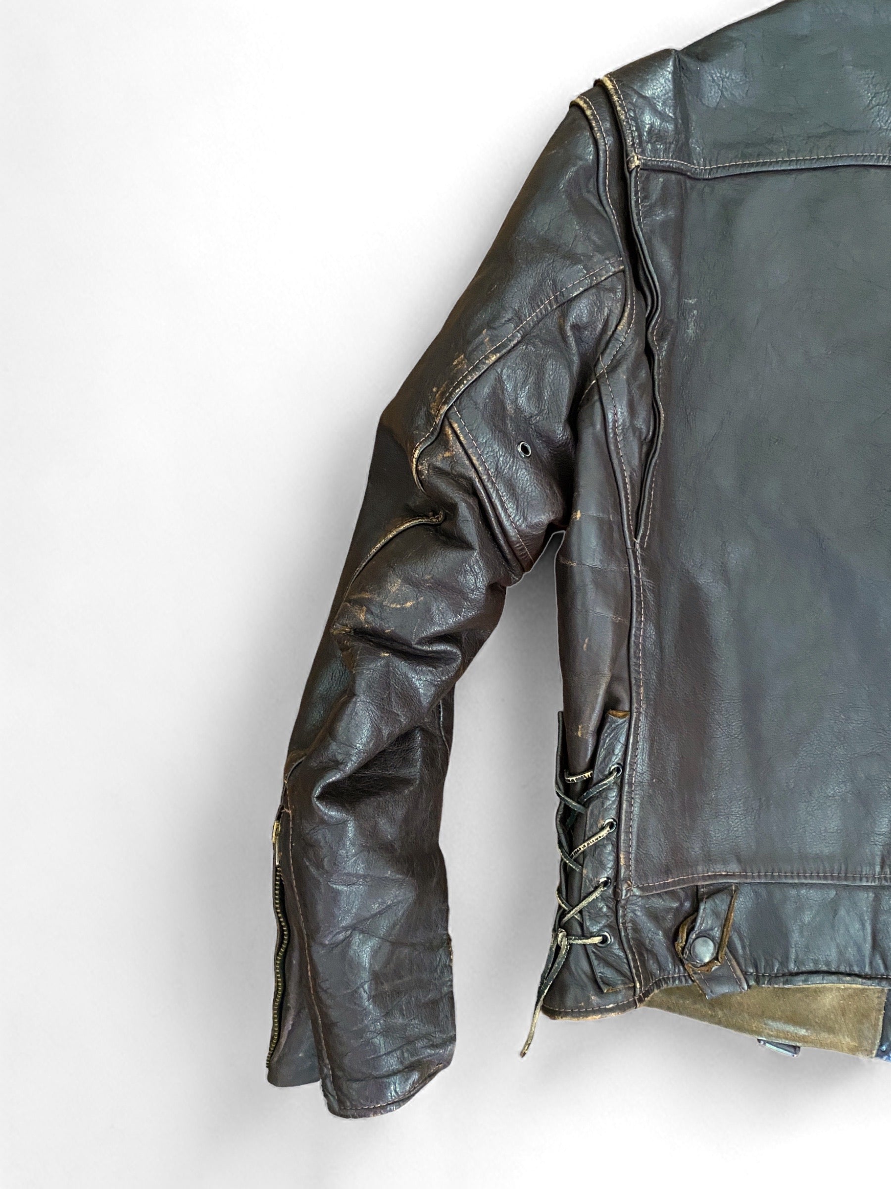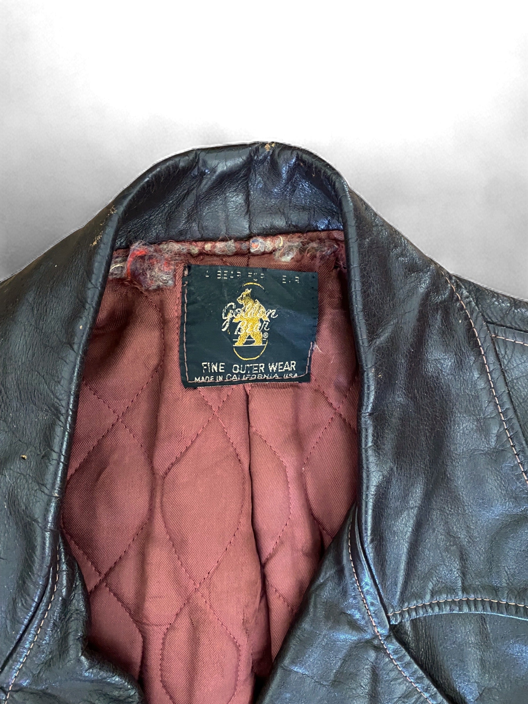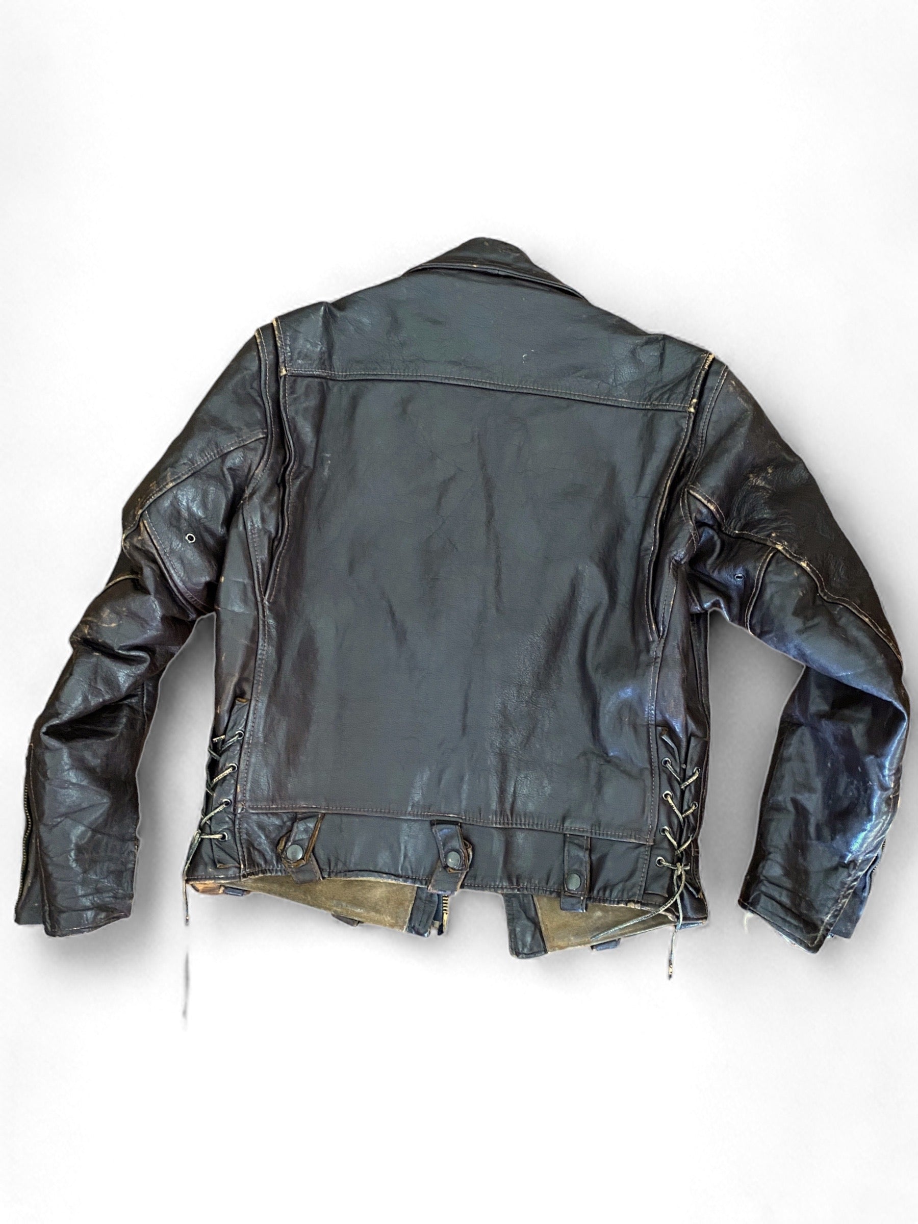 Ultra rare brown leather motorcycle jacket by Bay Area designer Golden Bear. Circa 1950s. Corset ties on each side. Quilted lining. Manufacturer specialized in making collegiate outerwear such as letterman jackets. Gorgeous patina for a jacket that has a ton of history and narrative from use.