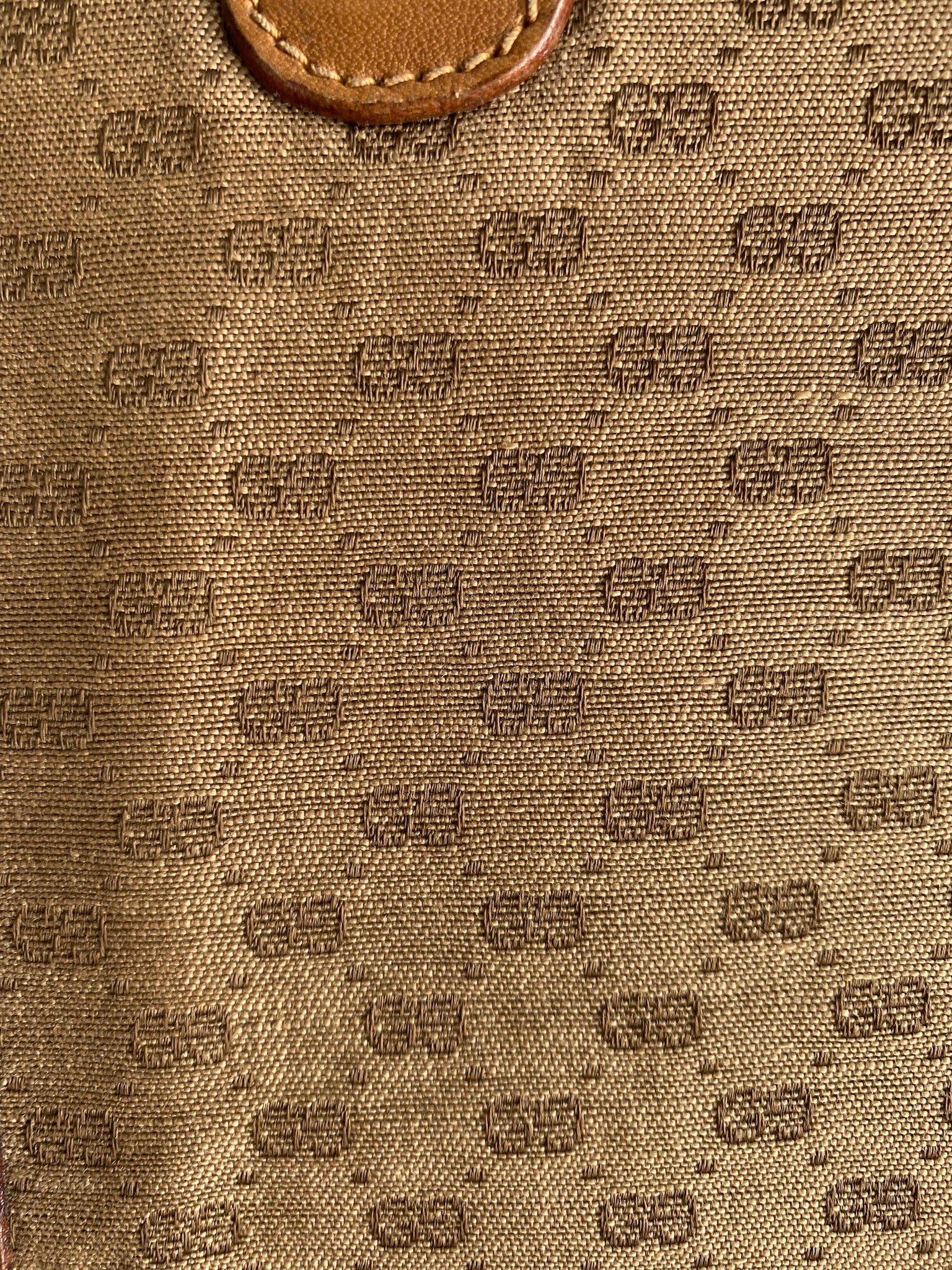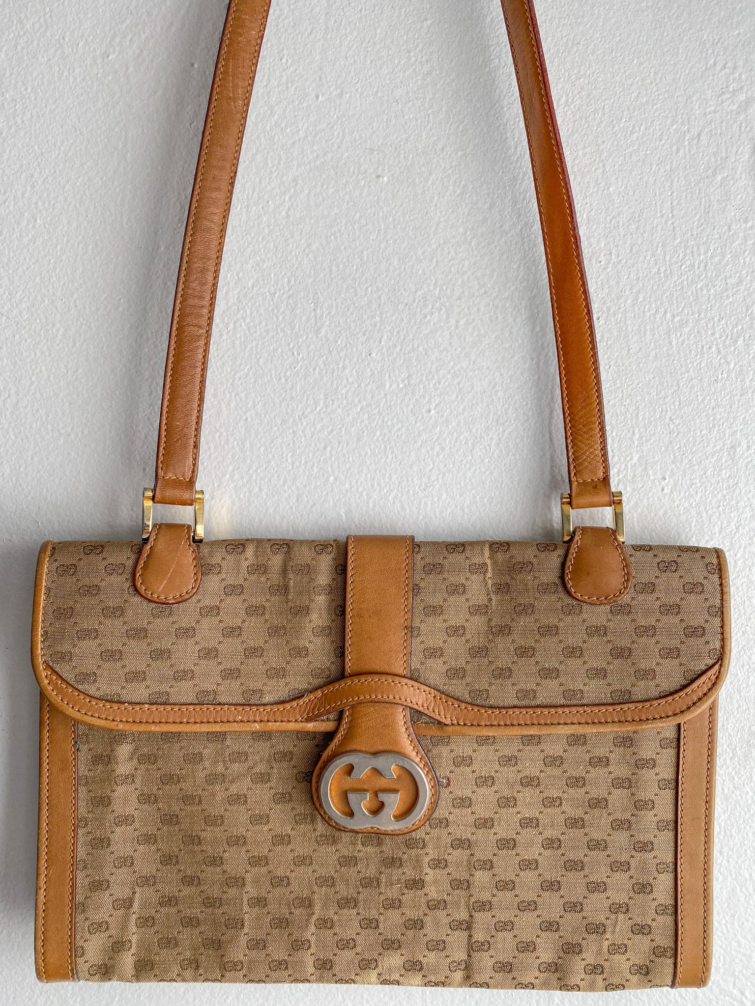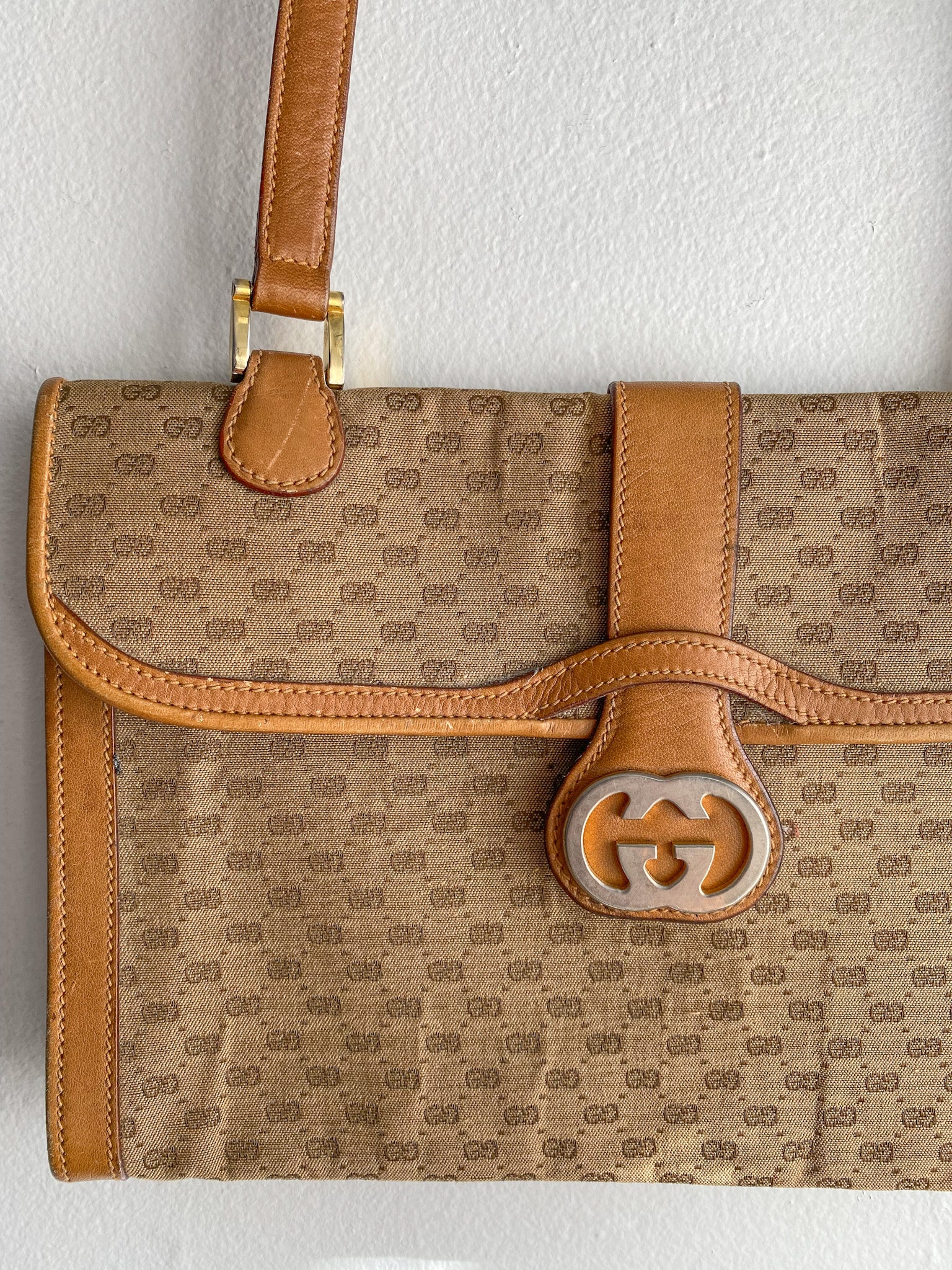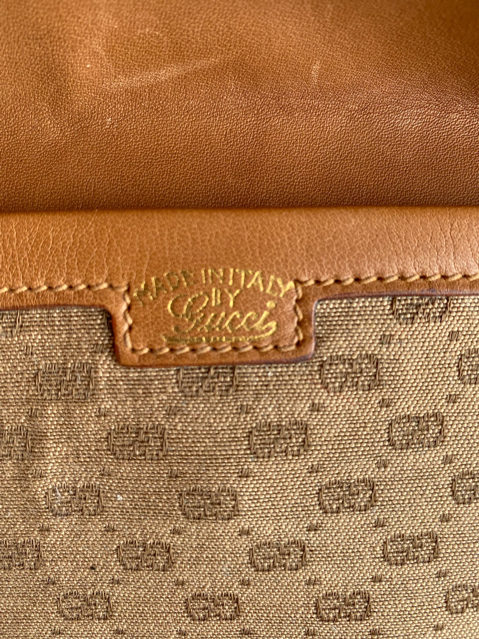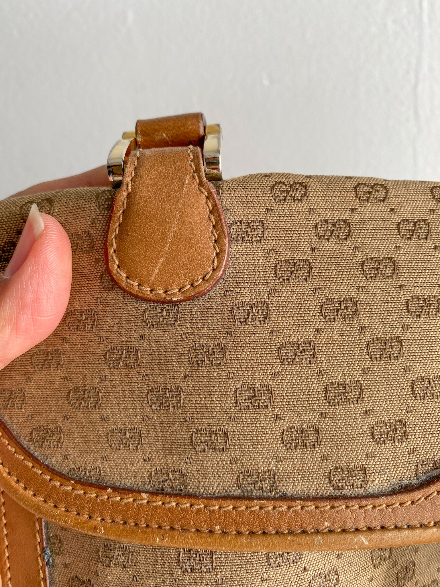 Light scuffs on the underside of flap and by handle seam and trims. Brass on the double G hardware is faded. Monogram fabric is loosely detached.