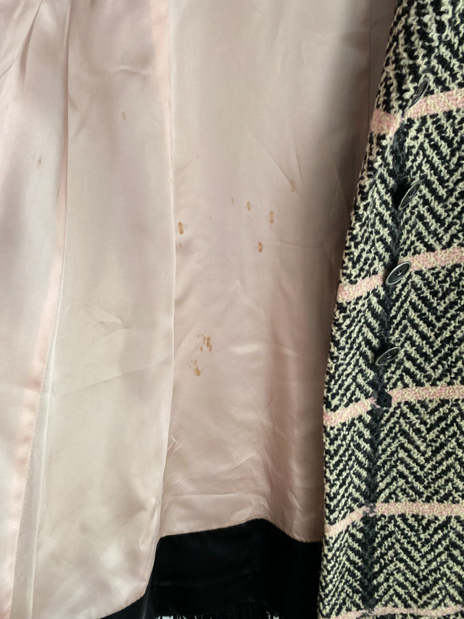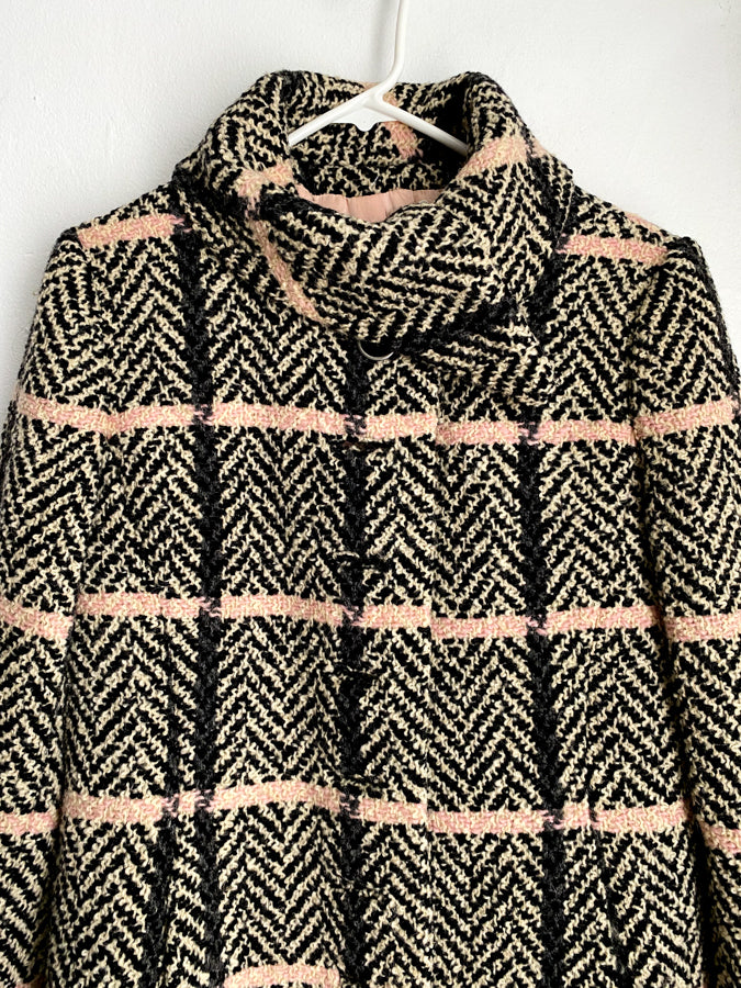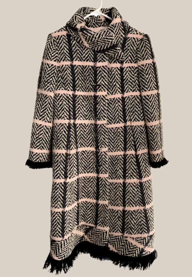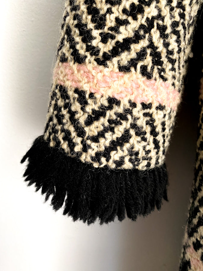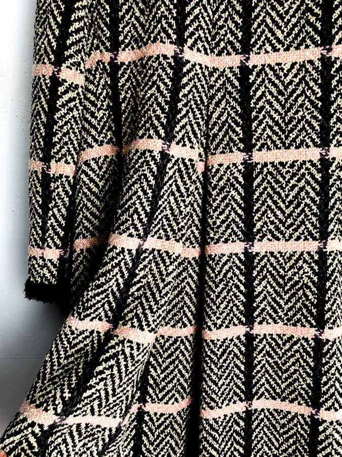 Black Pink Tweed Plaid Fringe Trapeze Coat