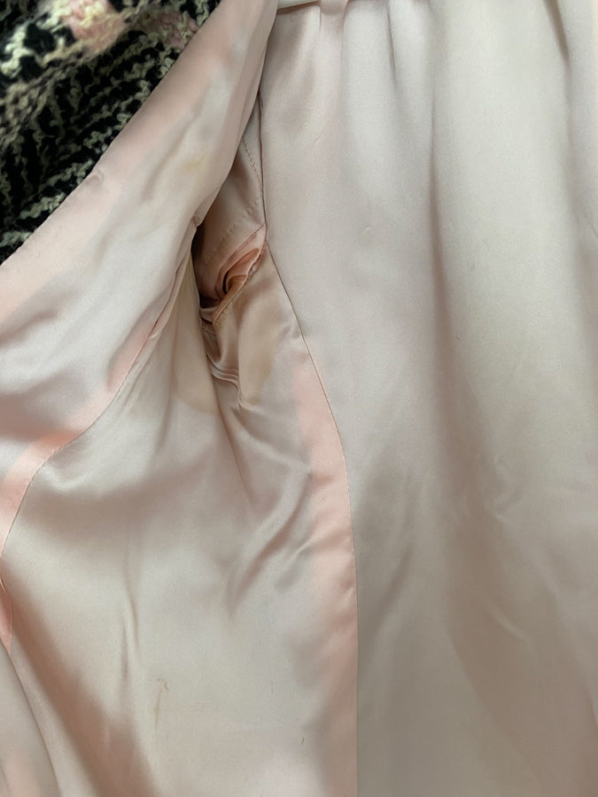 Gorgeous Chanel style tweed coat from around the late 1950s to early 60s. The coat has beautiful details like an inverted pleat on the back and trapeze, fringe on the sleeve cuffs and hemline. The collar is asymmetrical to create an interesting tall collar or angled flare when buttoned up. Pink lining with wear.