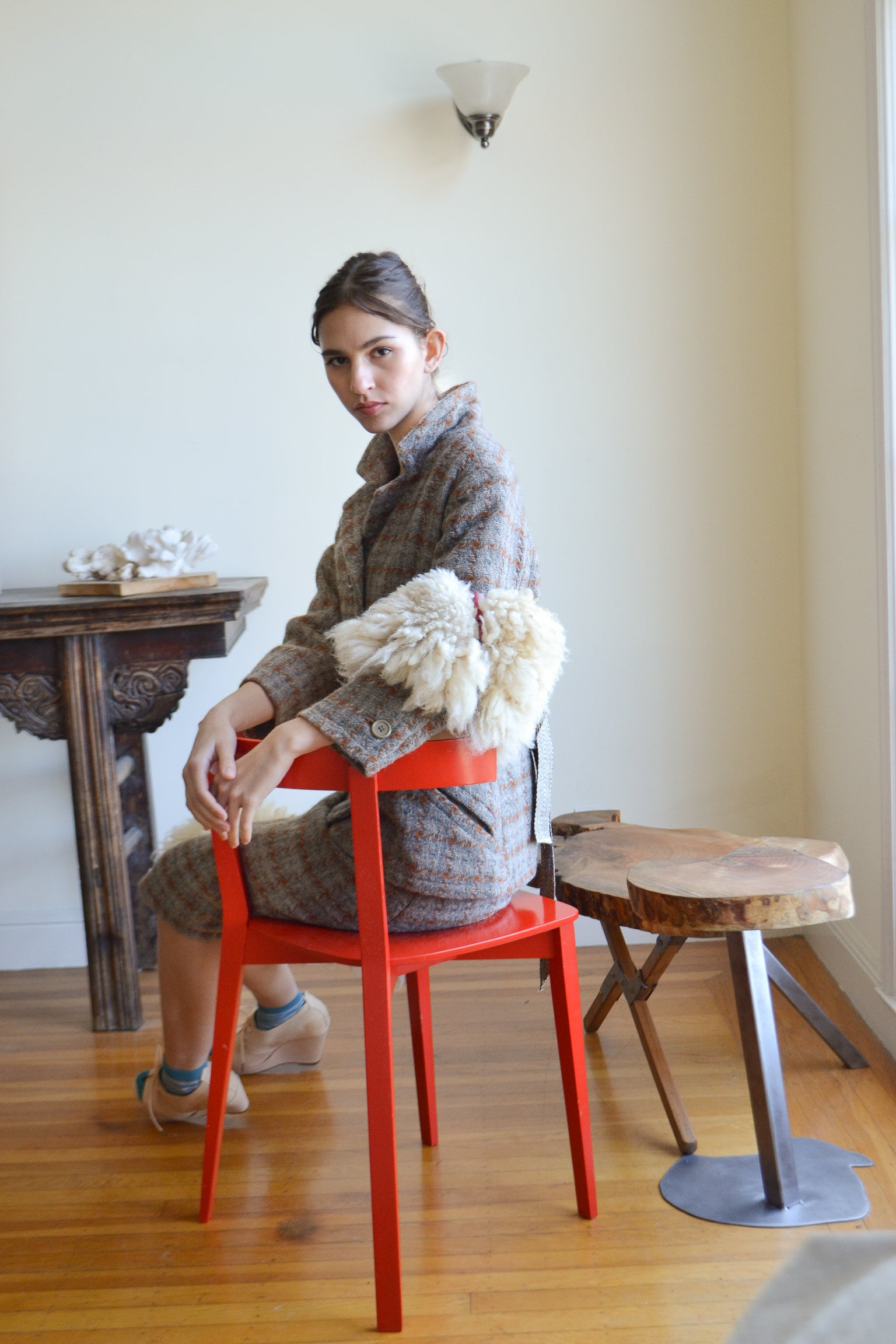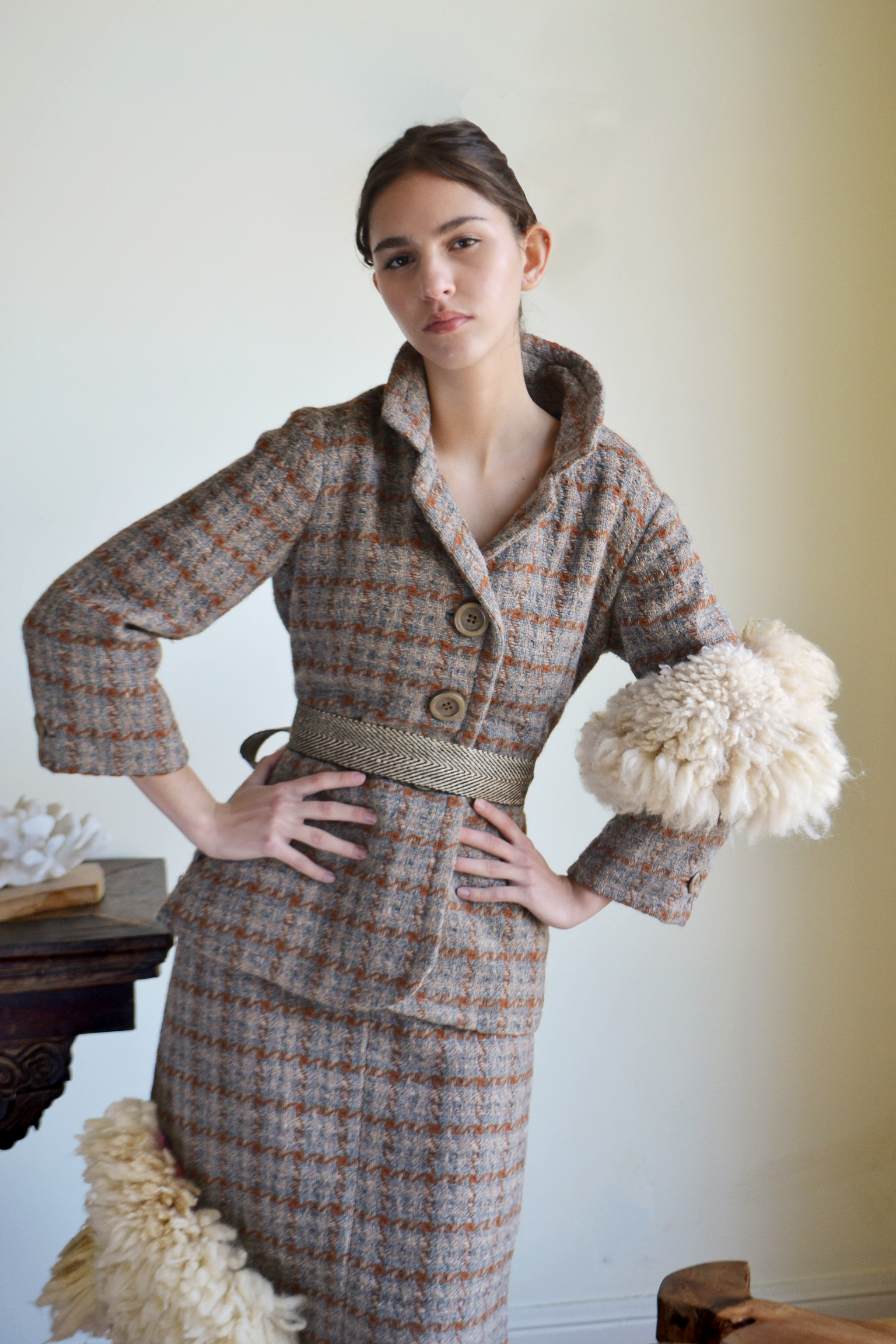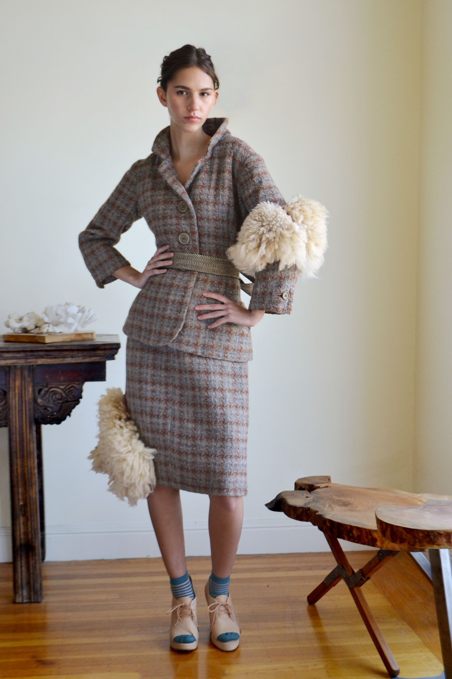 1950's Couture houndstooth wool jacket and skirt with Climate Beneficial™ shearling armband.