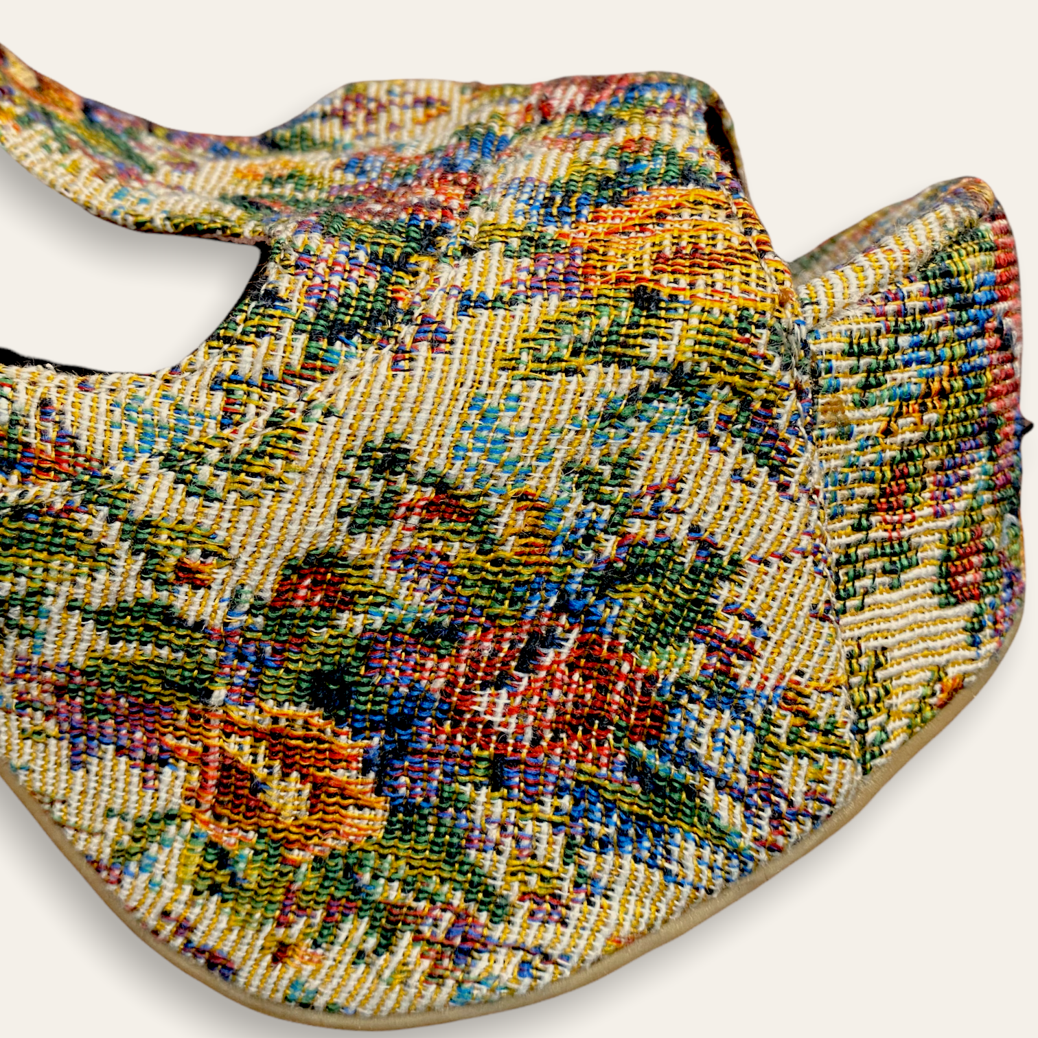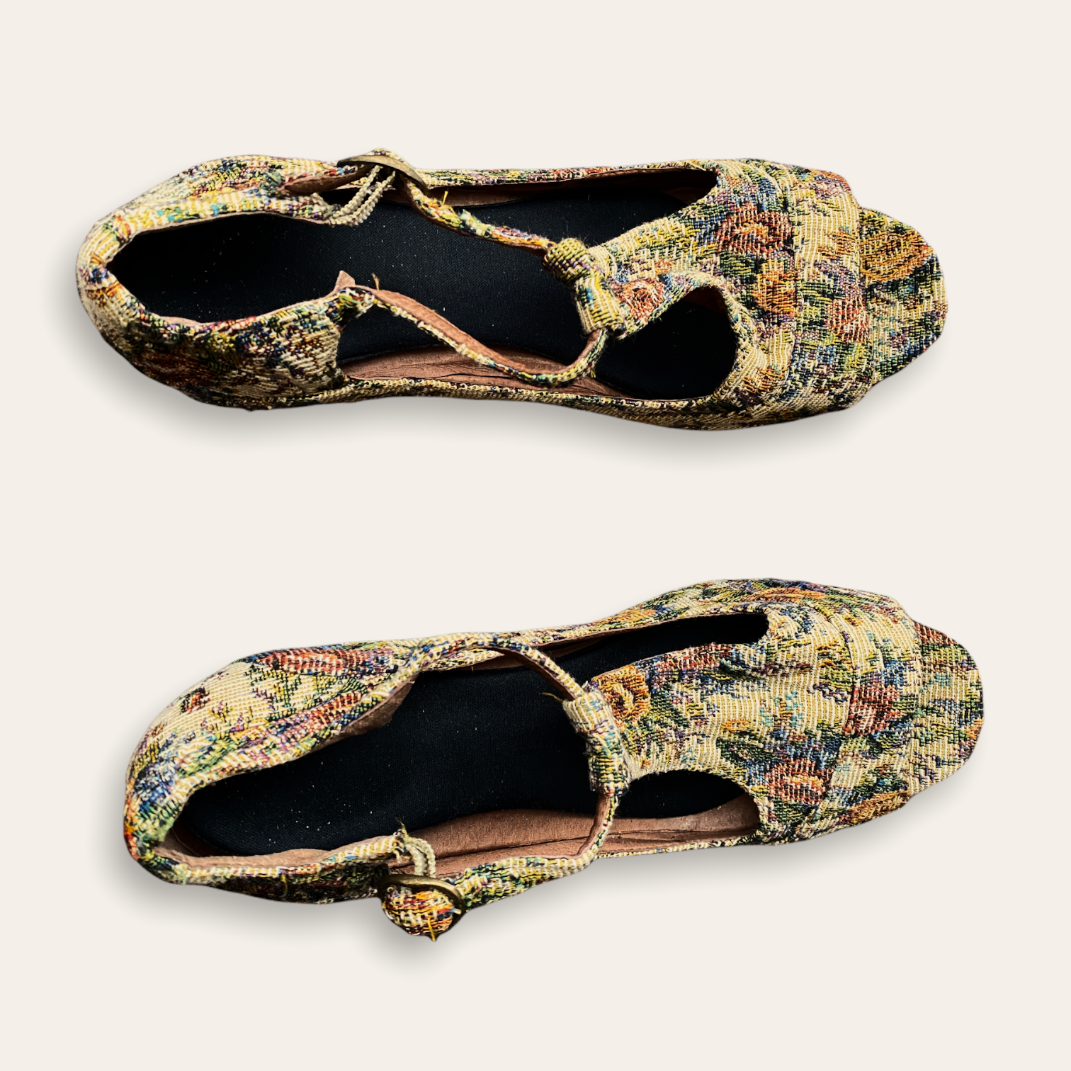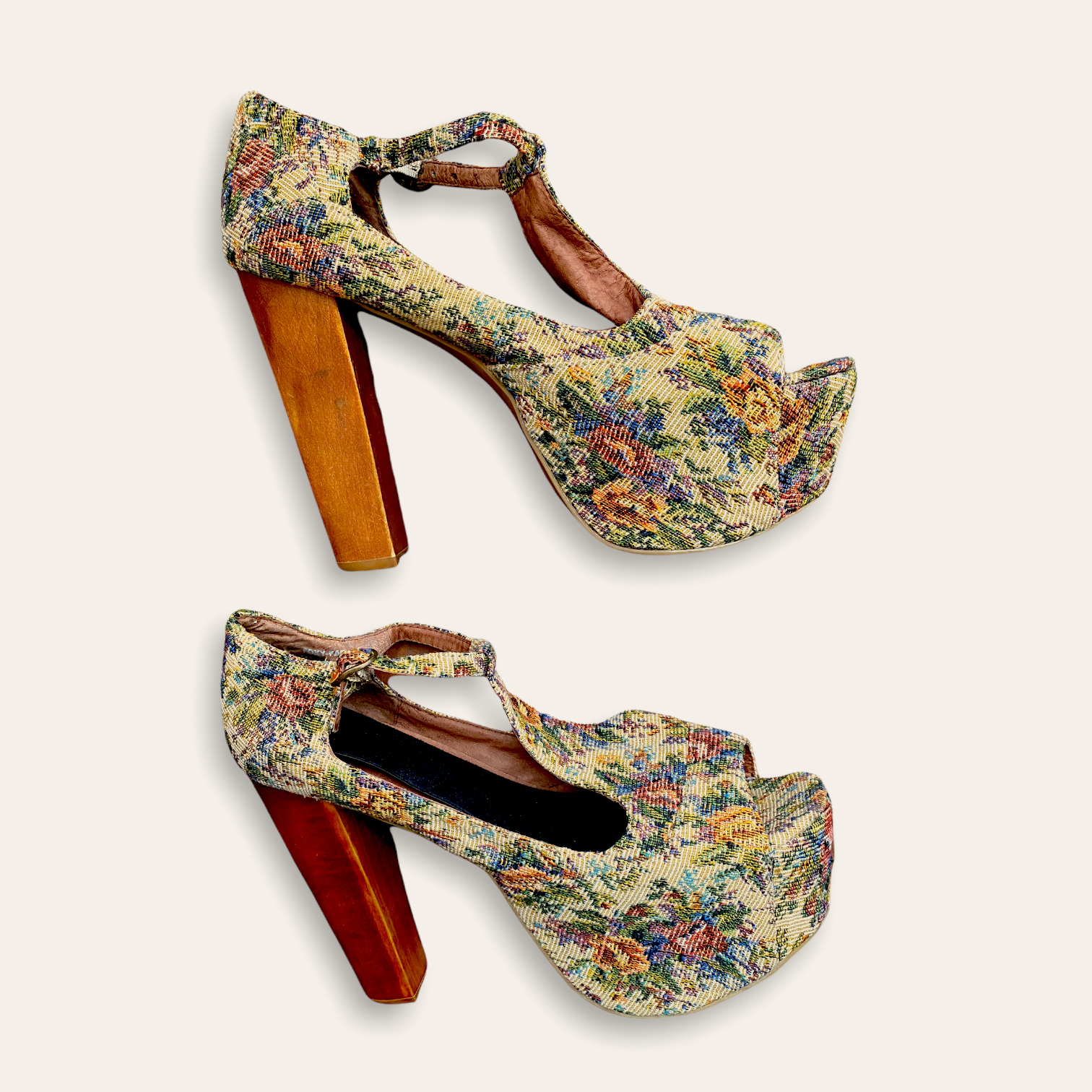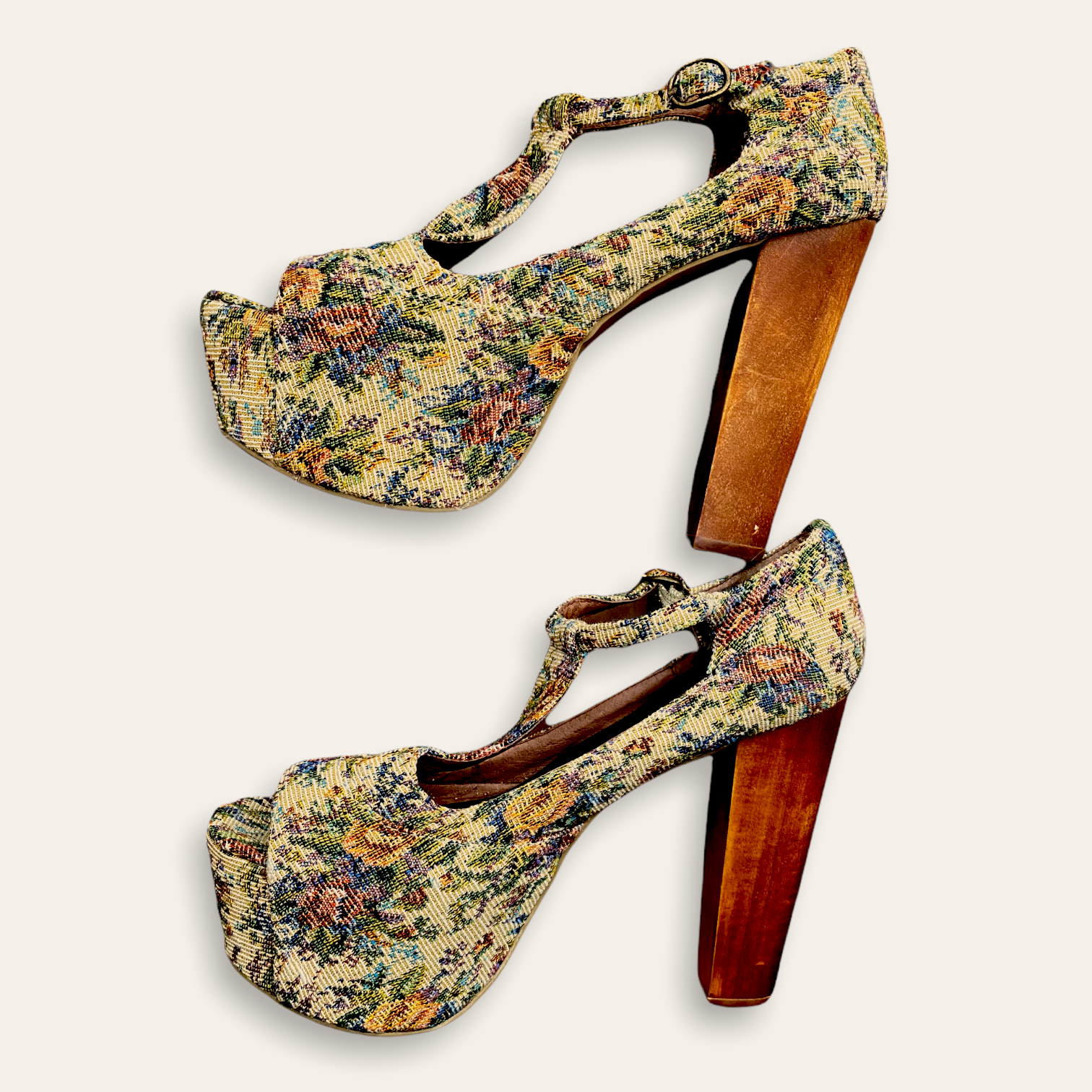 4" heels. 2" platforms. Vintage inspired cross-stitch fabric. Mary Jane style.