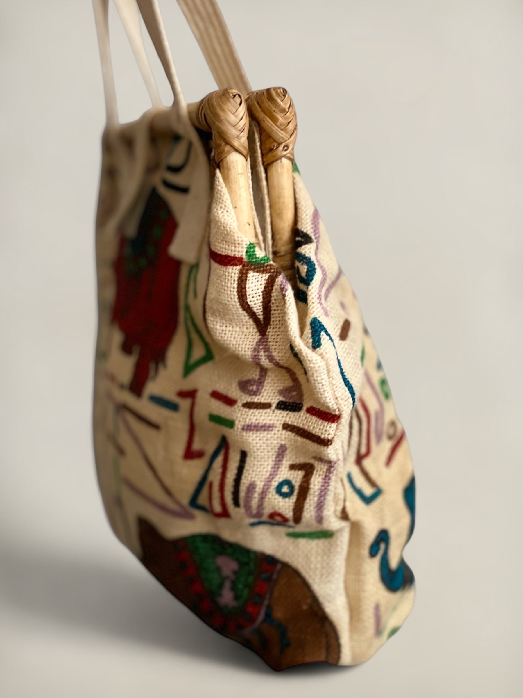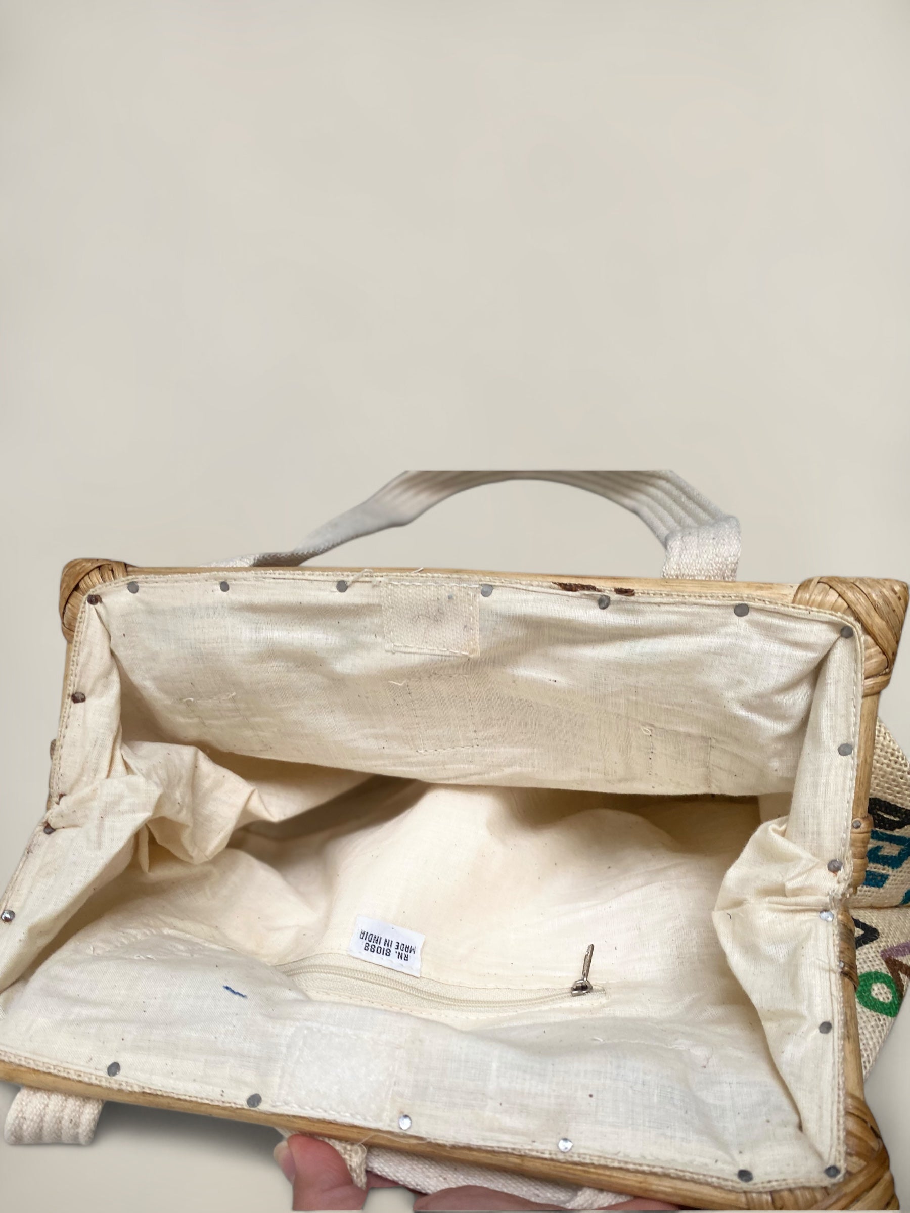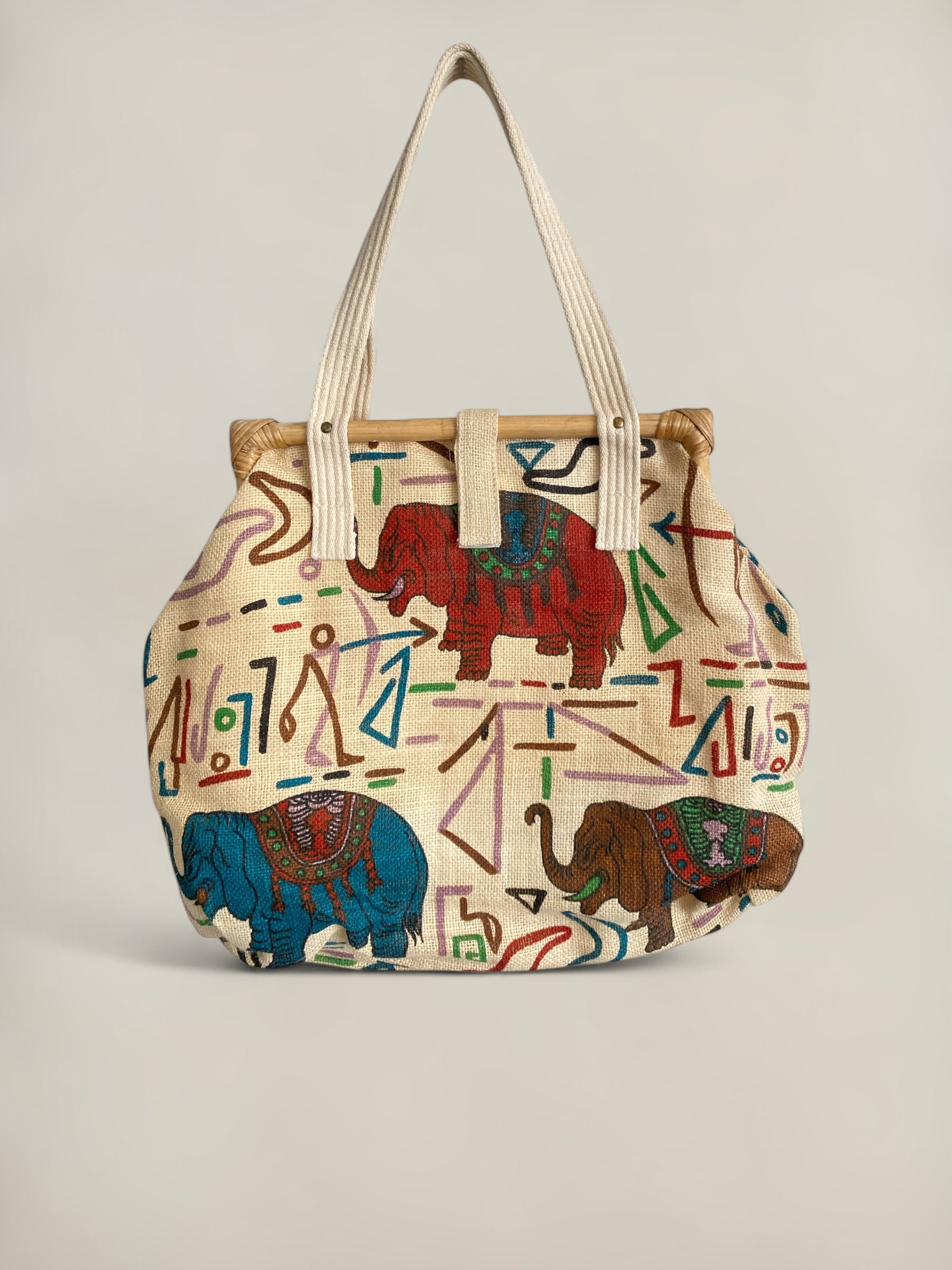 Fun boho bag made in India. Features prints of elephants and rattan to give structure at the open. Velcro closure.