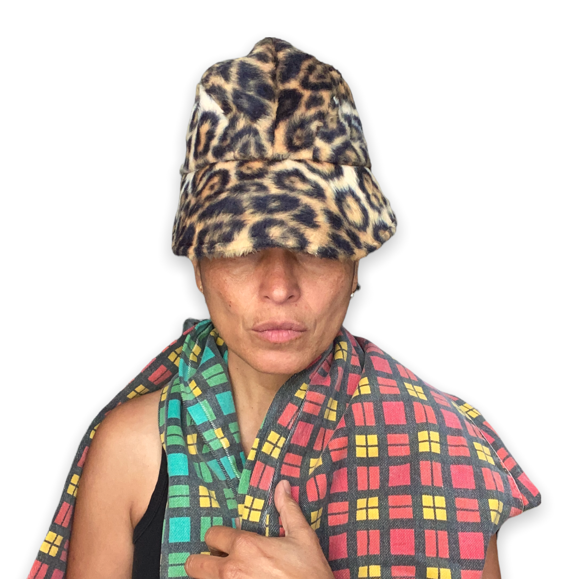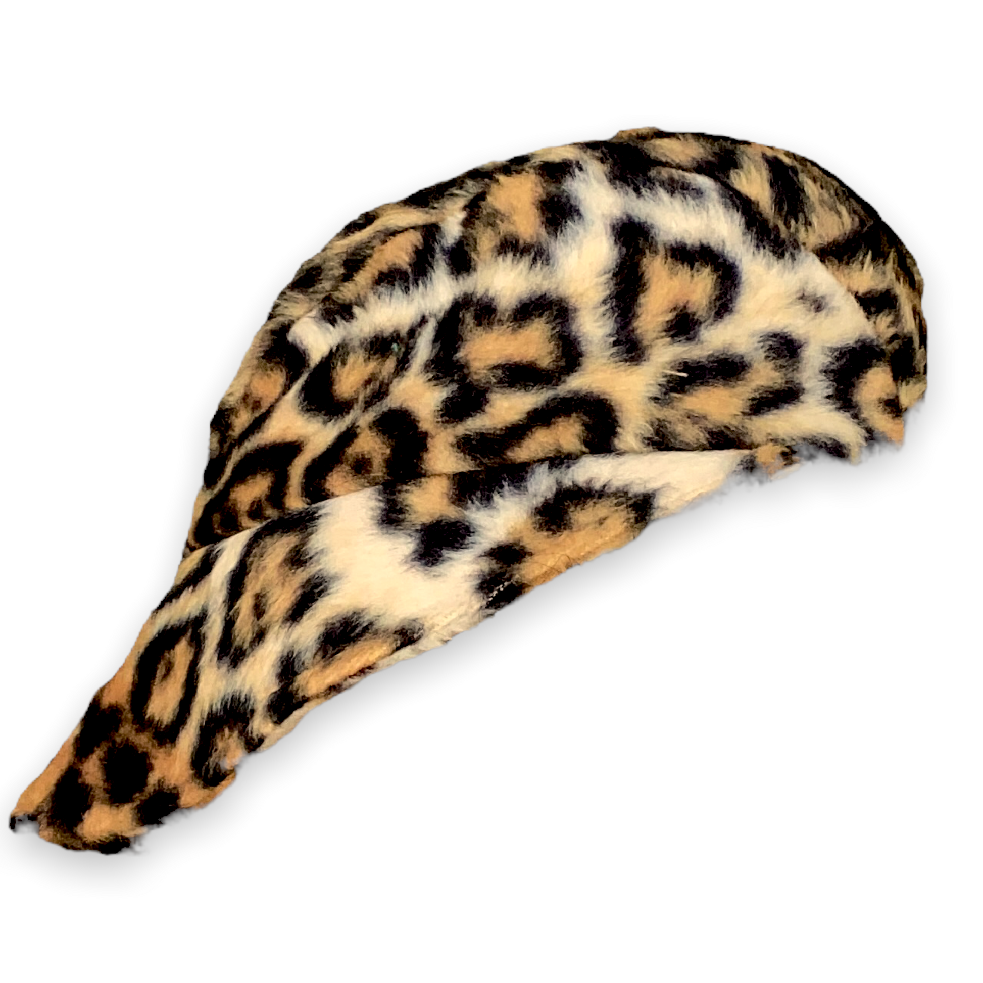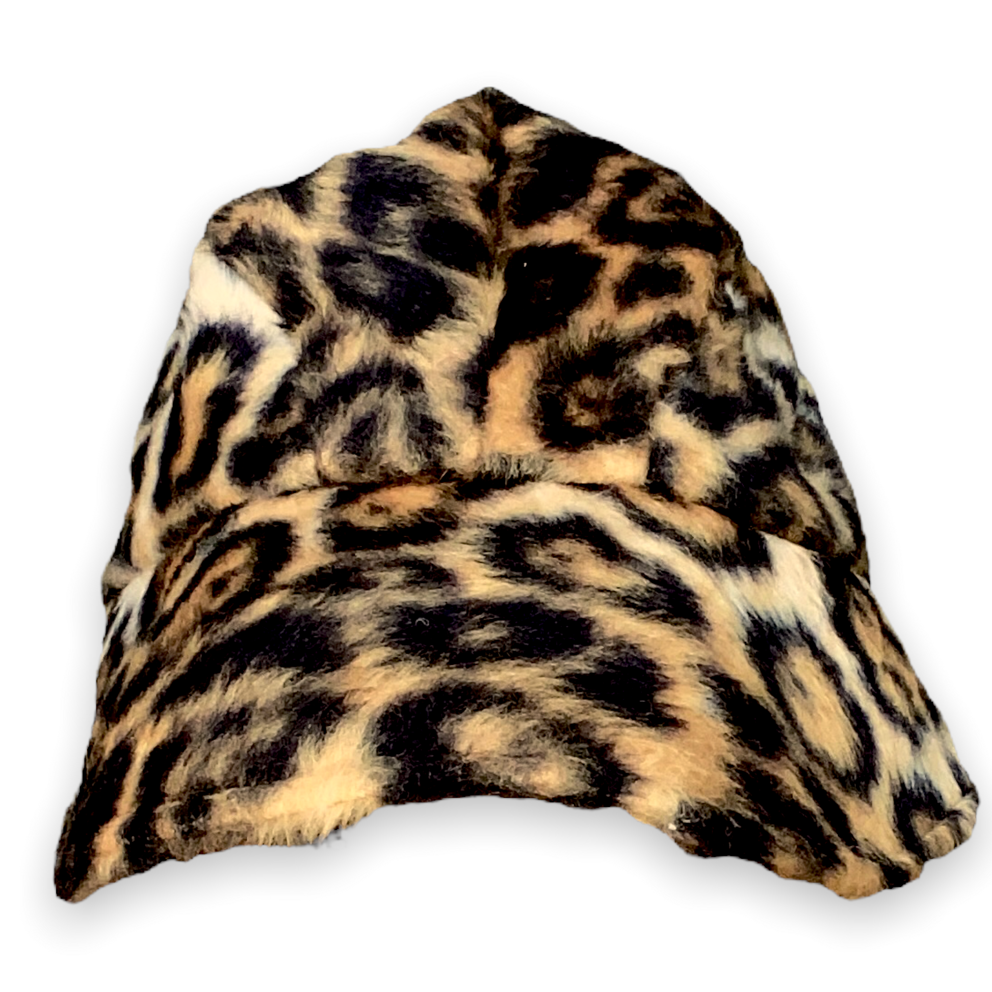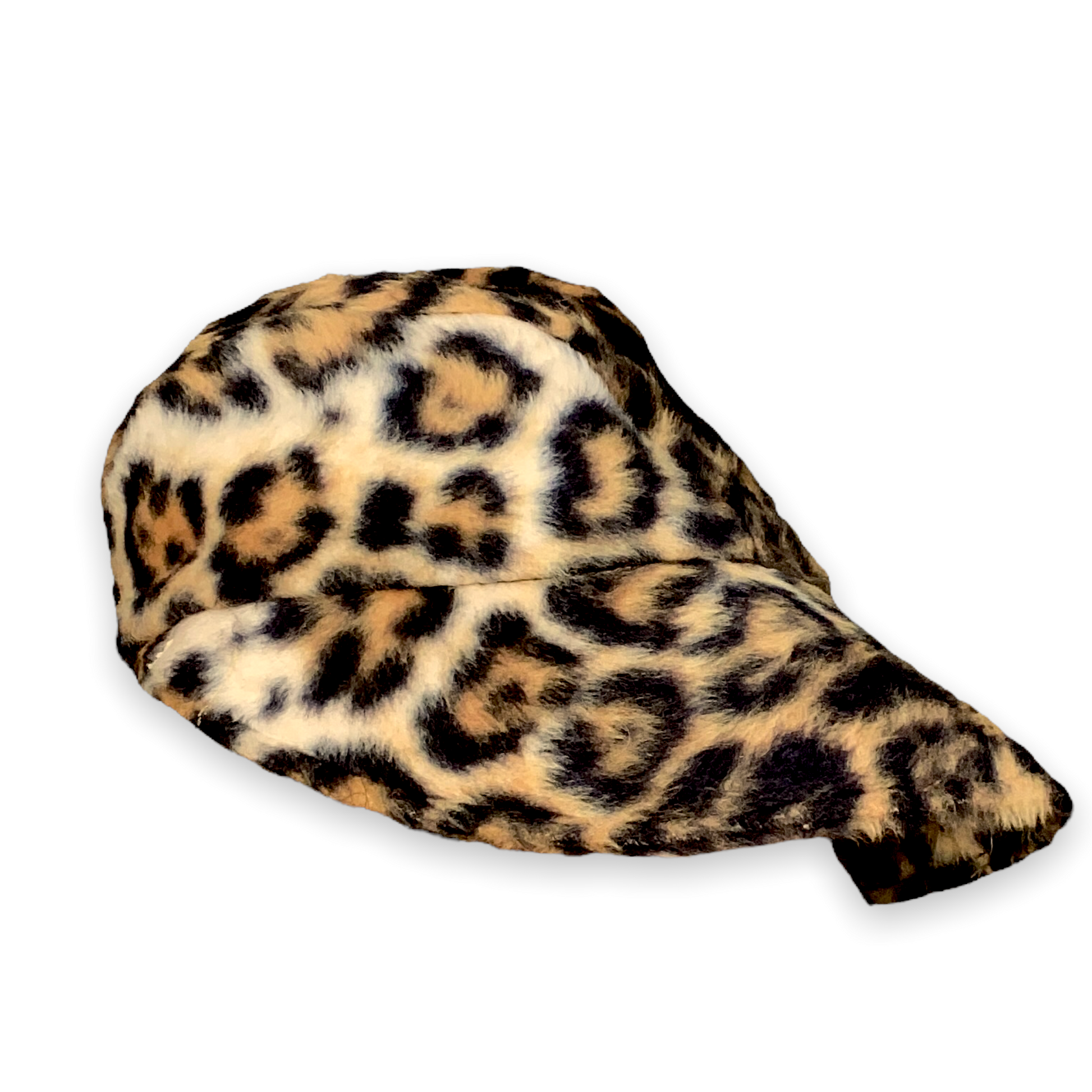 Has a visor effect. Shorter in the back with an extended bill. Faux fur
