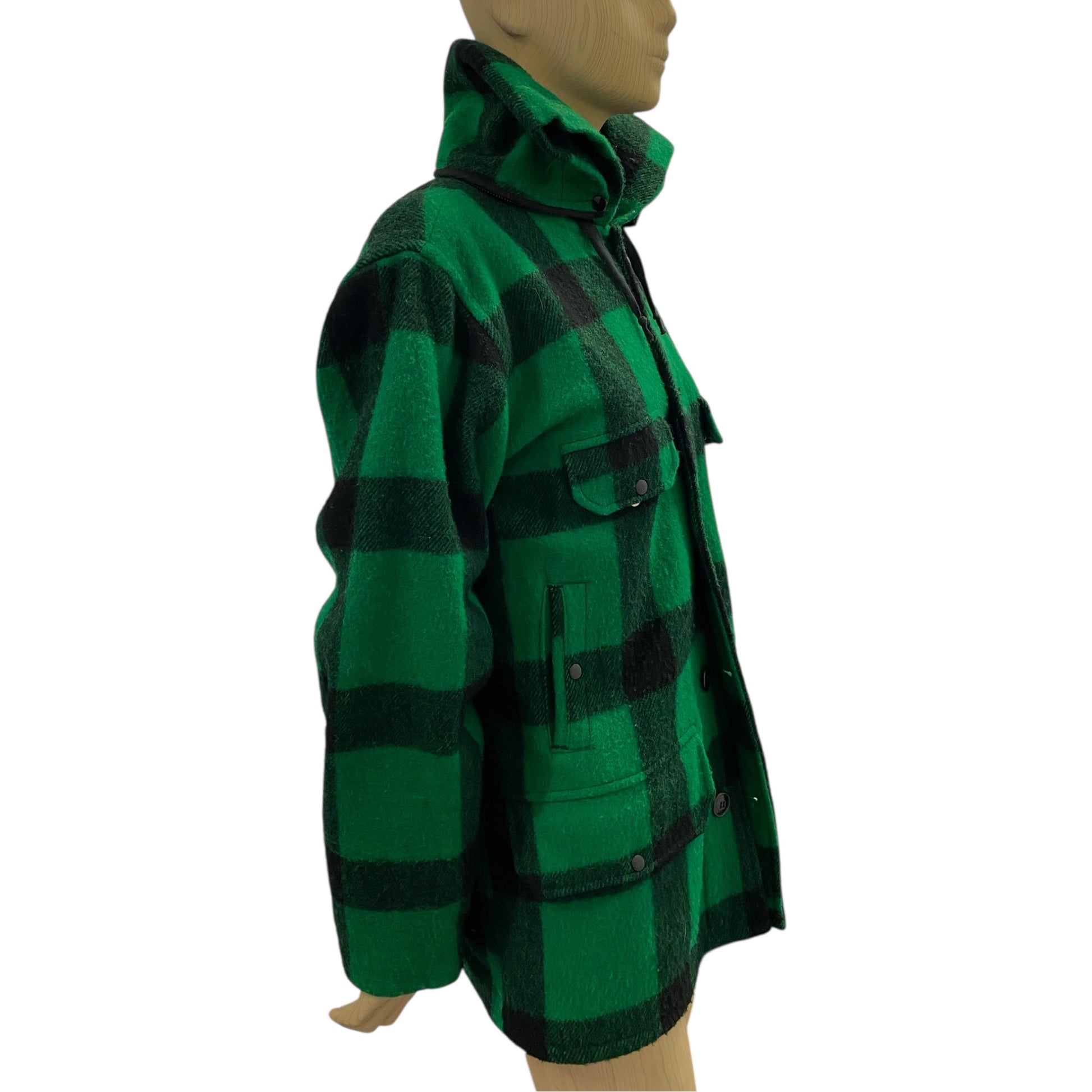 We love the details of this green black plaid lumberjack jacket. 4 front pockets. Versatile collar can be worn as a hood or unzipped to create a capelet like collar.