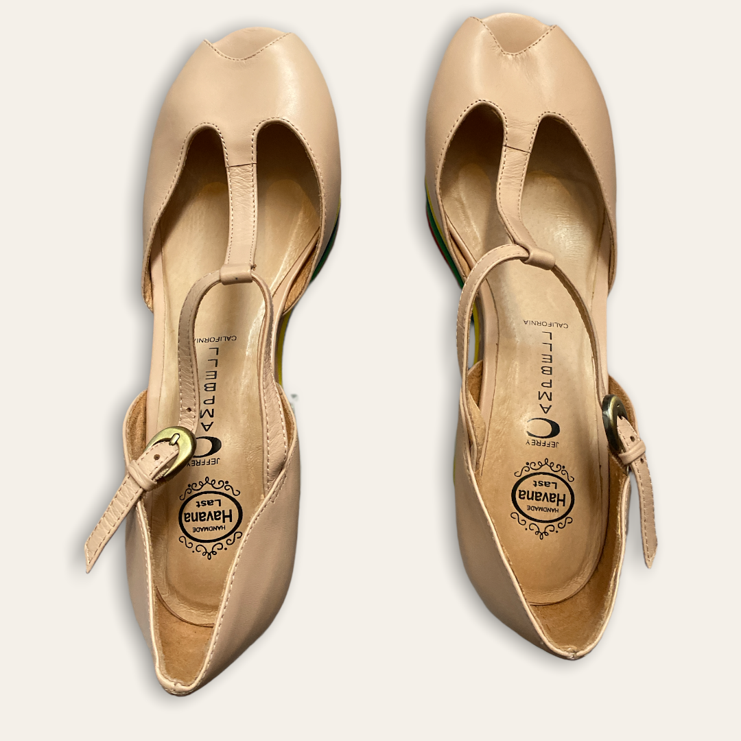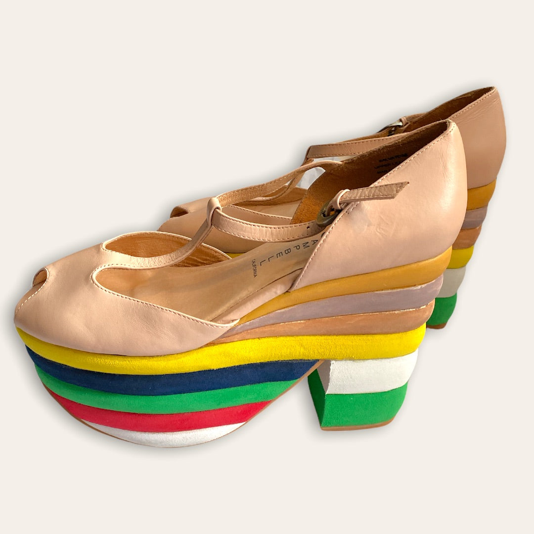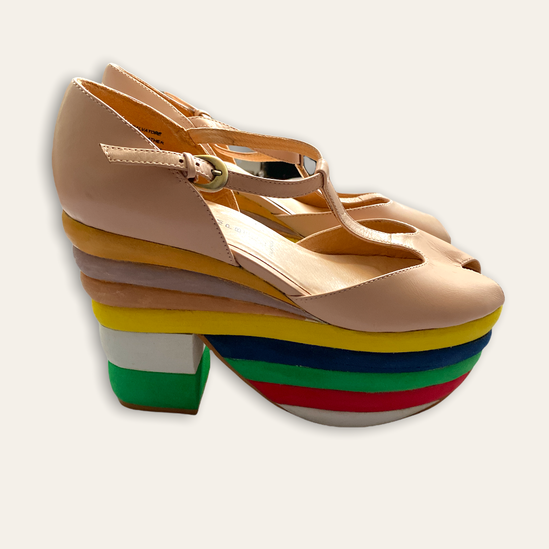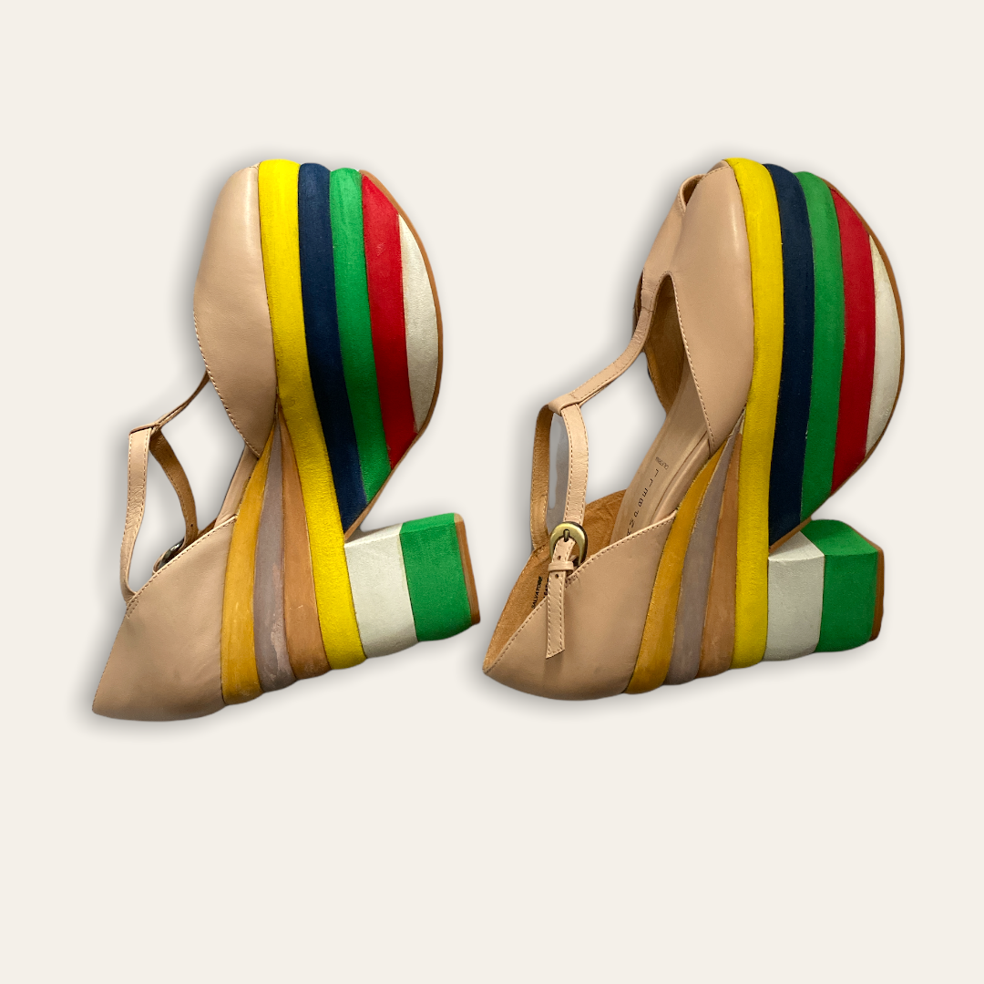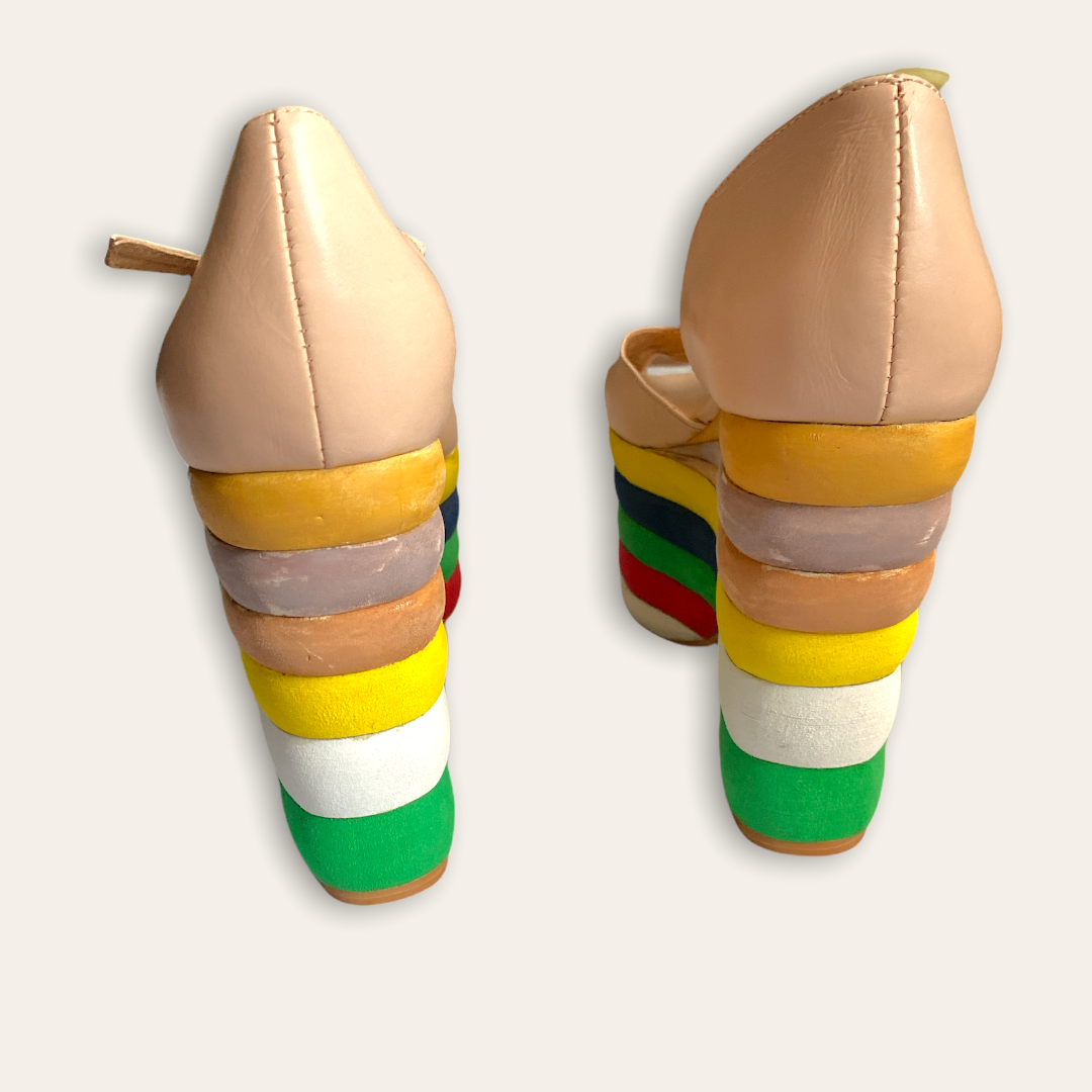 Inspired by Salvatore Ferragamo's 2010 revival of his iconic 1938 Rainbow shoe for Judy Garland, these elegant shoes showcase a rainbow-layered platform heel and a peep-toe silhouette, expertly crafted from tan leather for a refined look.