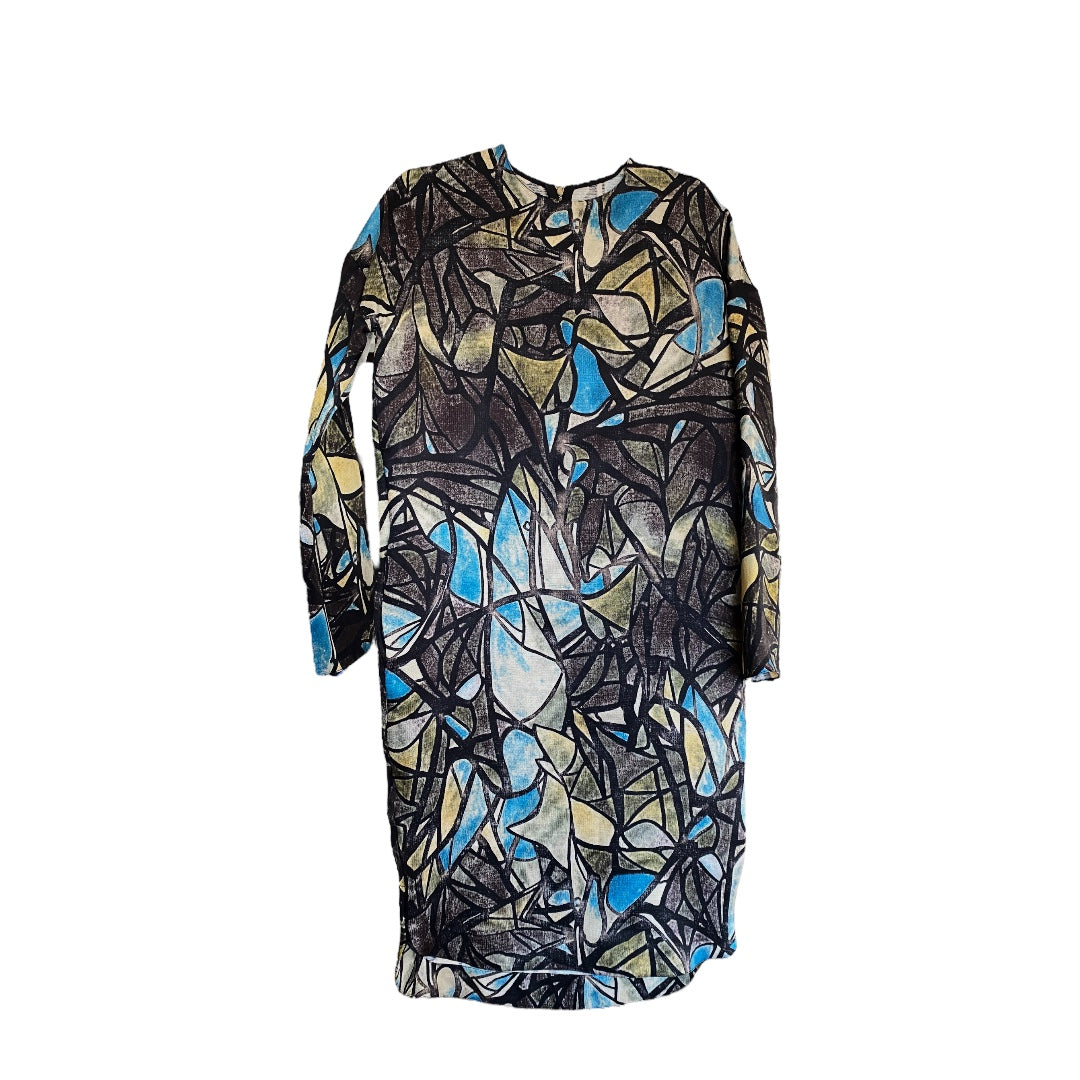 This Marni dress features a captivating print along with a unique silhouette. The minimalist cocoon cut, complemented by an asymmetrical hemline, creates a striking visual when worn. Narrows at the hemline.