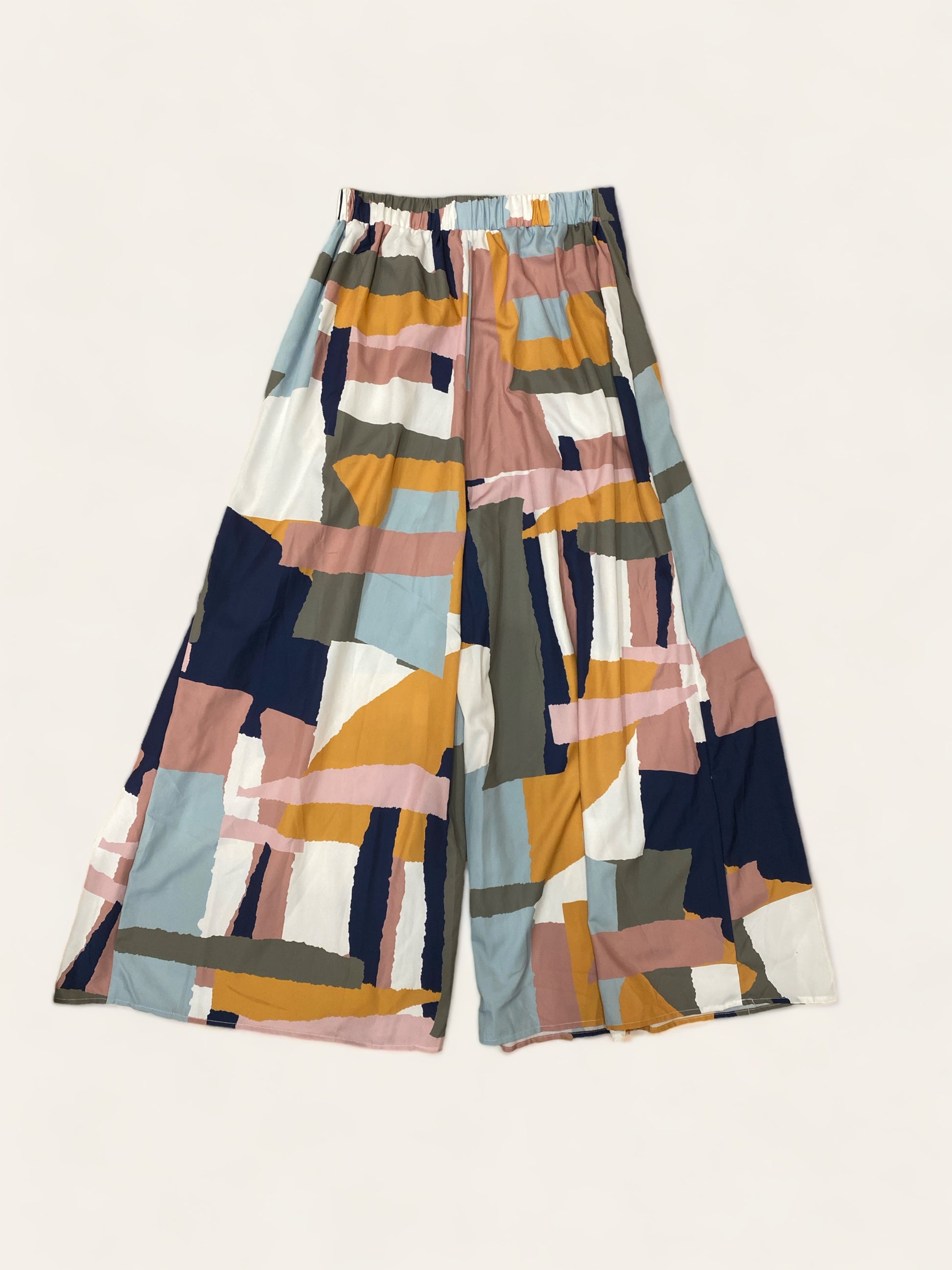 Fun print. Long inverted pleats. Palazzo style. Semi elastic waist