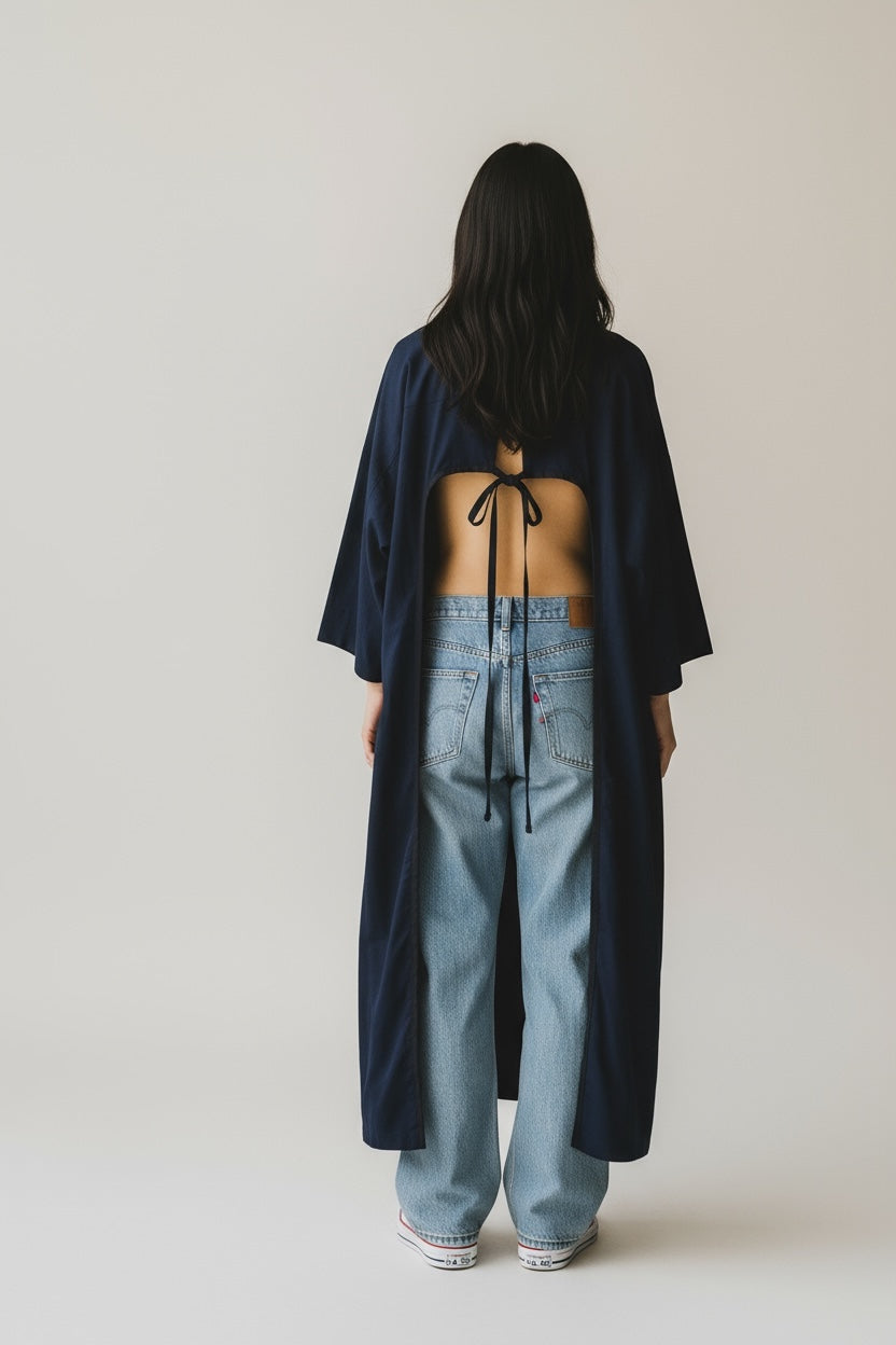 Captivating design made by hand by “Ann Lee”. Ties in the back and has a Velcro strap in the upper back for reinforcement. Off center cloth knotted buttons on the back. This could be worn as a dress with an open back or as an interesting layering piece perfect for autumn winter.