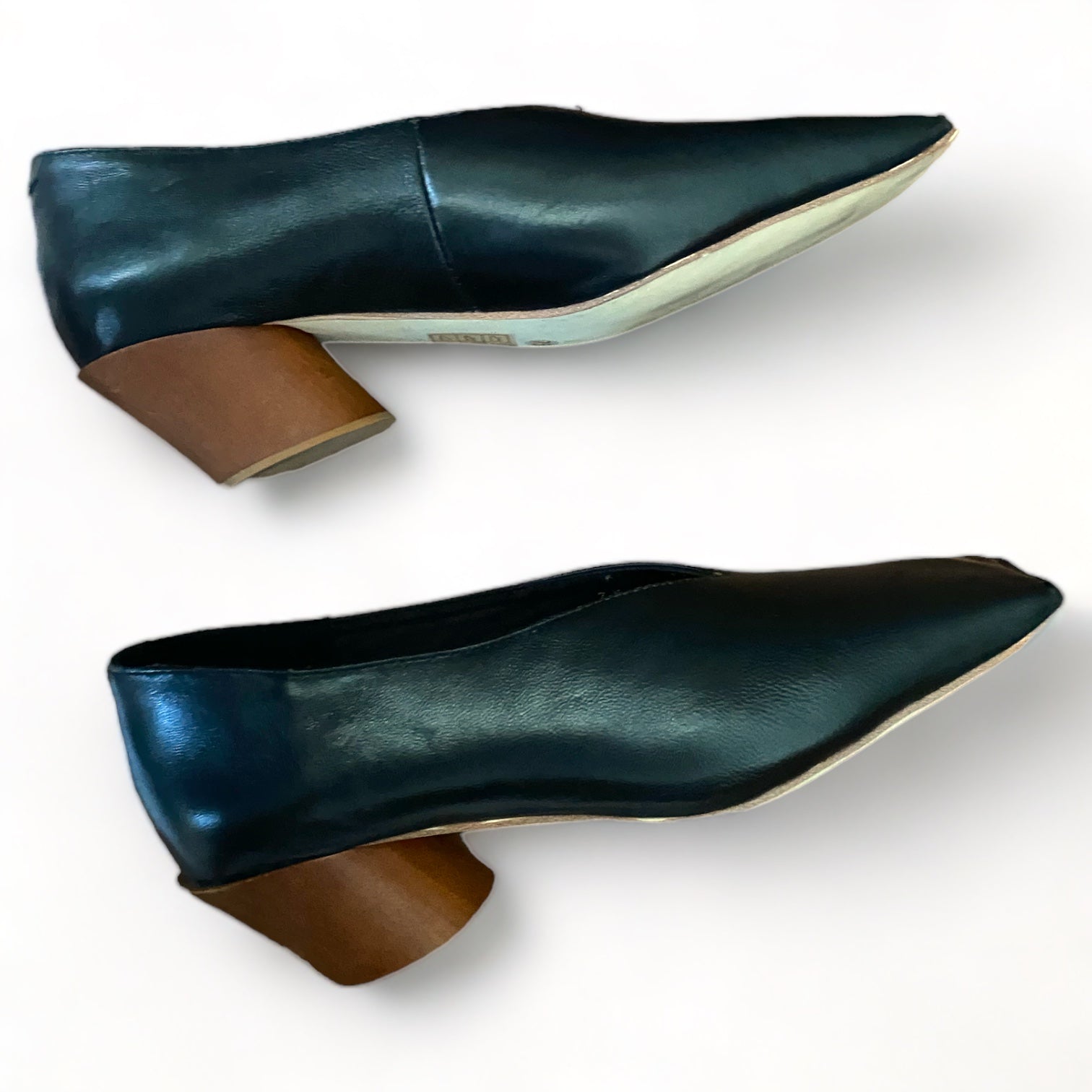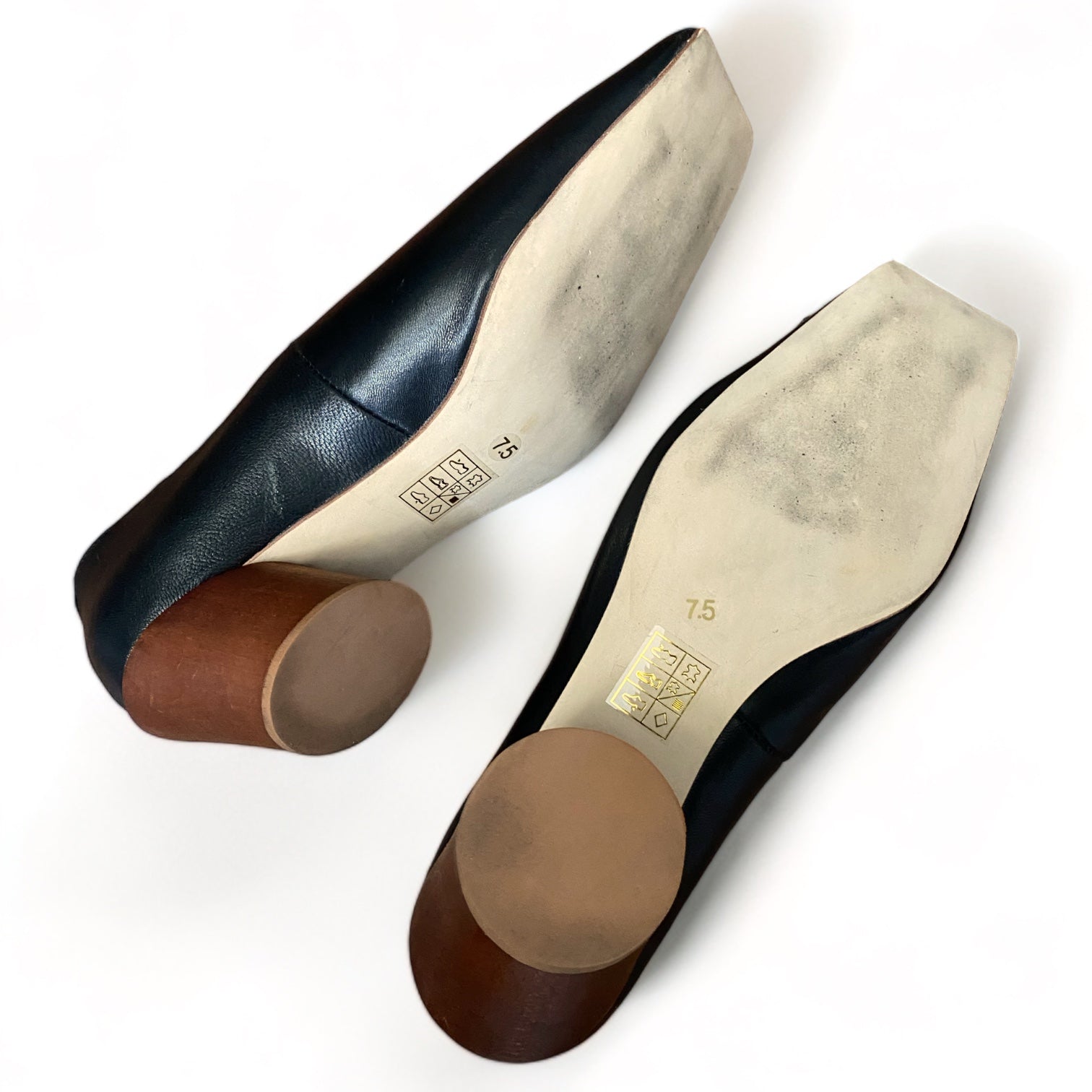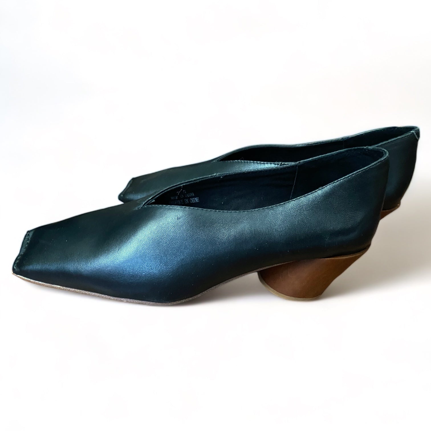 Square toe. Slanted wooden heel. Deep V vamp. The perfect shoe for office attire or casual outfits.