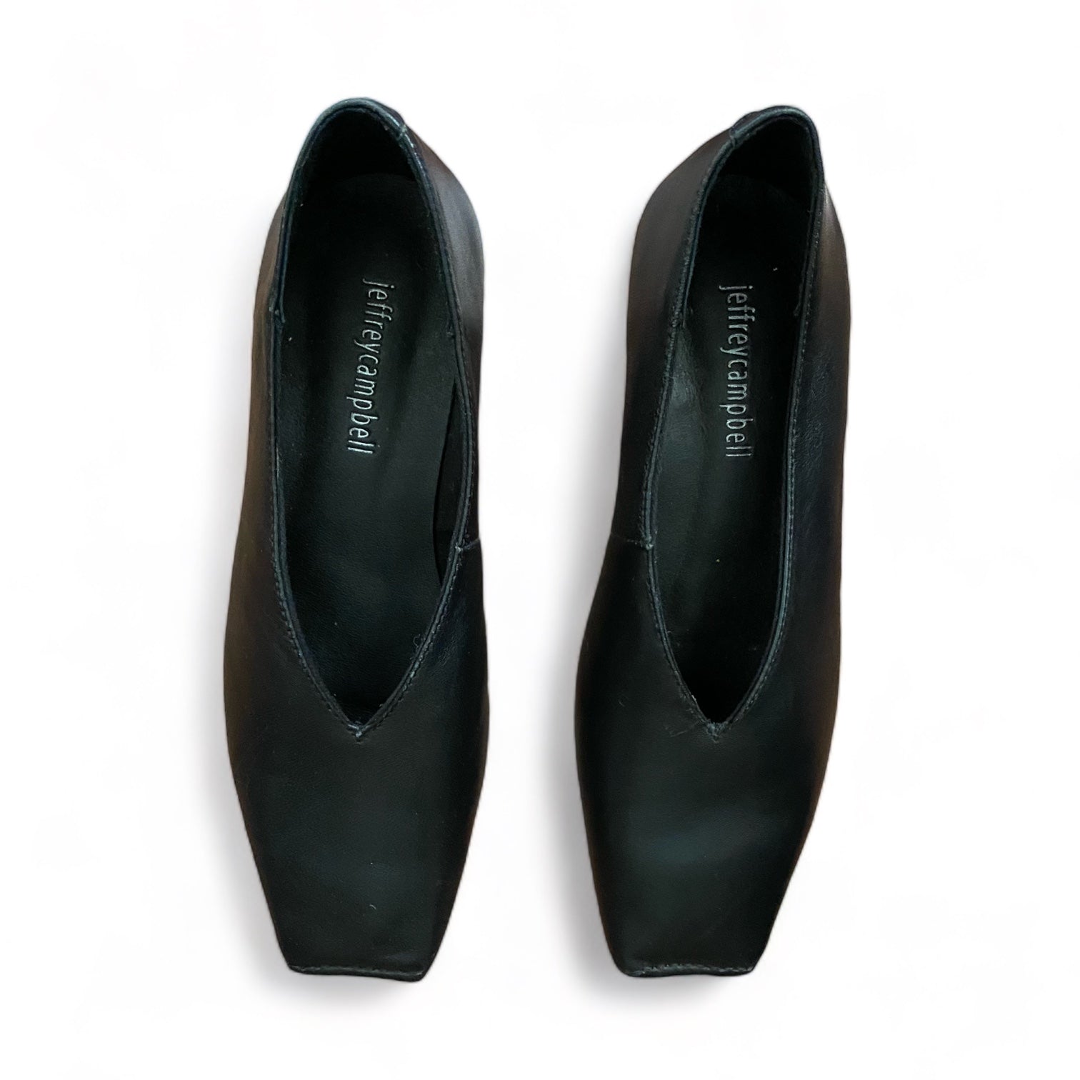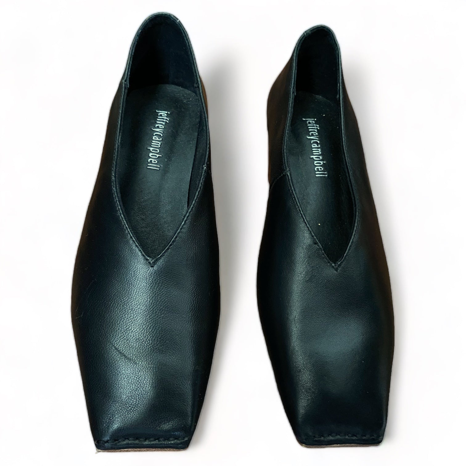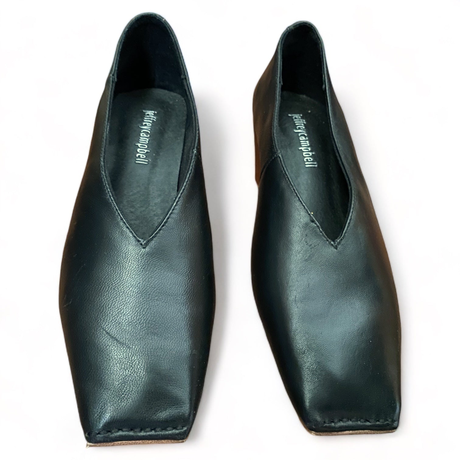 Square toe. Slanted wooden heel. Deep V vamp. The perfect shoe for office attire or casual outfits.