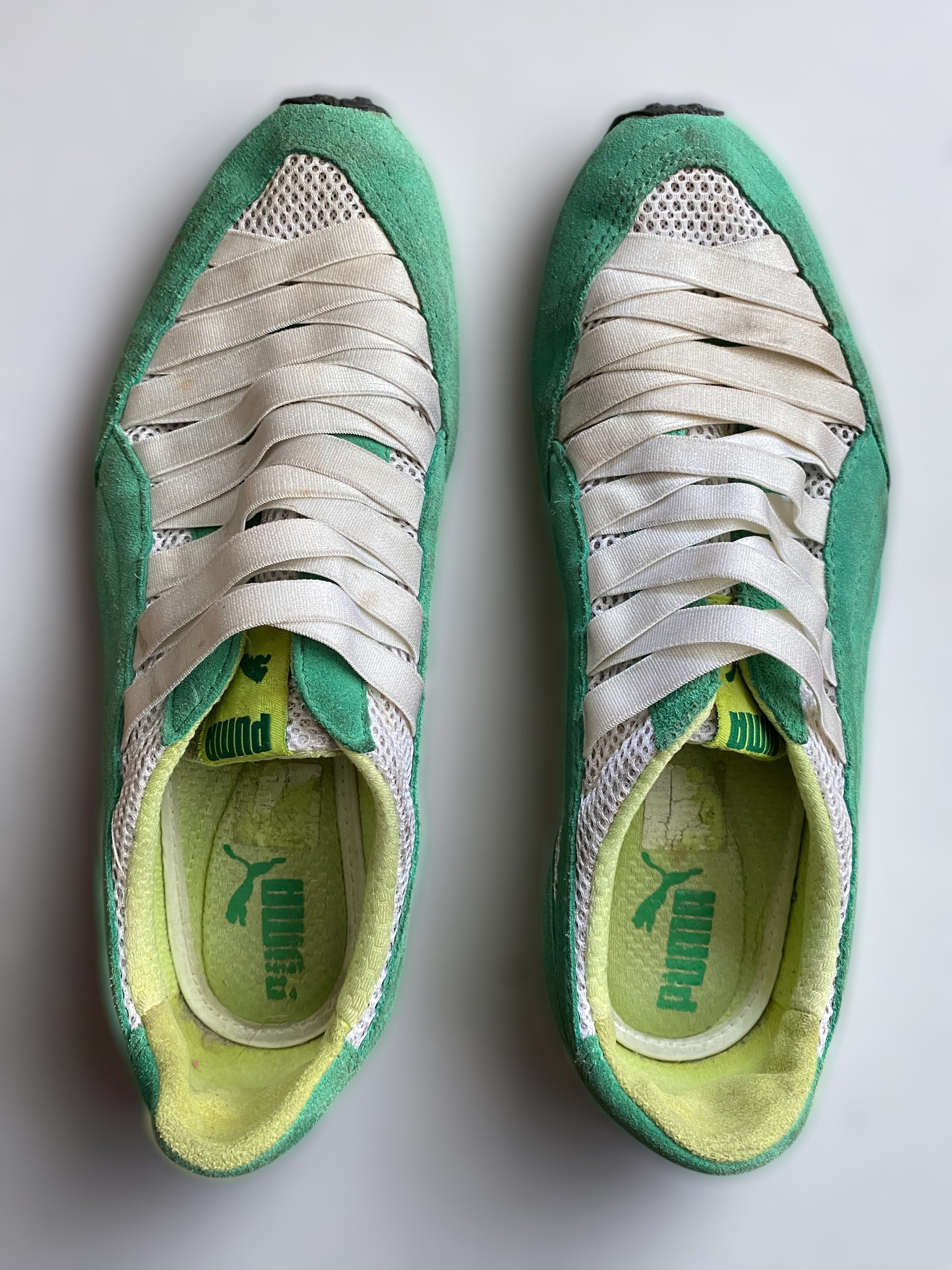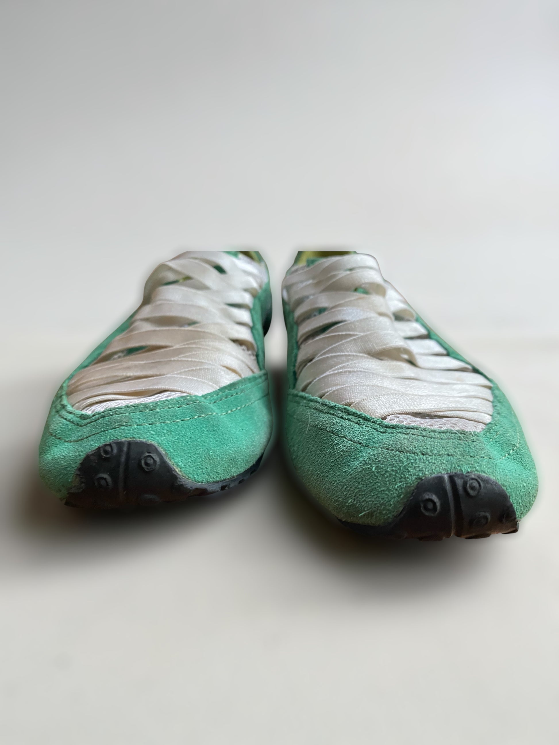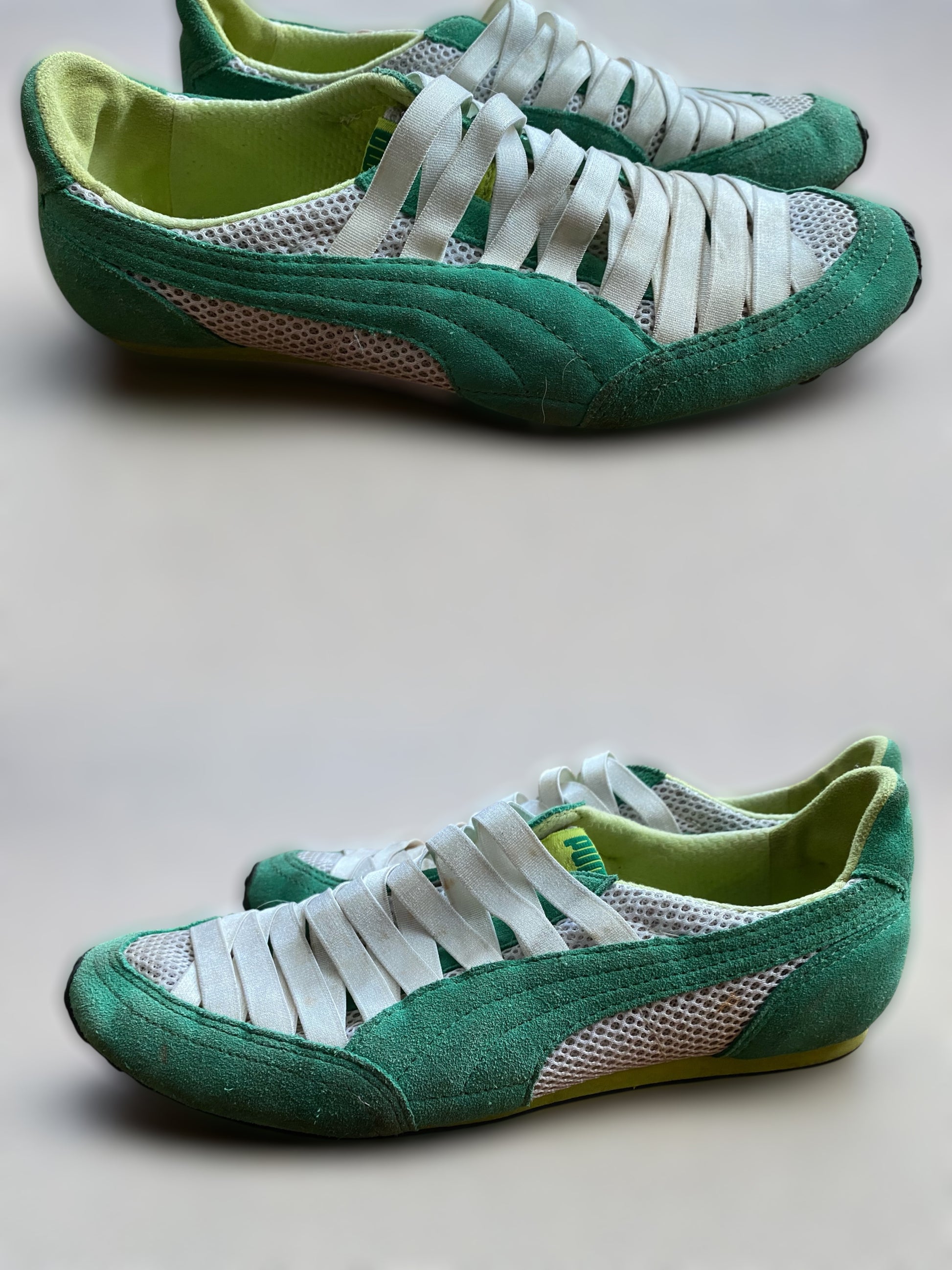 Circa 2010. Women’s sneakers green white color way. Features attached crisscross elastic laces over a mesh vamp. Flat slip-on