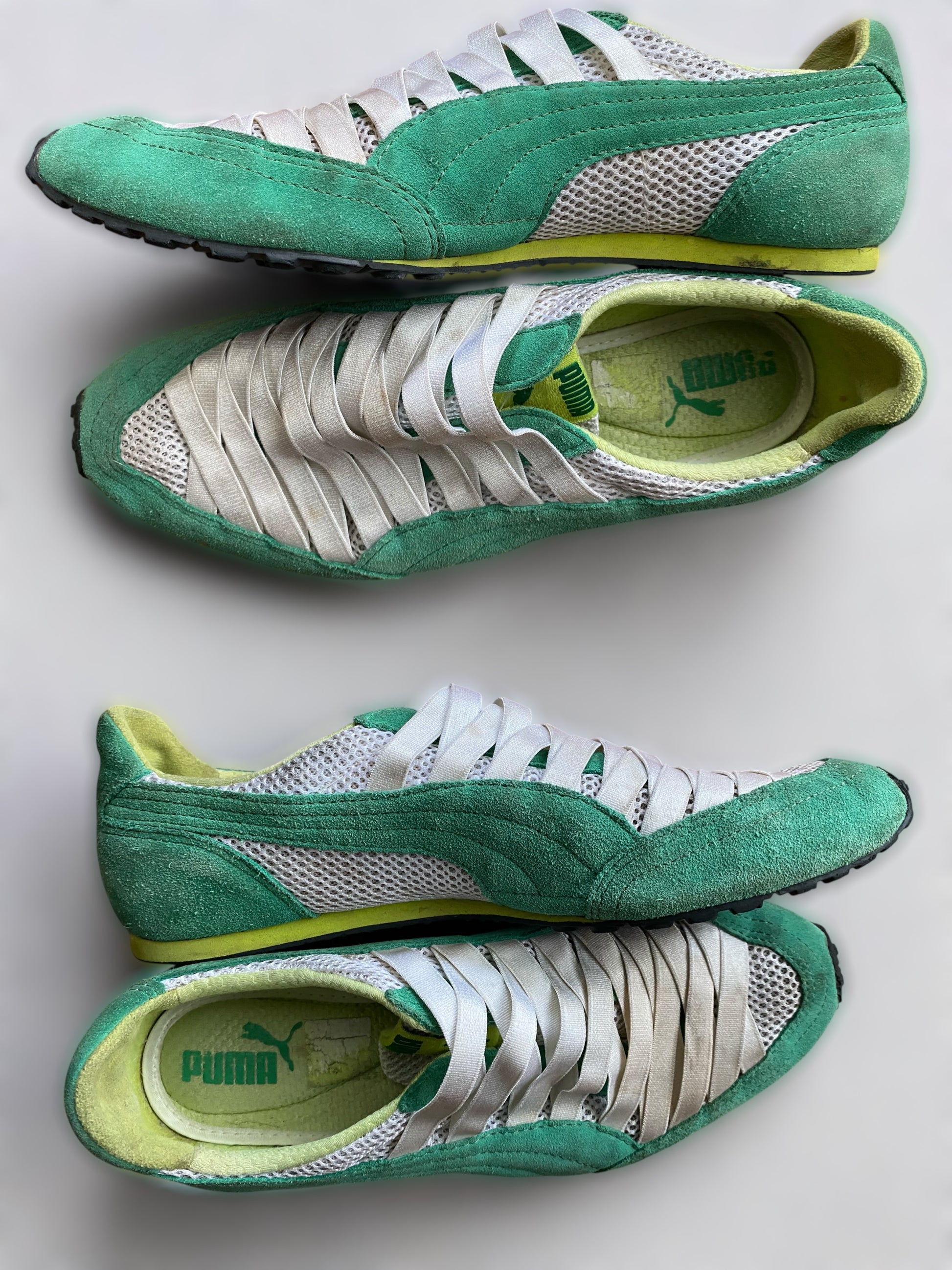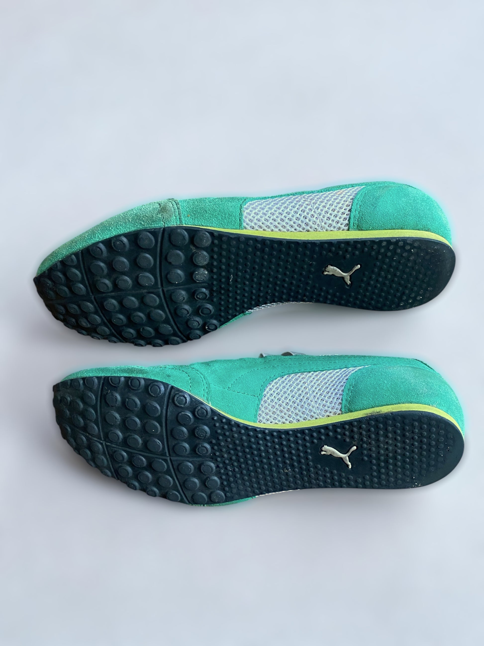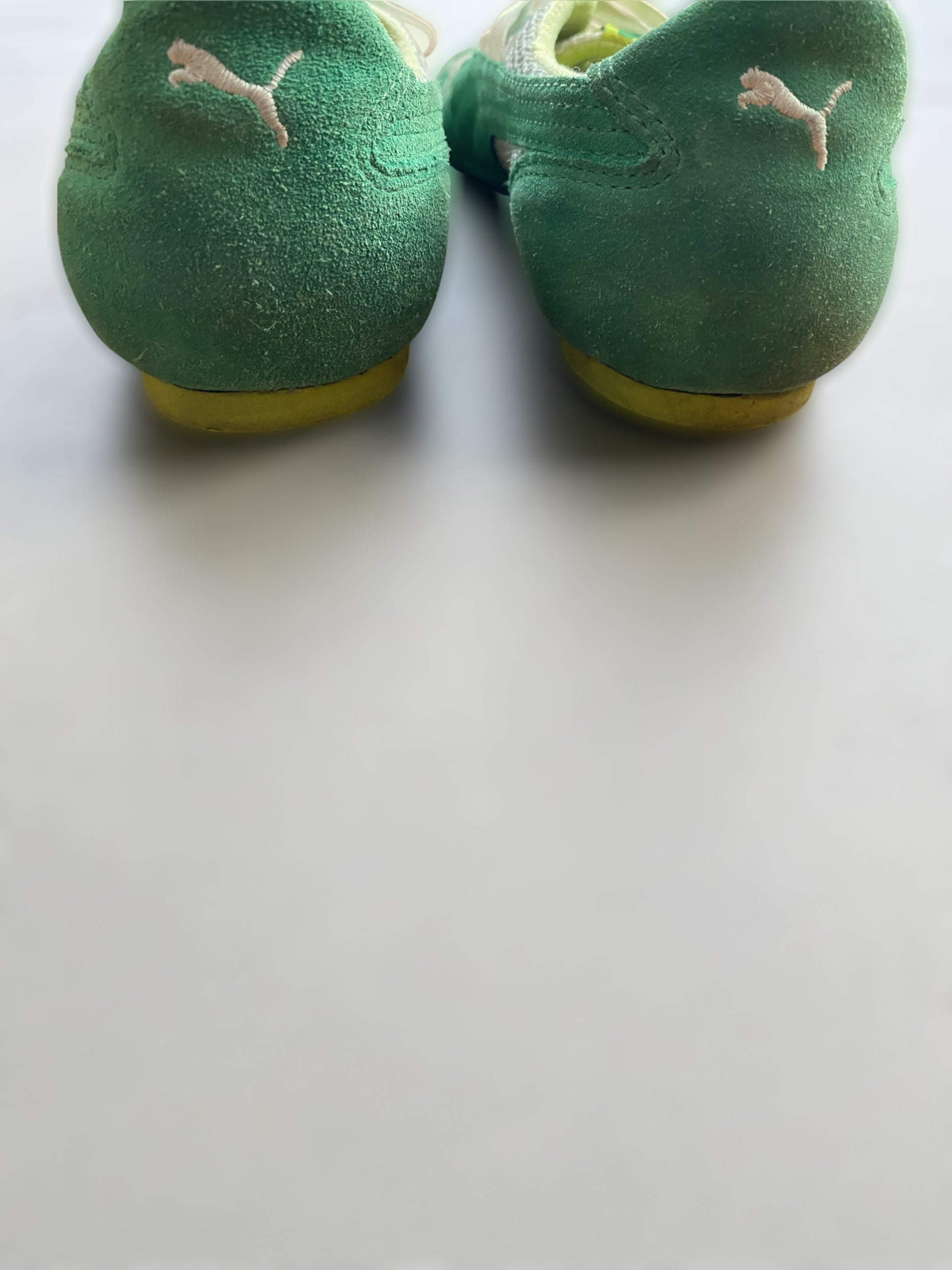 Circa 2010. Women’s sneakers green white color way. Features attached crisscross elastic laces over a mesh vamp. Flat slip-on