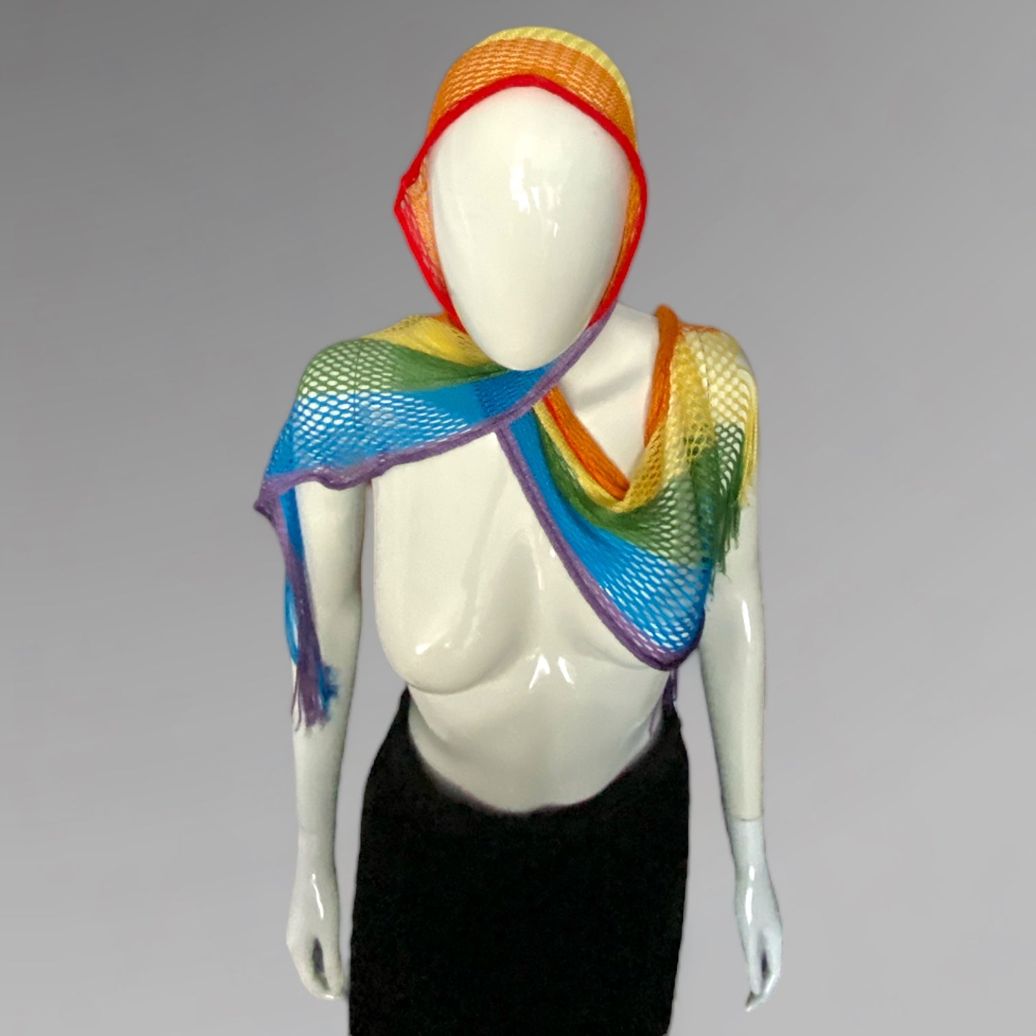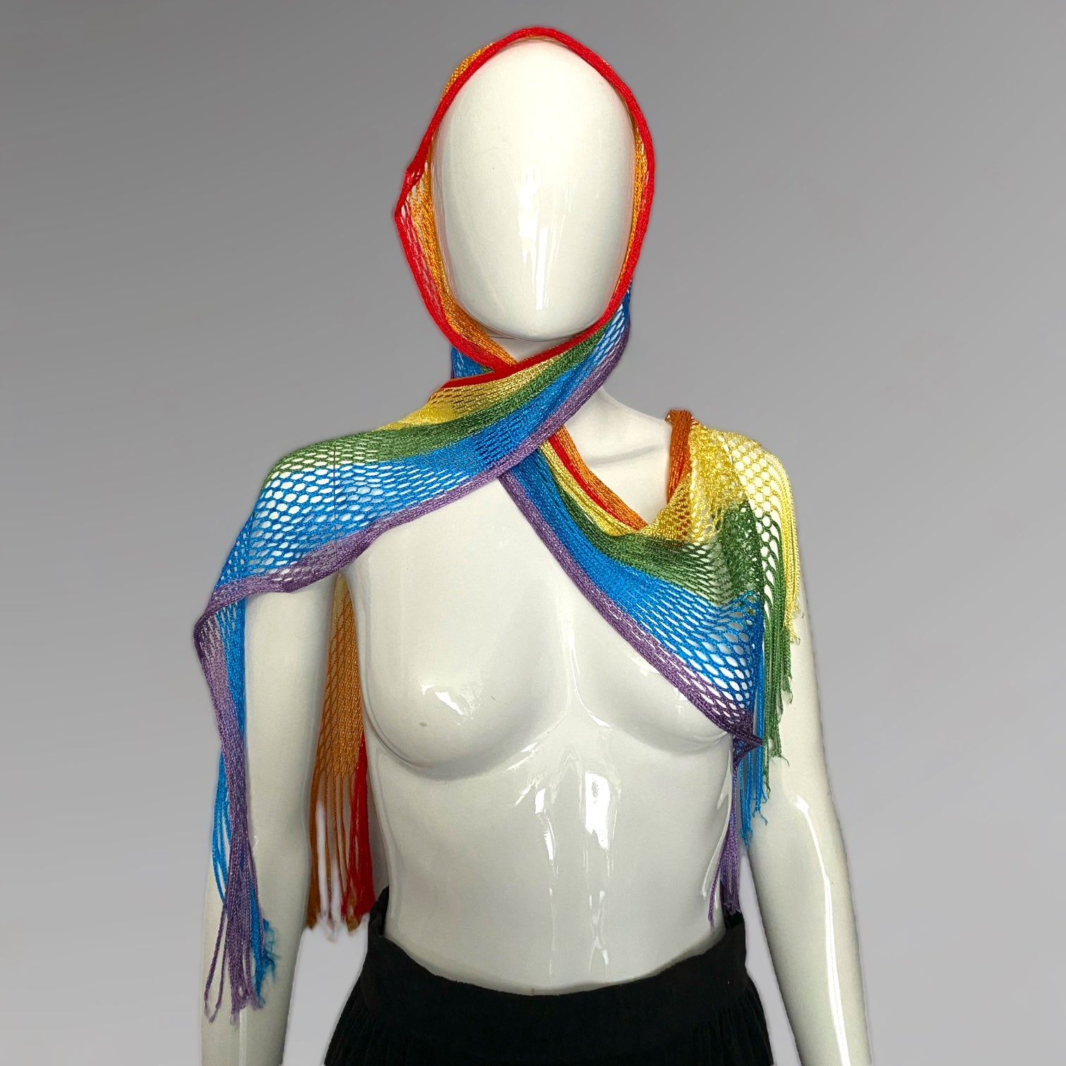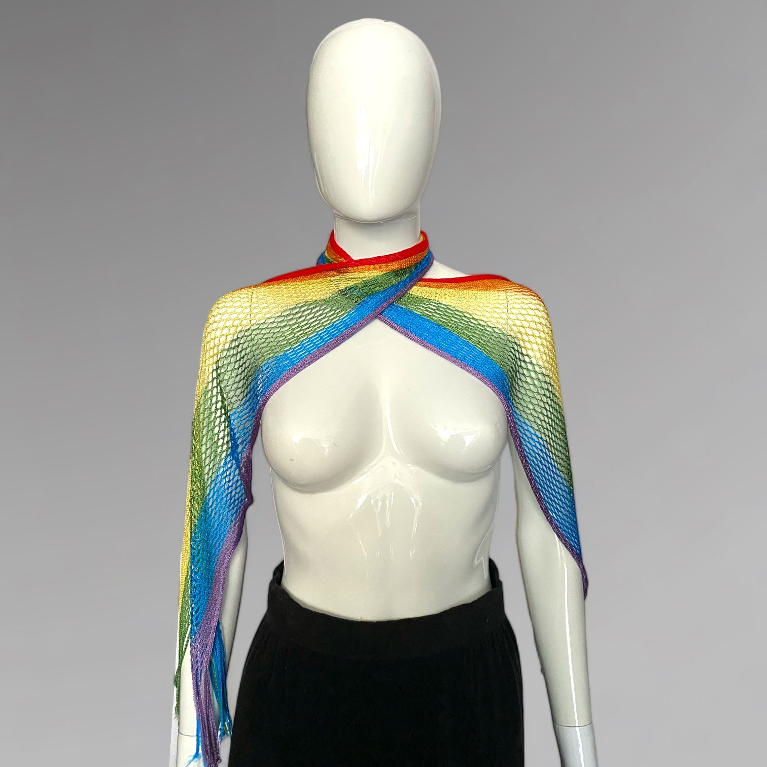 Brightly colored rainbow fishnet scarf with fringe edges.