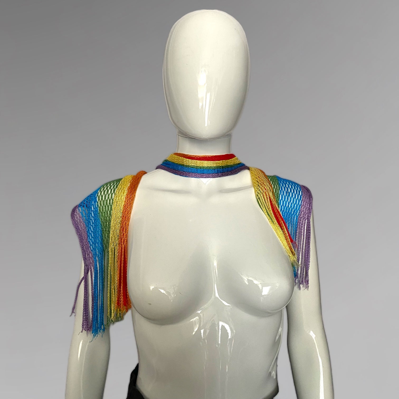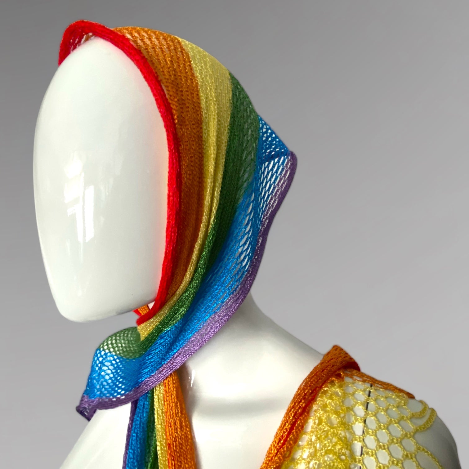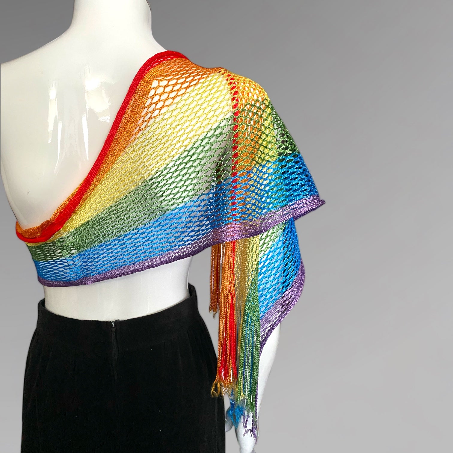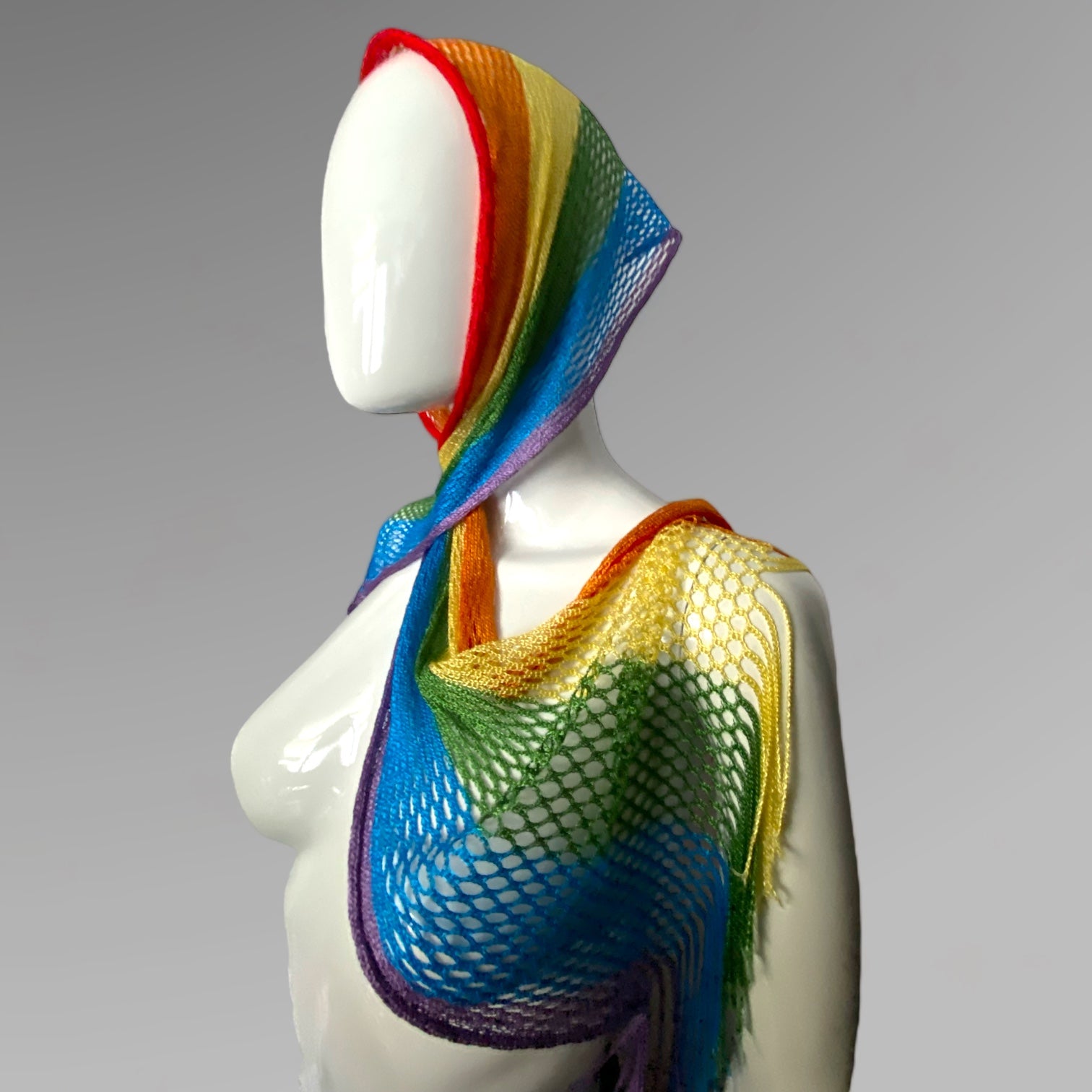 Brightly colored rainbow fishnet scarf with fringe edges.