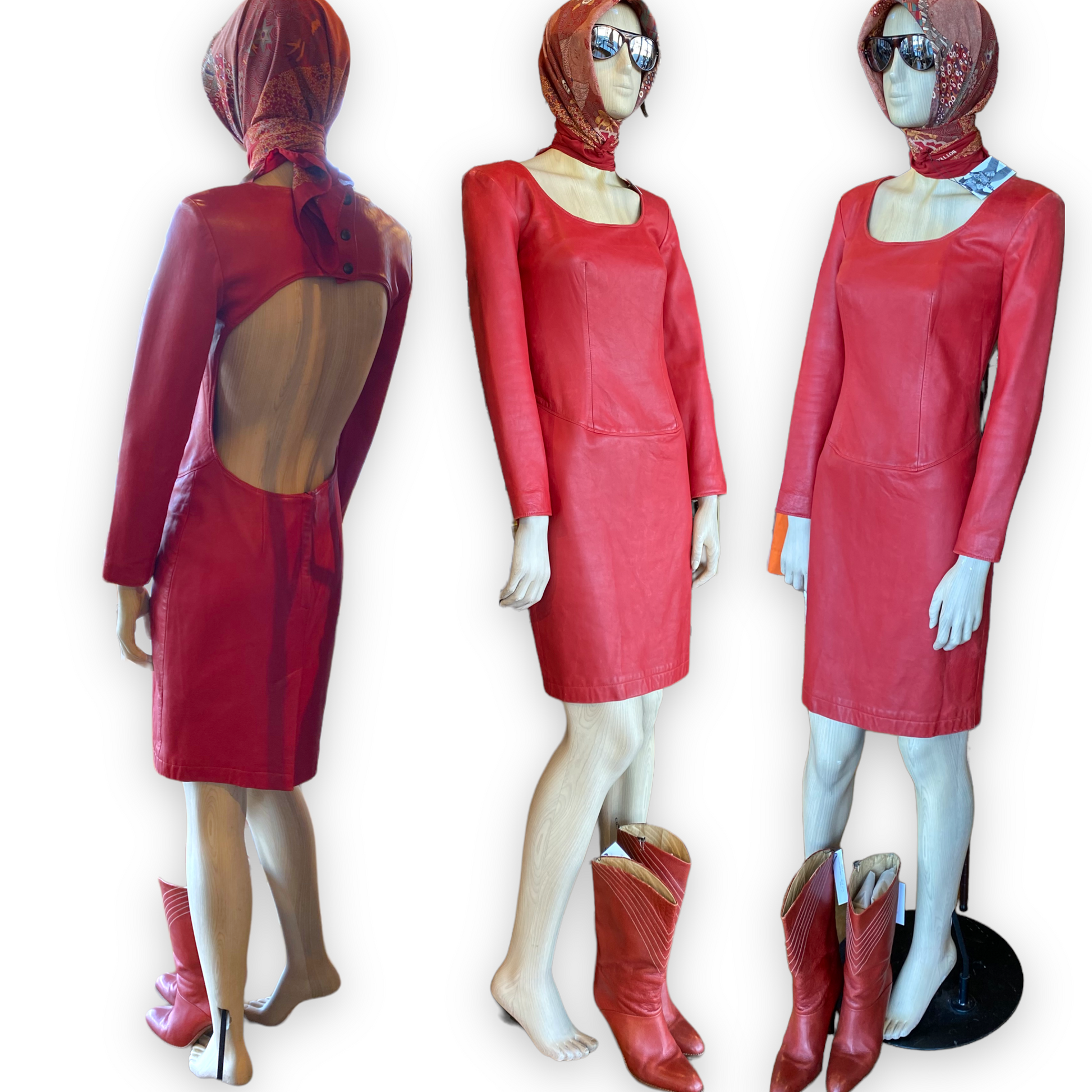 Sexy leather dress with an open back. Triple snap button closure at the neck. Zipper closure on the back of the skirt.