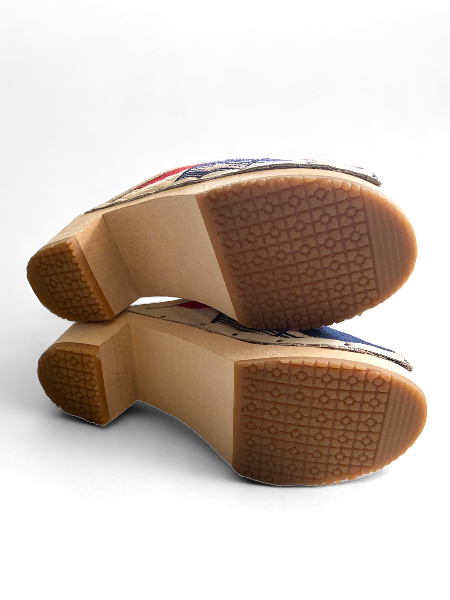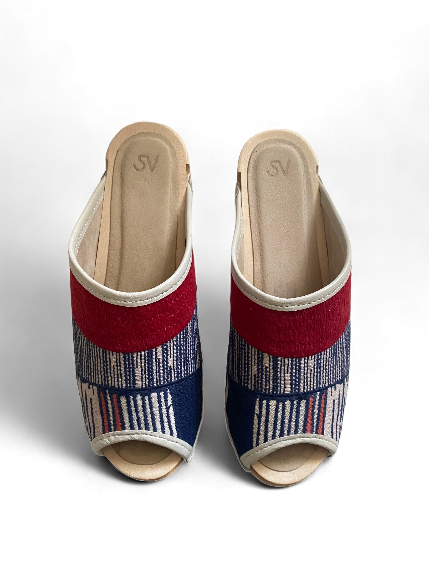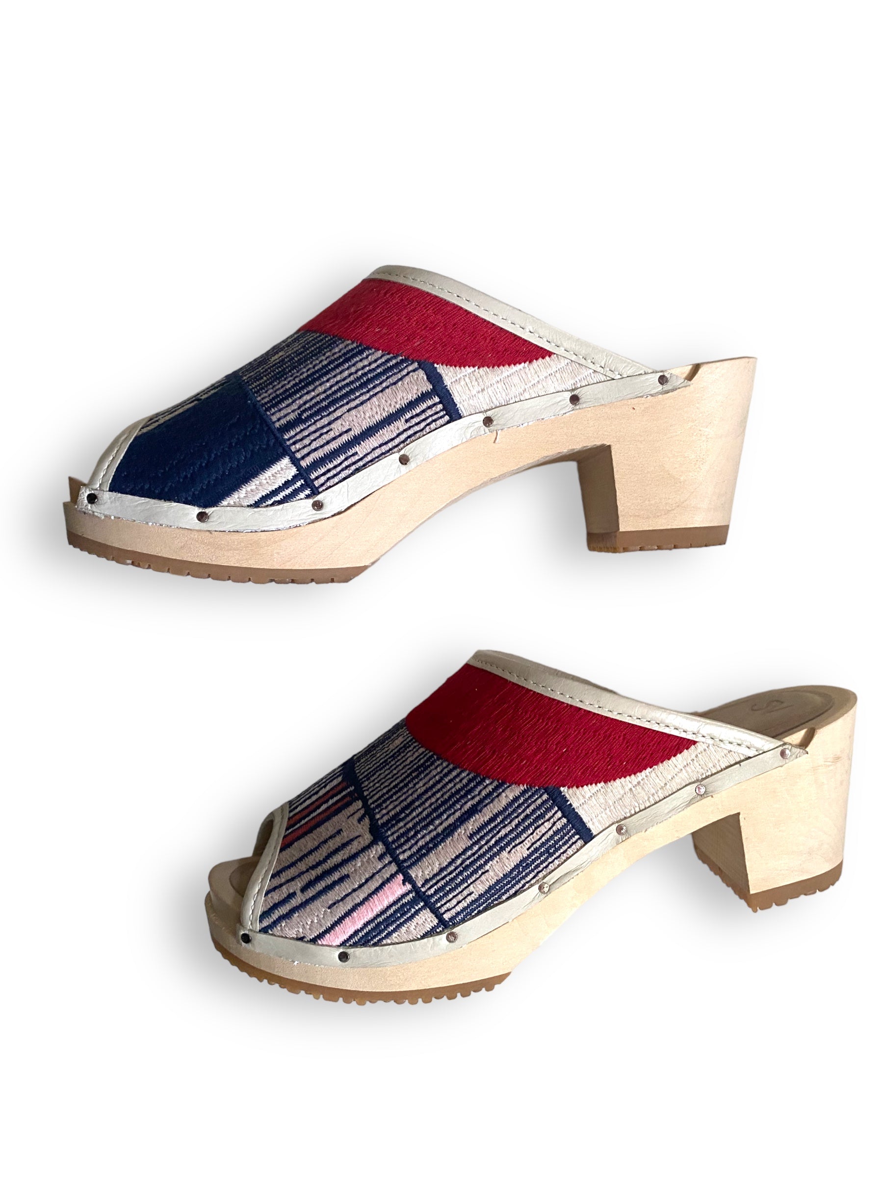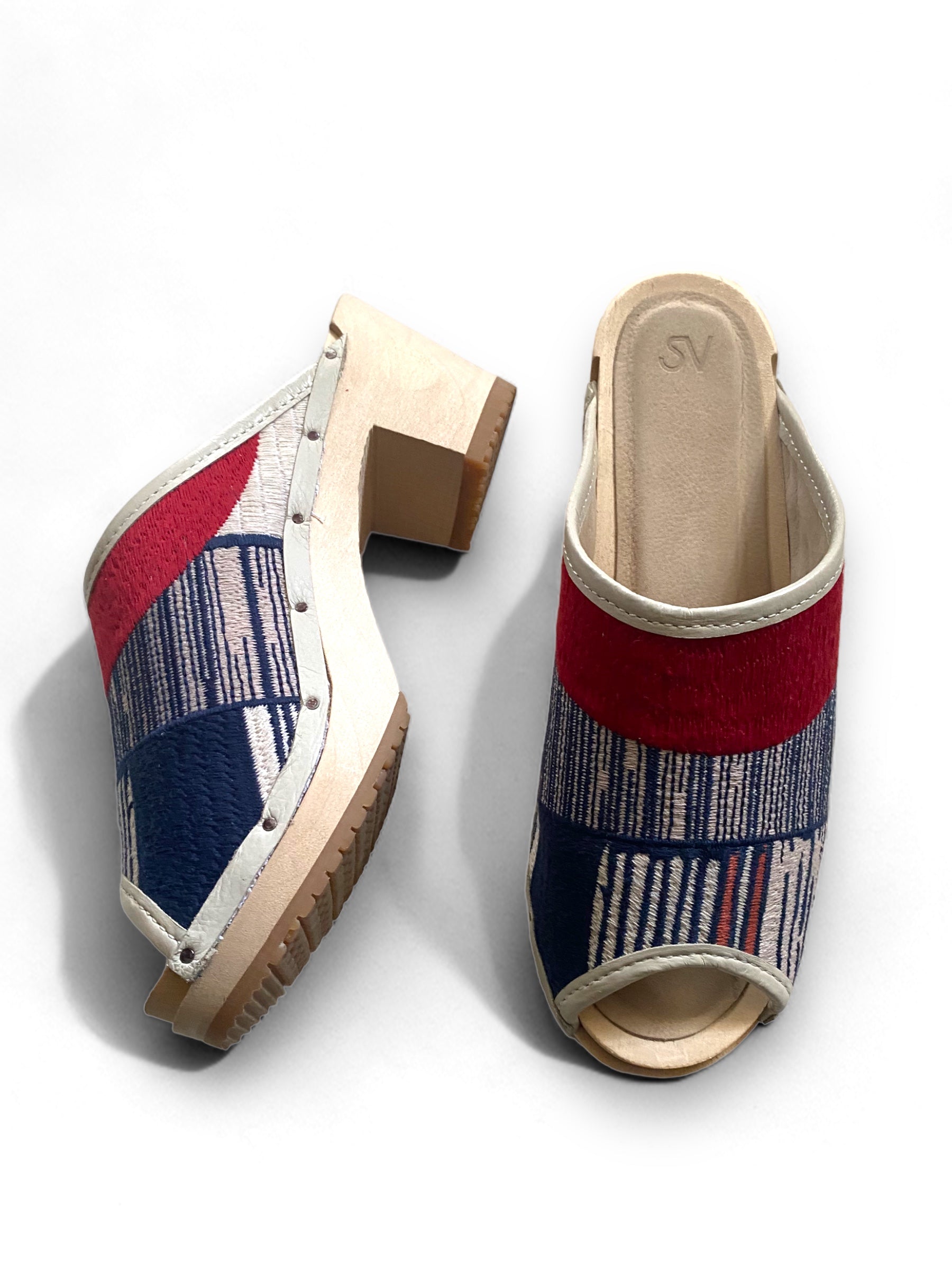 A Bay Area brand, Santa Venetia is known for a modern take on the traditional clog with a West Coast twist. The embroidered clog line retails for $280. The red blue white color way of our clog is harder to find.
