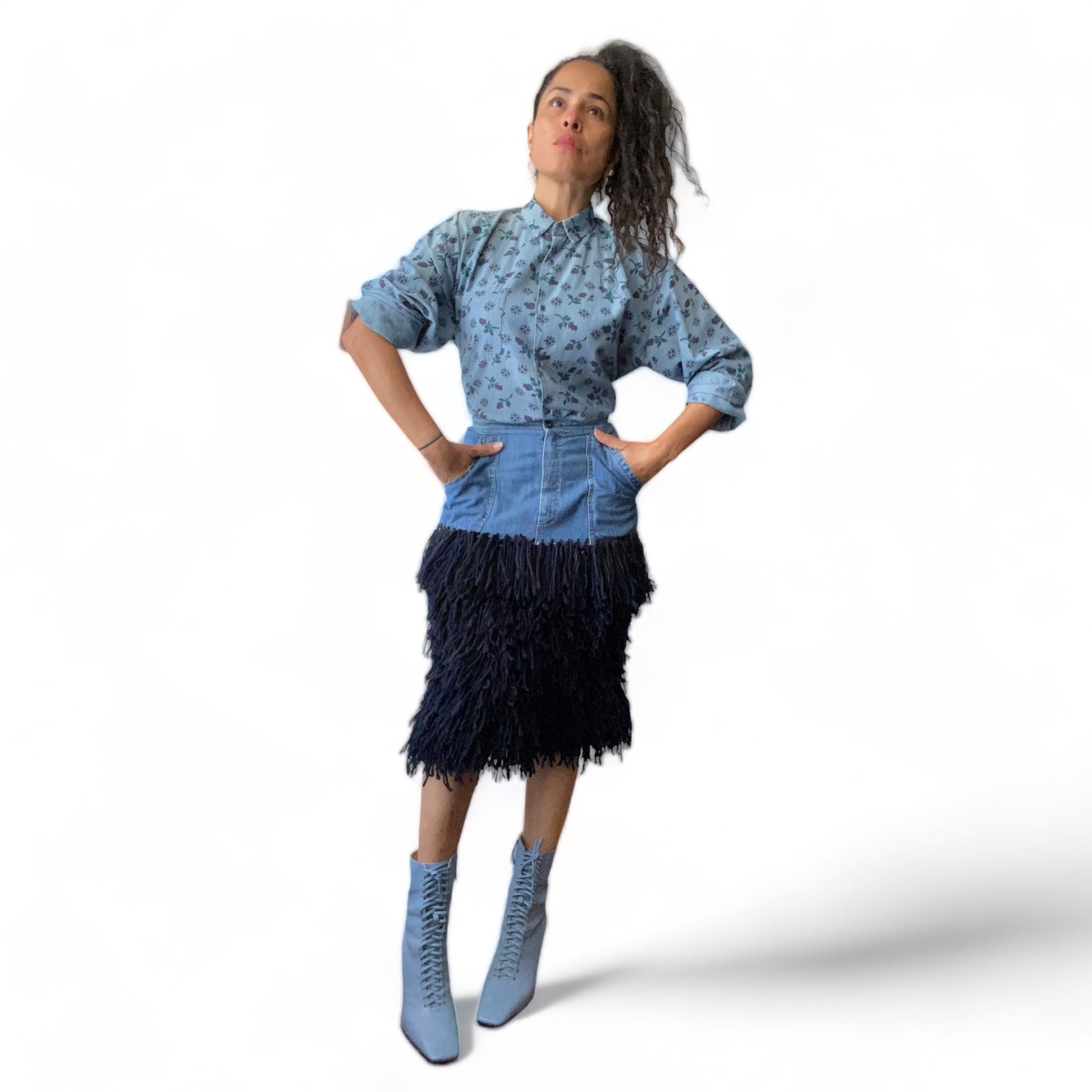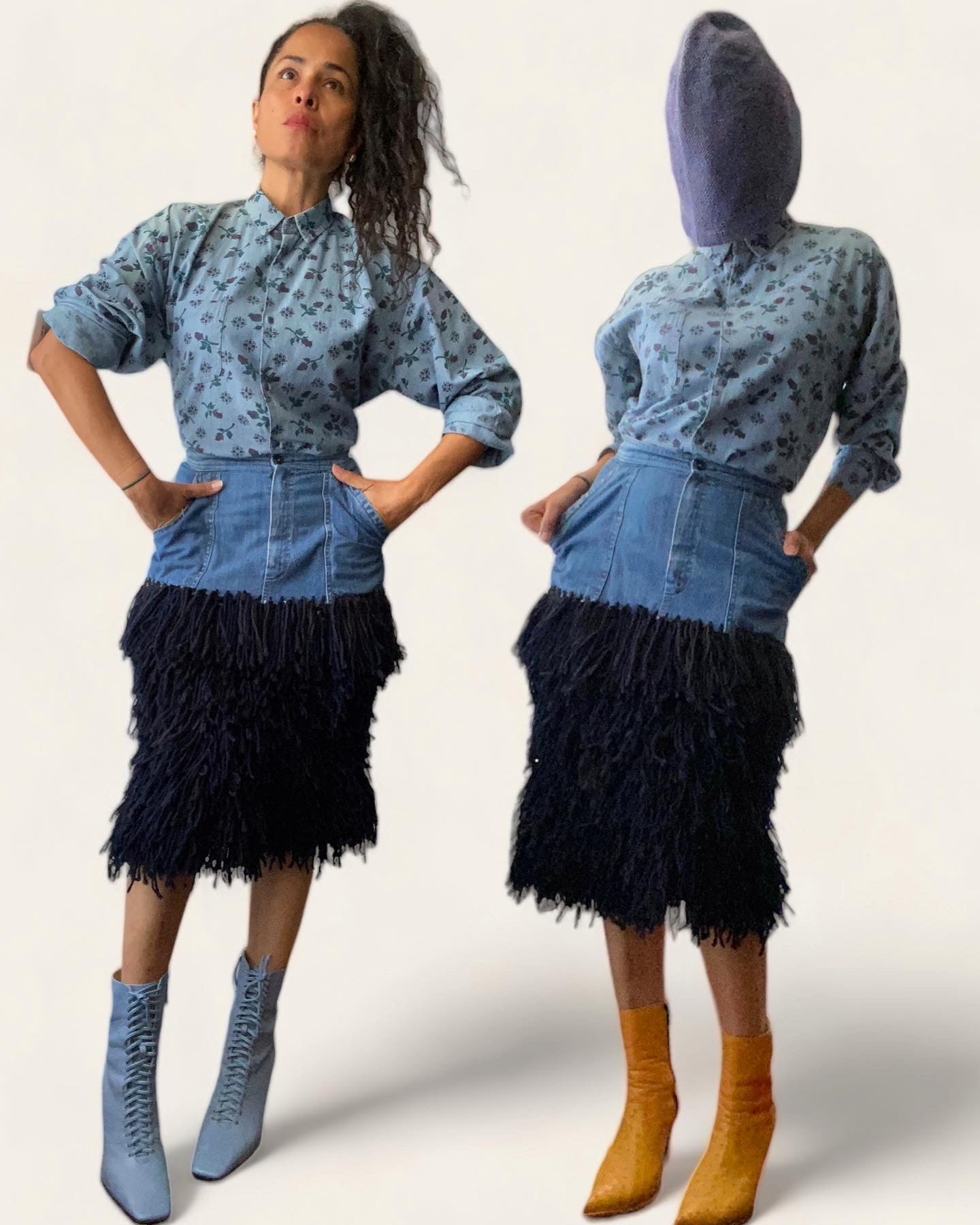 Reworked denim skirt with layers of fringe yarn. Made by hand by Agatha, crochet designer to the stars like Stevie Nicks