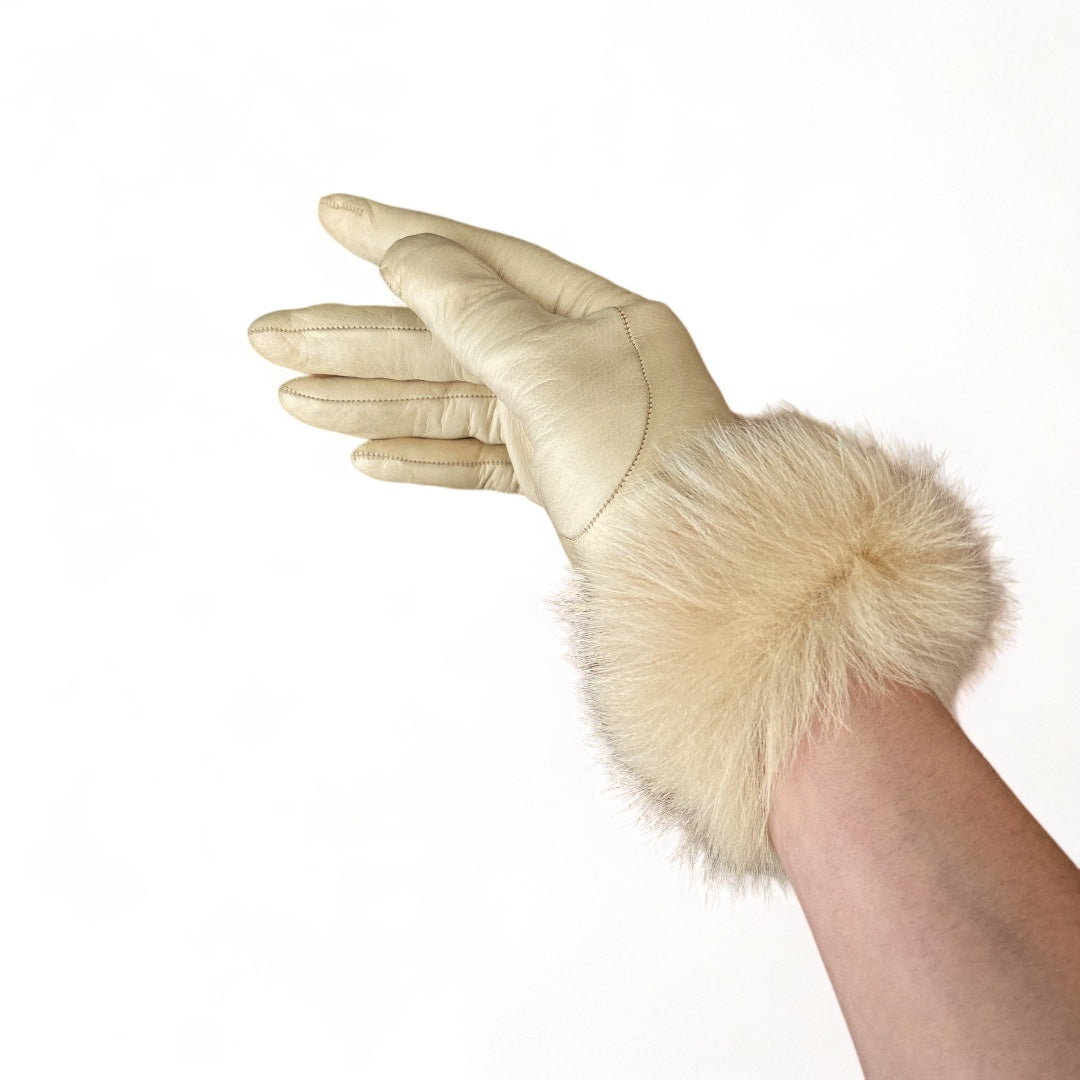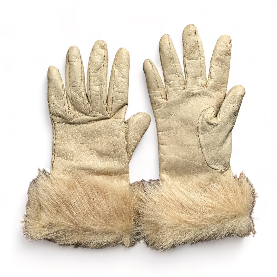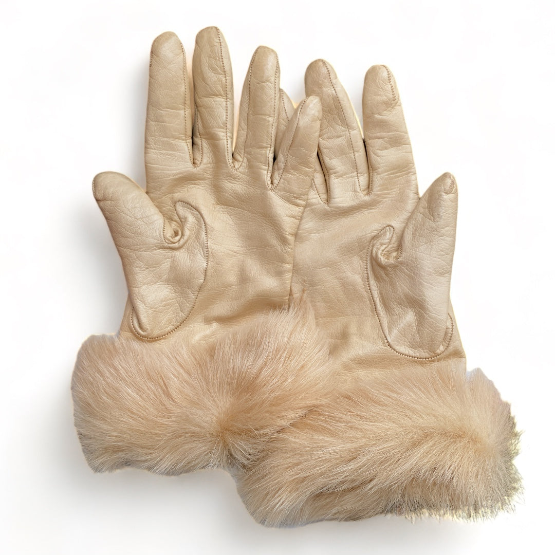 The first pair from Banana Republic's 2003 holiday colleciton. They made of a buttery soft ivory leather that is 100% genuine sheep leather. Lining is 100% lambs wool. Fur trim, dyed Italian shearling lamb. Size small.