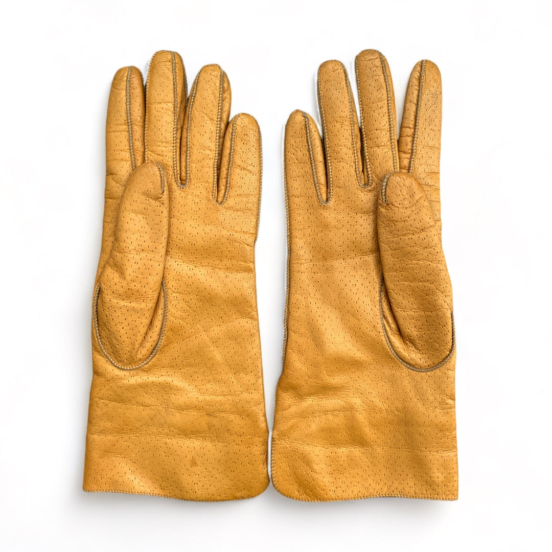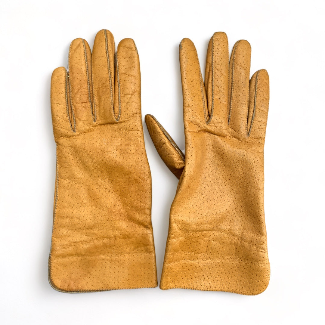 The second pair are a circa 1990s Cassidy gloves in a sable tan color. Micro perforation detail with a slit wrist. Lined in a cashmere-nylon blend knit. Size small.