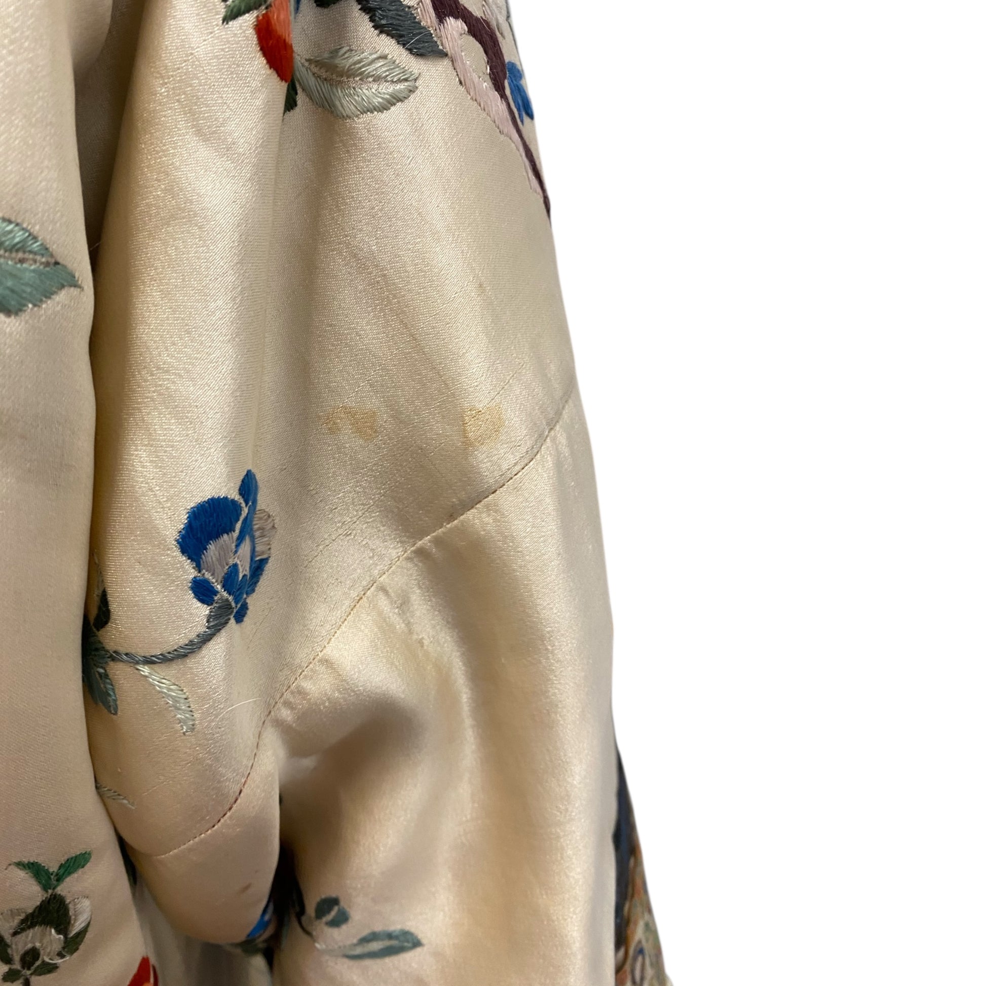 Exquisite 19th-century coat, entirely handcrafted from silk fabric and silk thread, and luxuriously lined with rabbit fur. Embroidered with florals and scenes of everyday life, reflecting the cultural artistry of its origin. Features traditional loop-and-knot button closures and wide, dramatic sleeves. A wearable piece of history, invest in storied style with rich cultural provenance.
