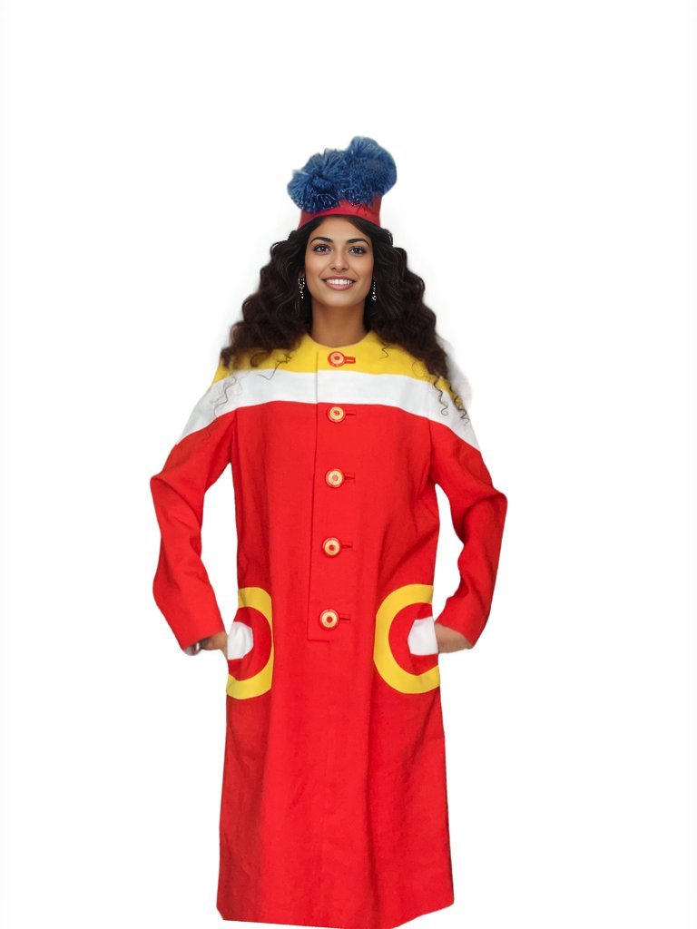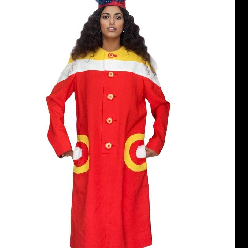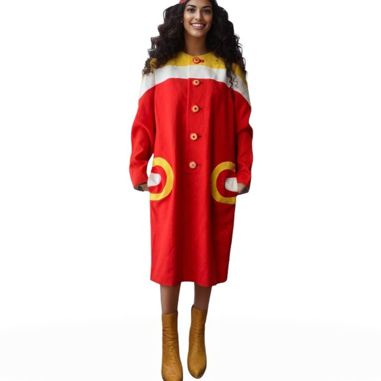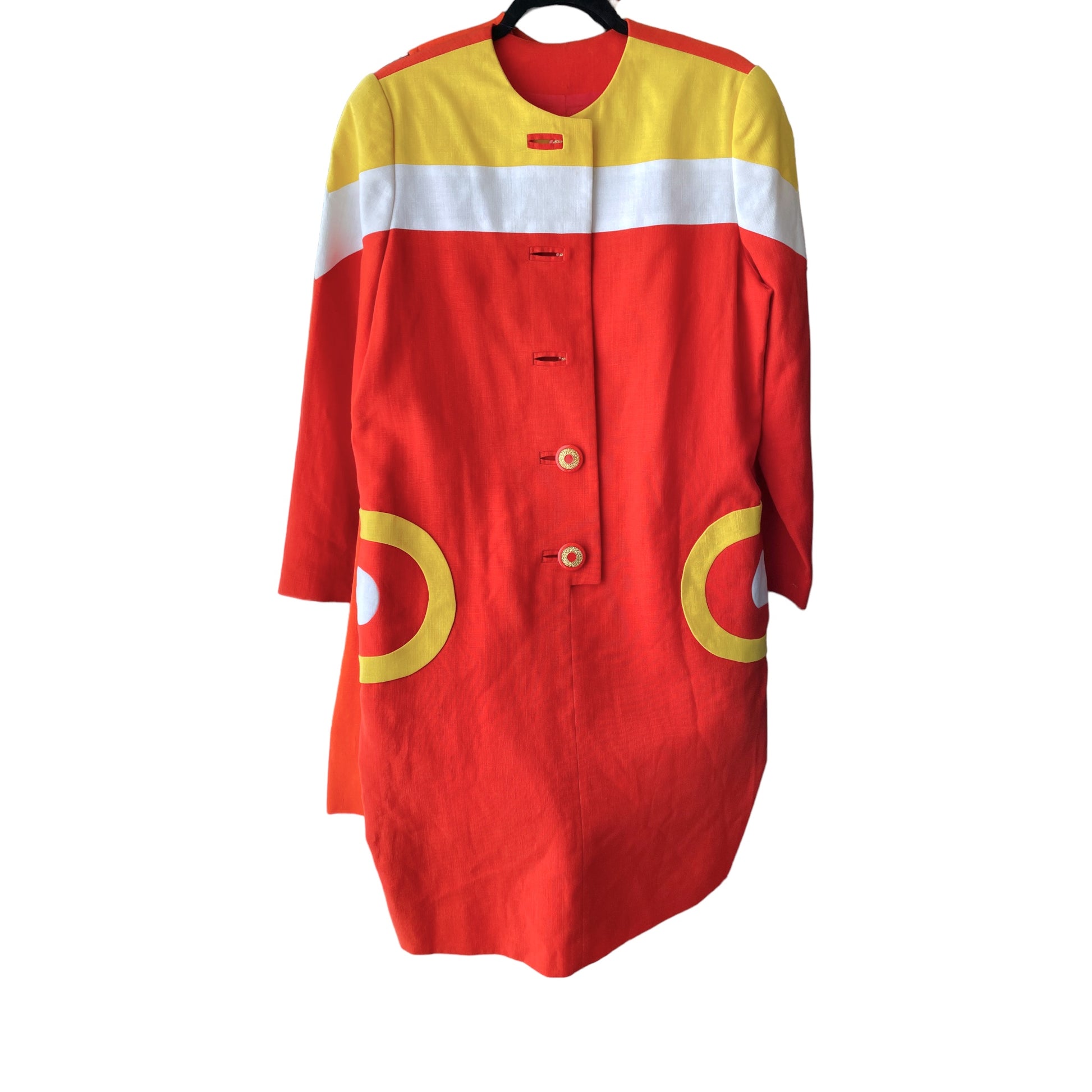 Circa 1980s revival of a 1960s mod style. Padded shoulders. Gilded buttons. Color blocking. Circular pockets that nod to Pierre Cardin's famous circular designs of his iconic space age collections. Tapers at the hem