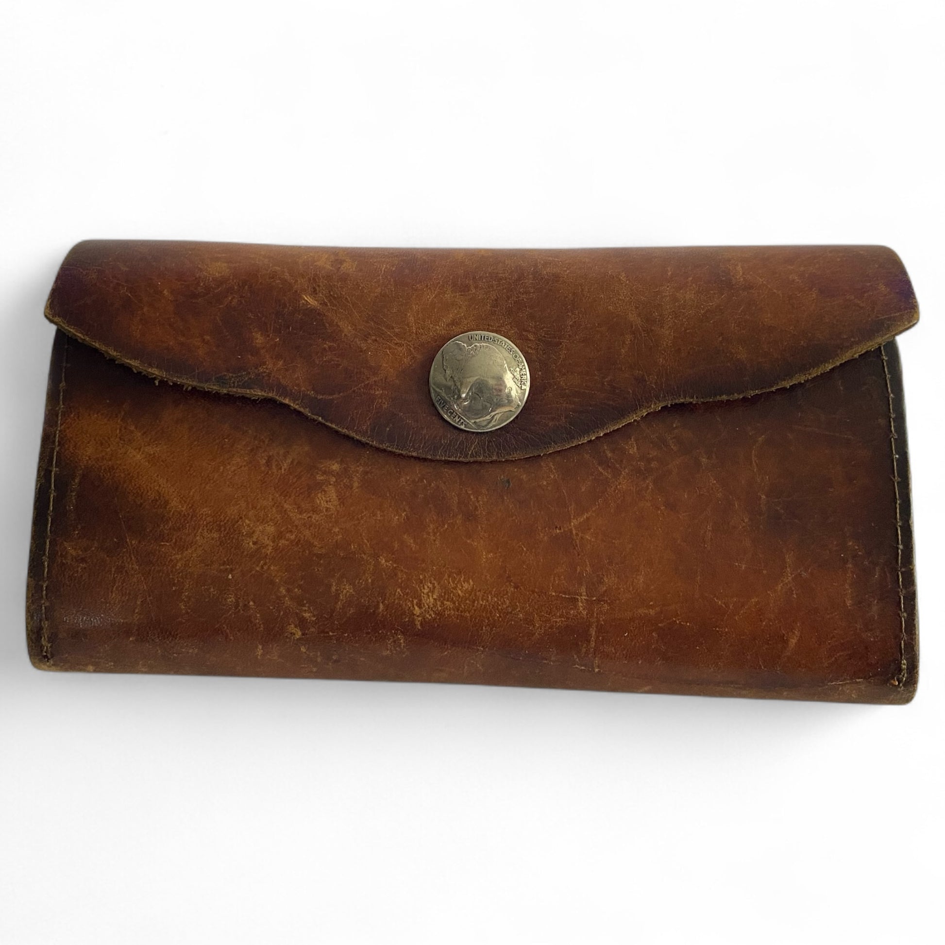 1960s. Gorgeous patina. Old school checkbook holder. Art deco stamped corners on the back. Buffalo metal snap button closure.