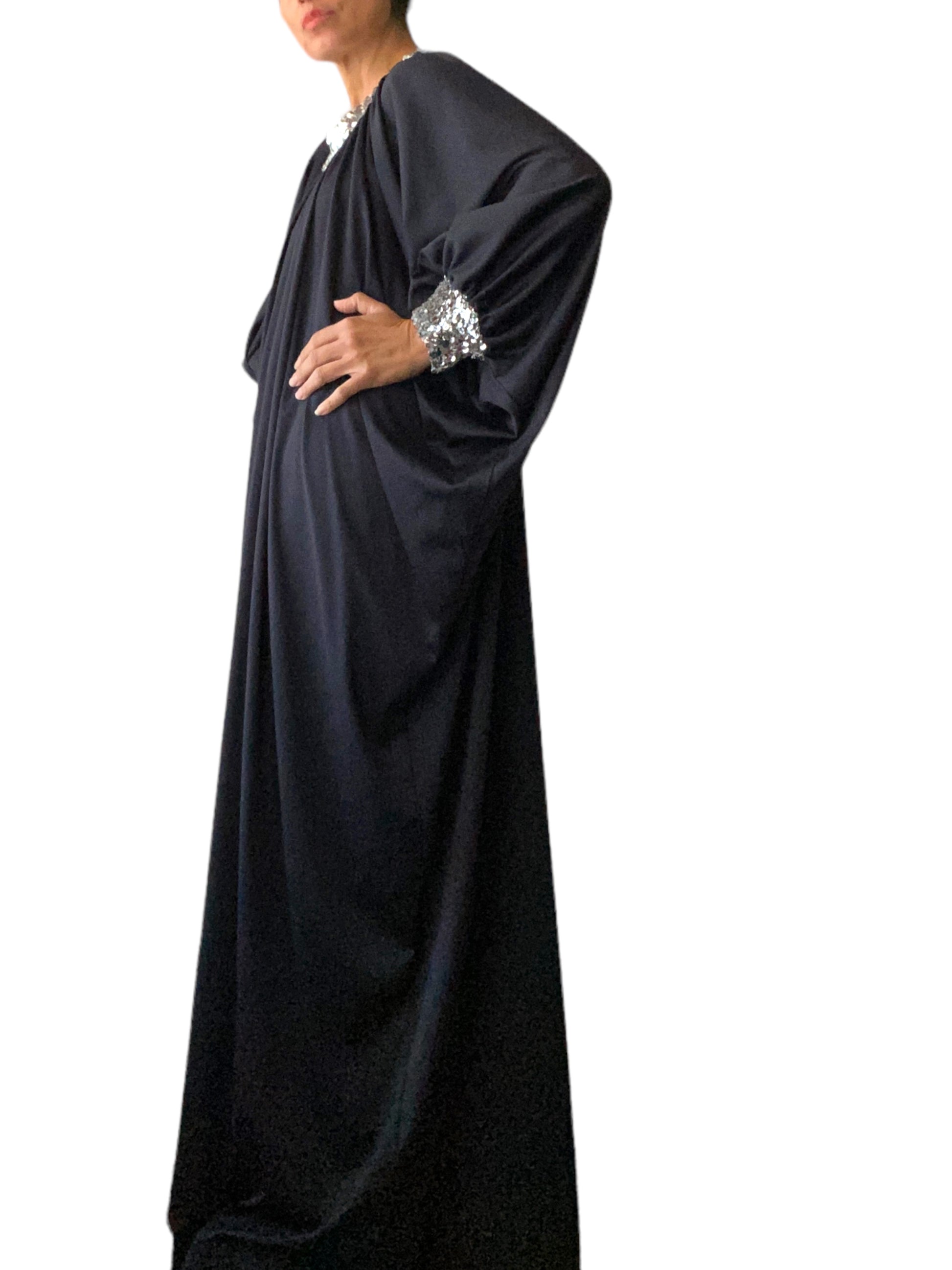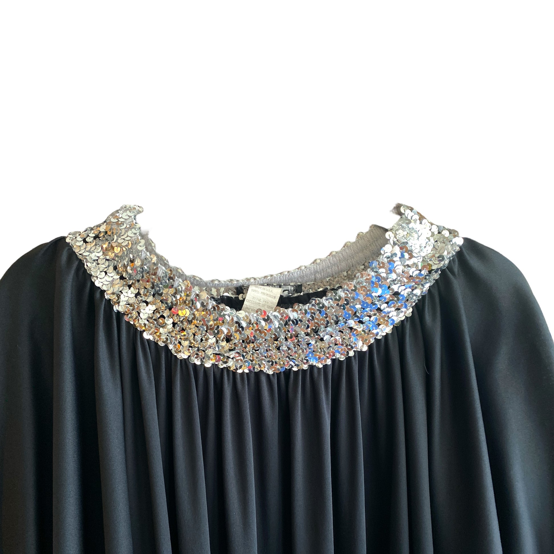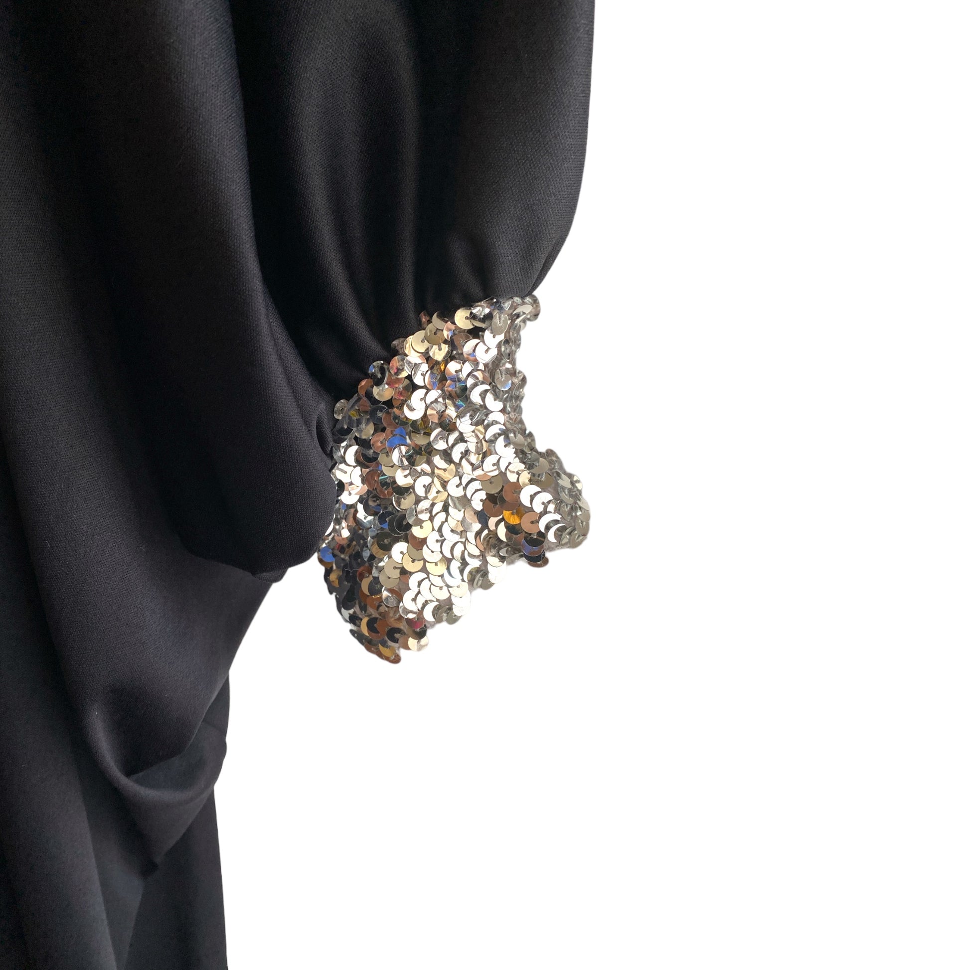 Midcentury era. 60s domestic goddess with cosmopolitan in hand. Silver sequin collar and cuffs. Dolman sleeves. Poly