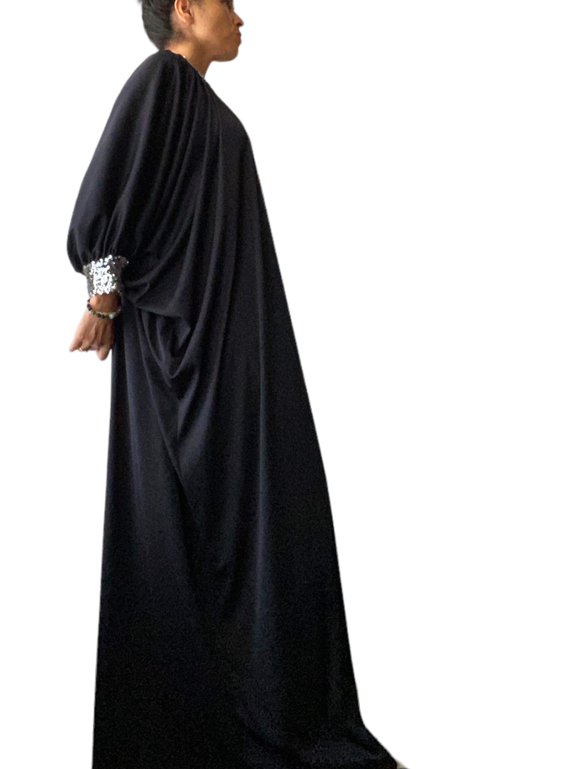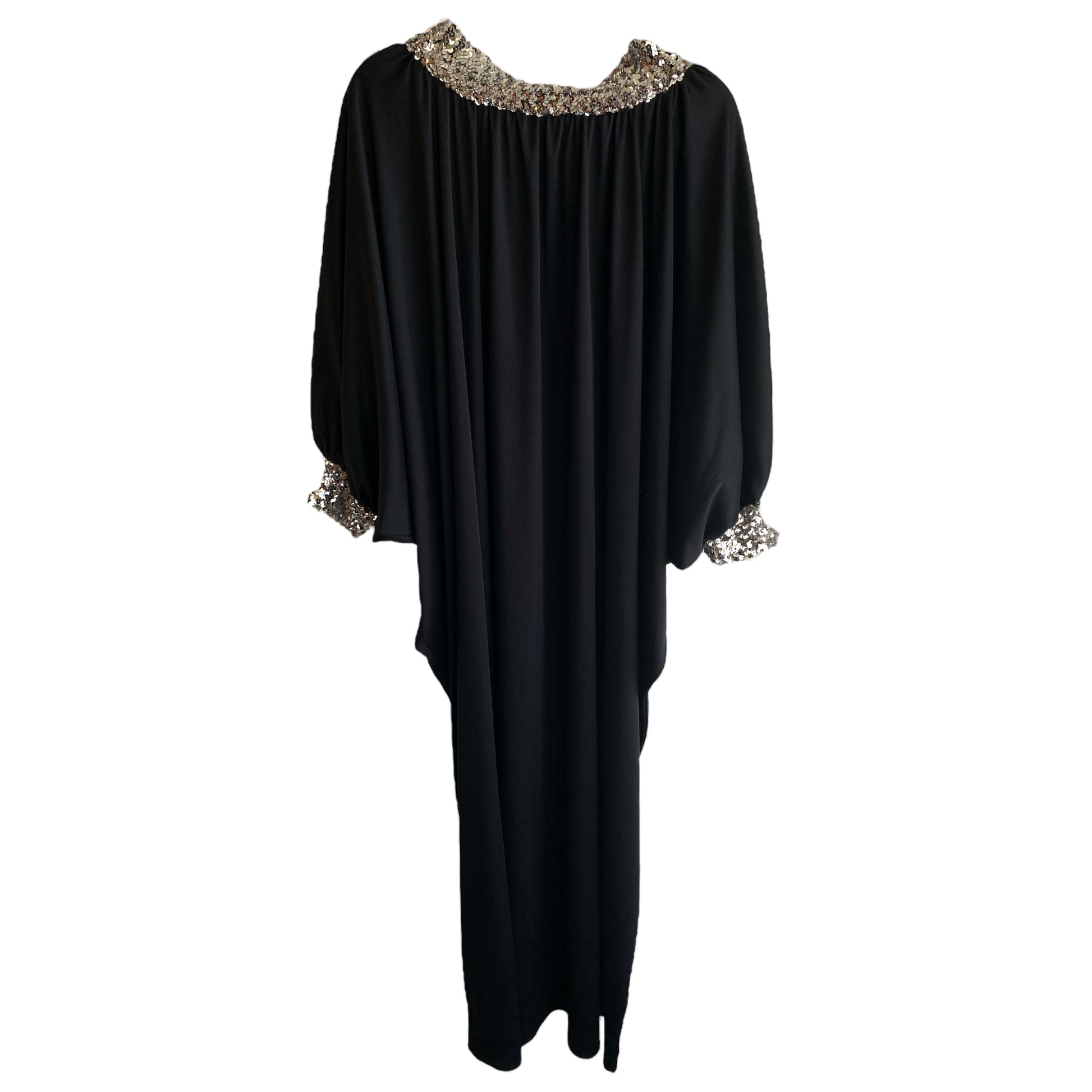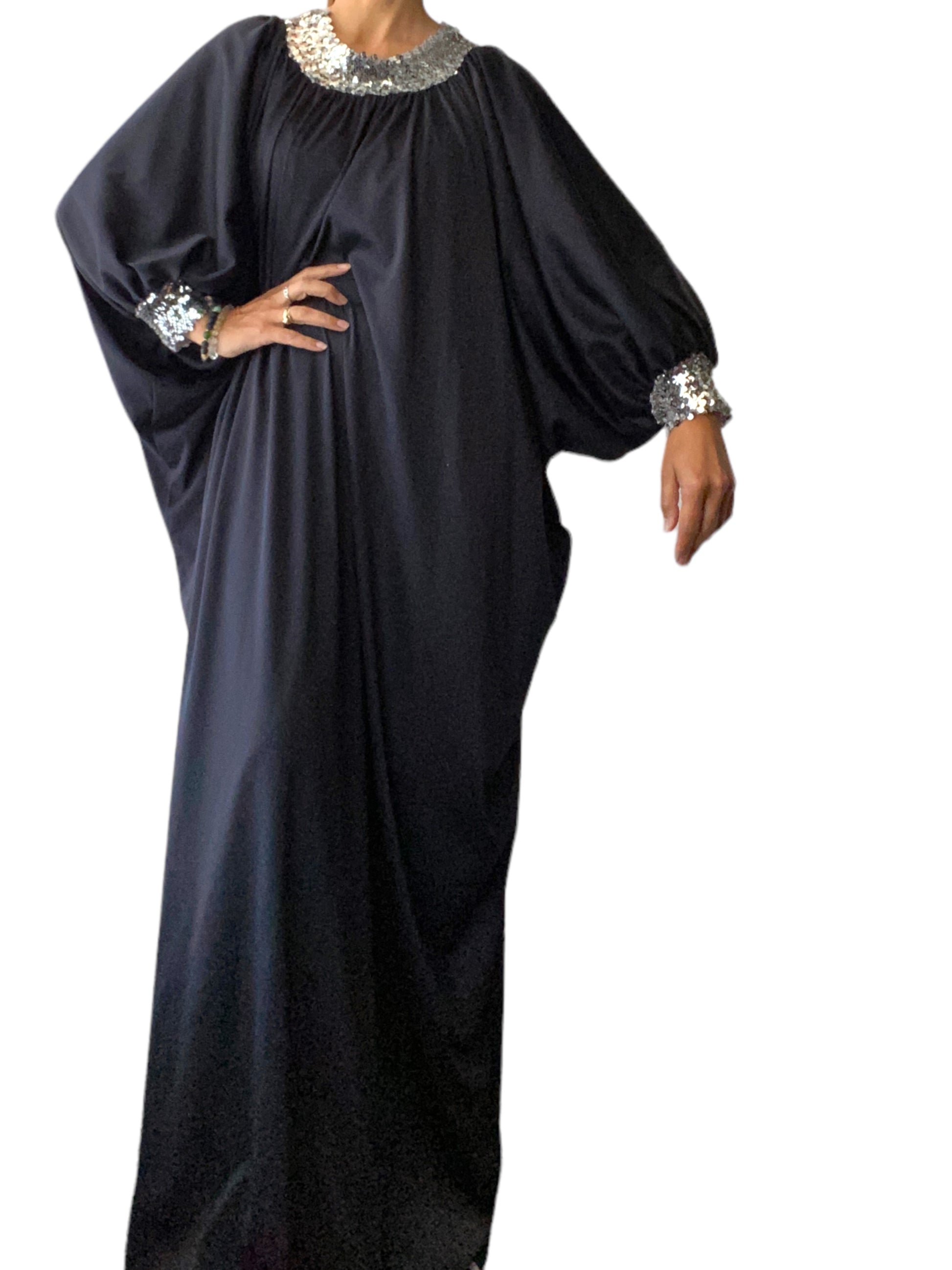 Midcentury era. 60s domestic goddess with cosmopolitan in hand. Silver sequin collar and cuffs. Dolman sleeves. Poly