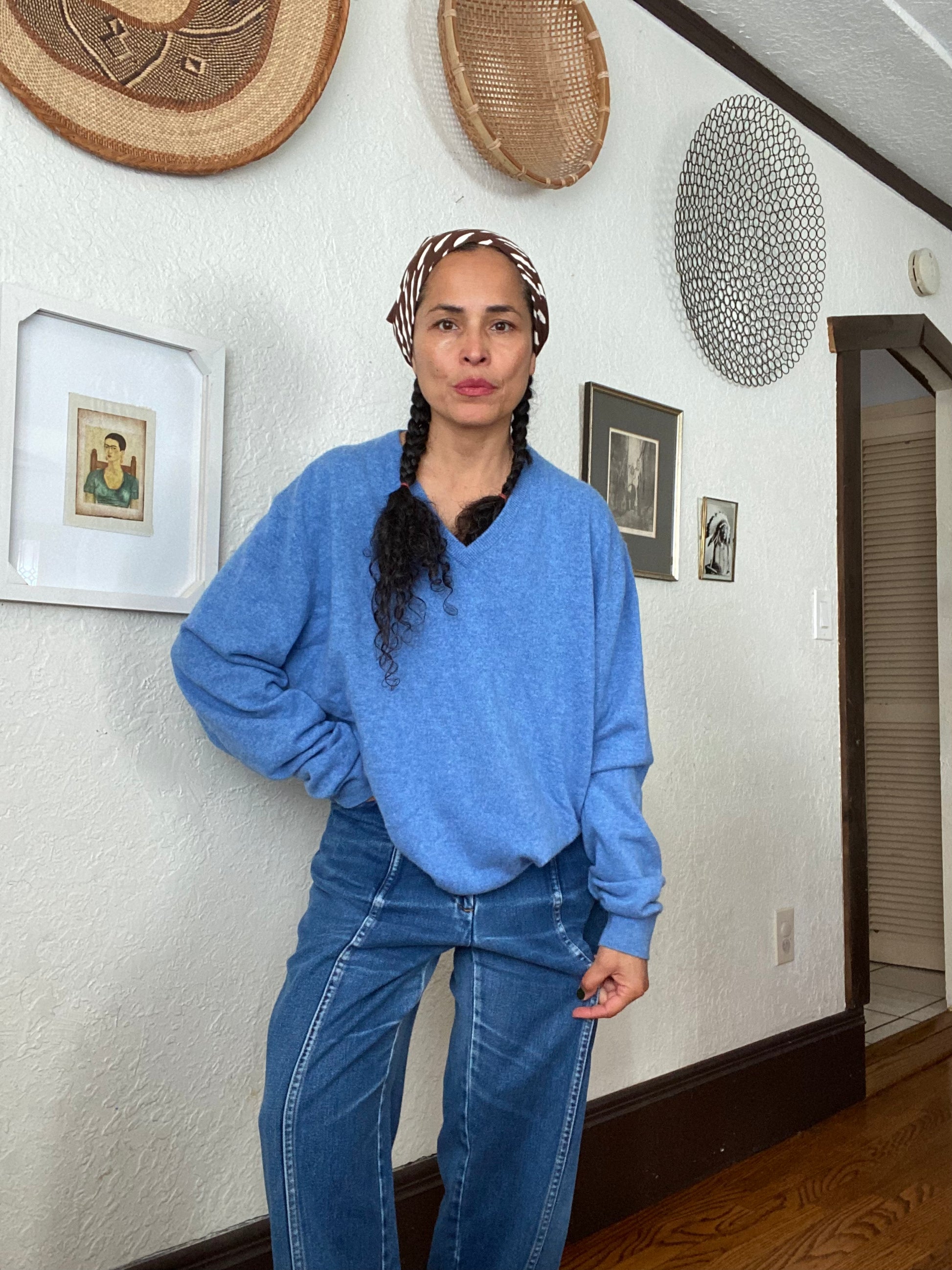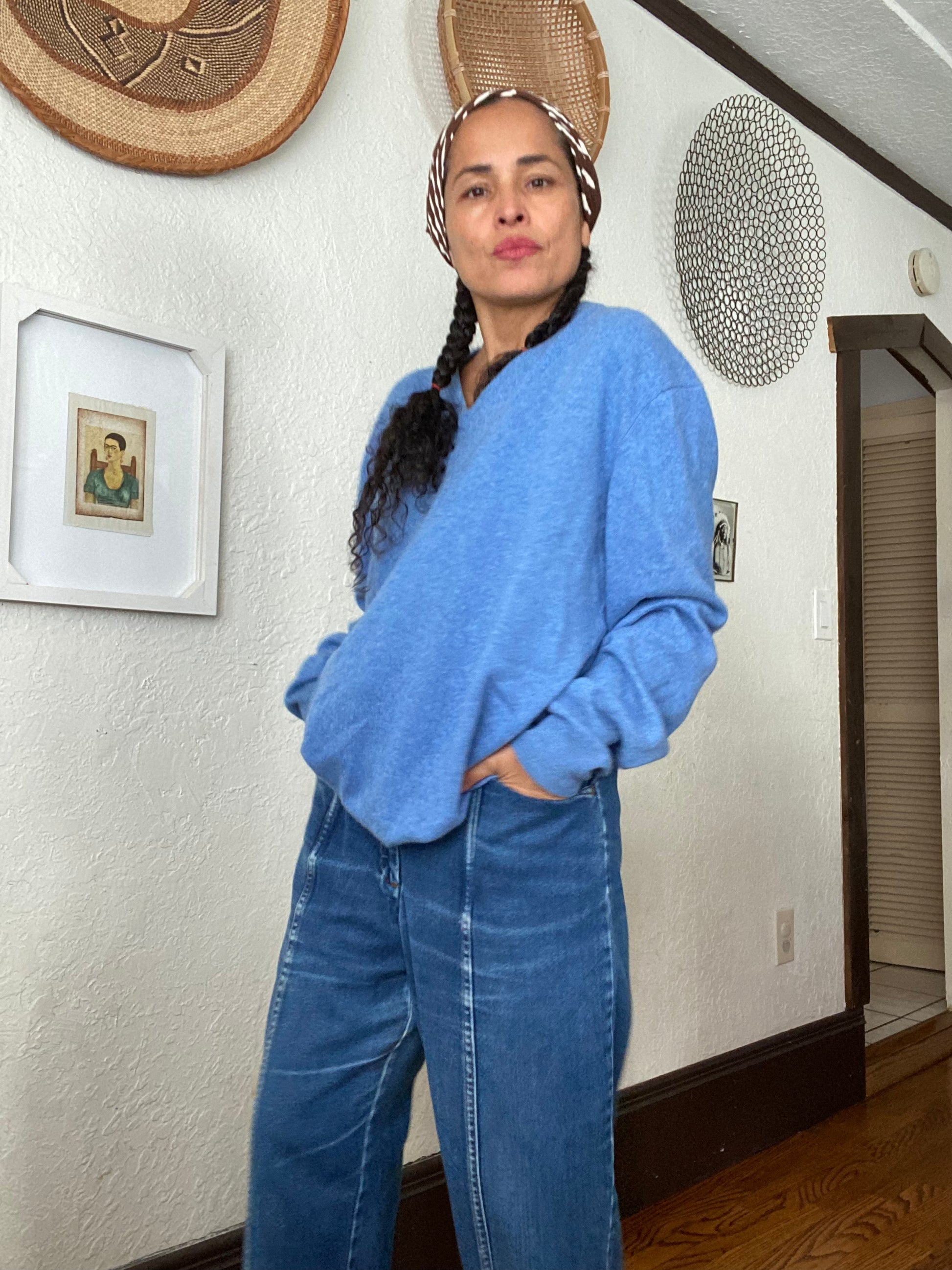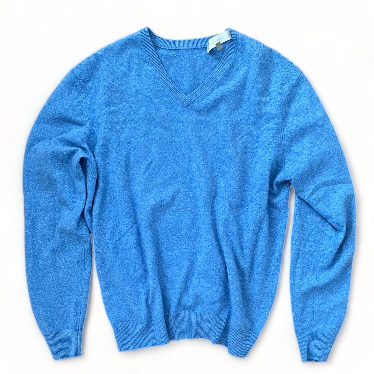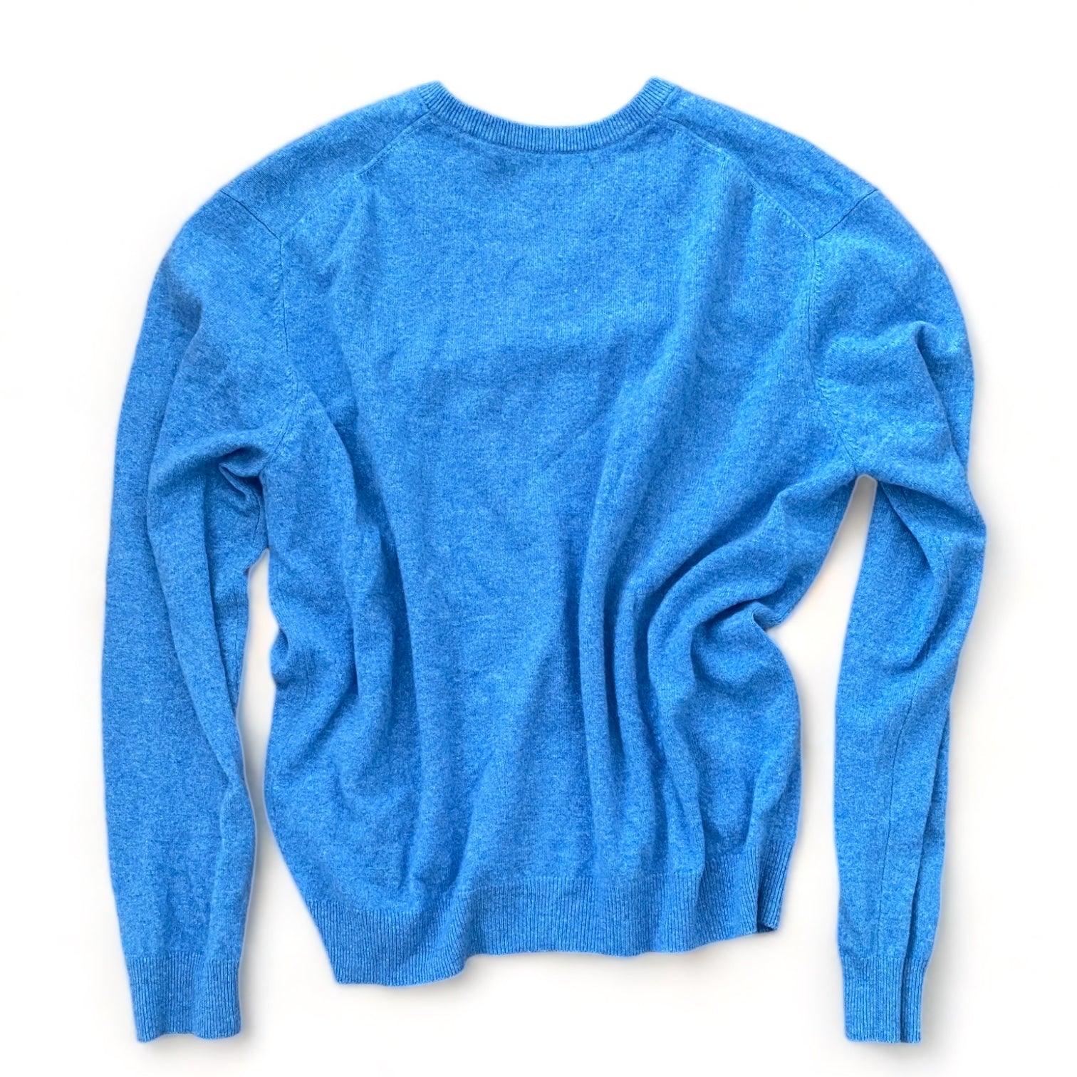 Blue cashmere boyfriend sweater is luxuriously soft. V-neck with ribbed waistband