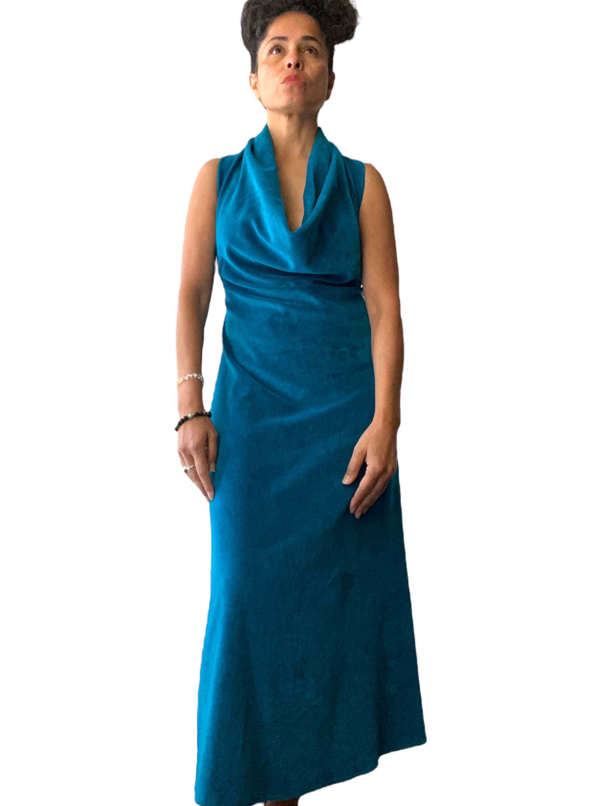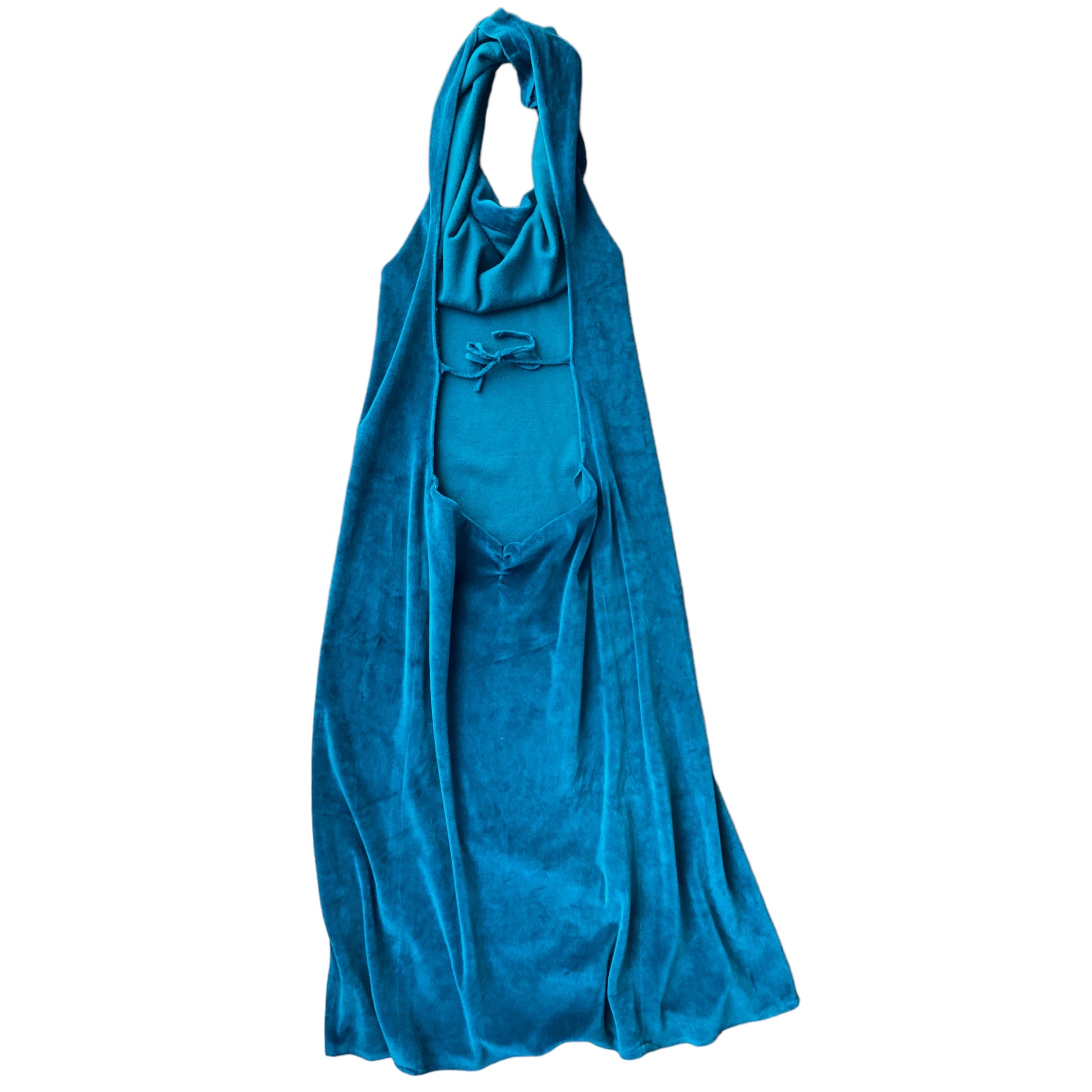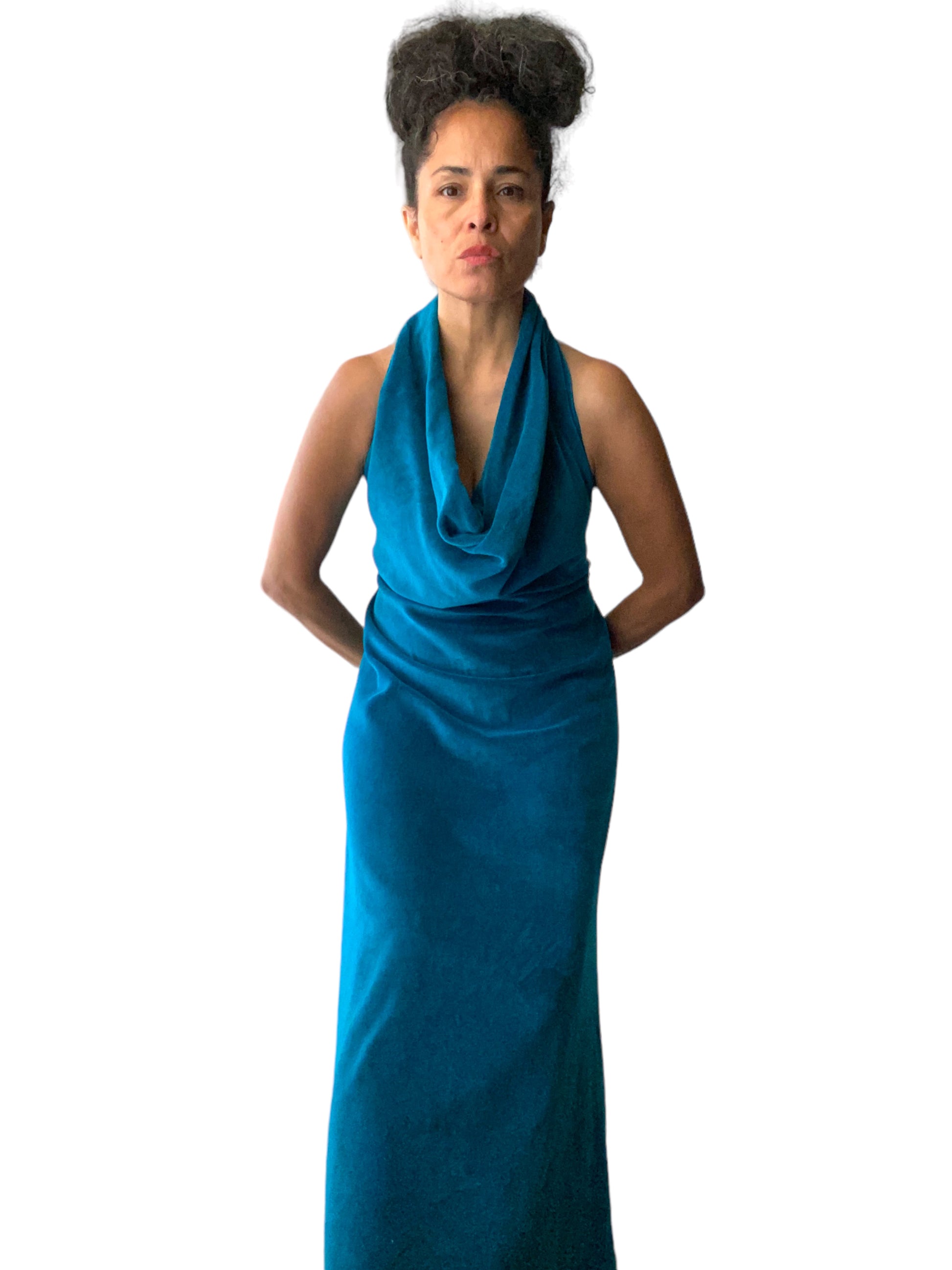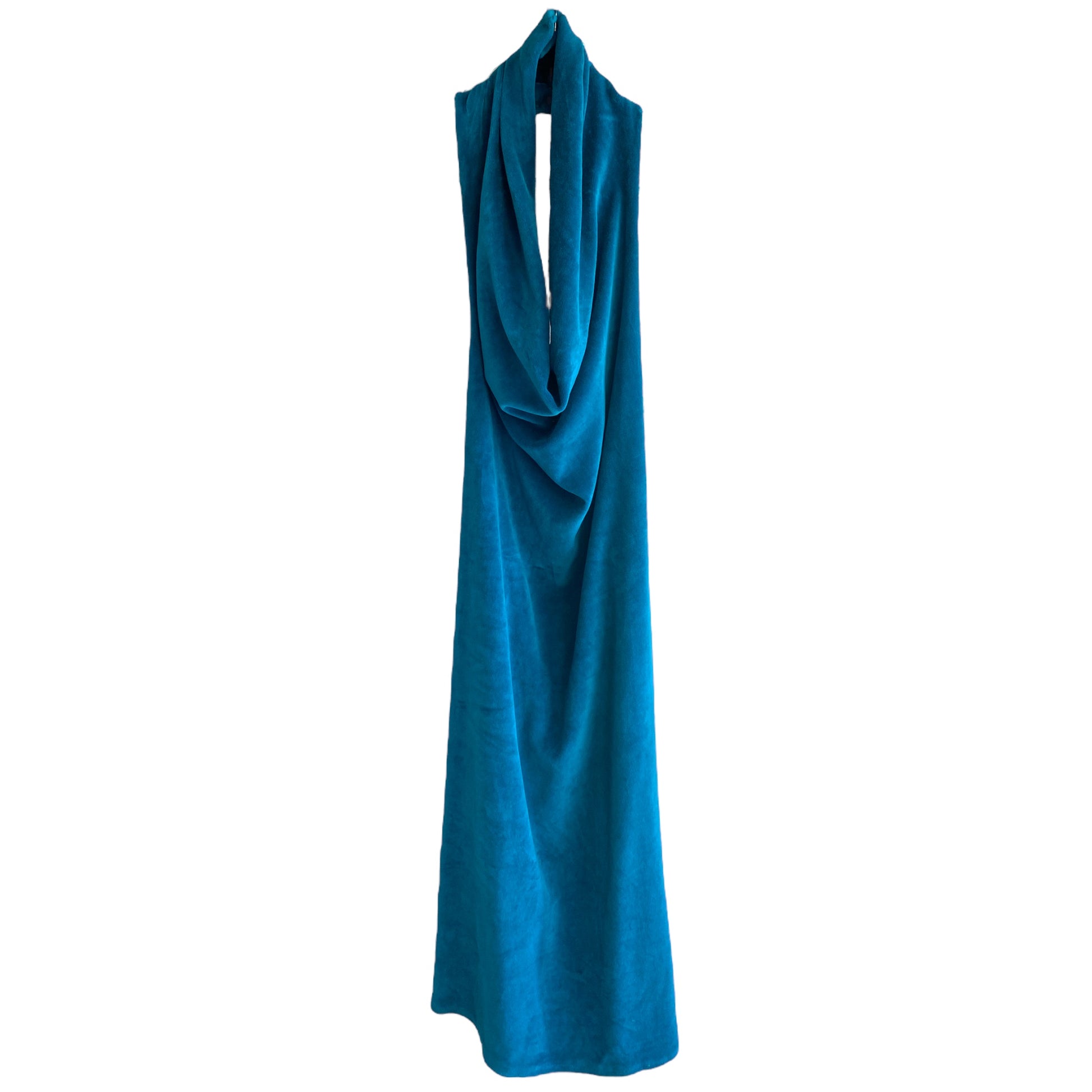 Uber sexy. Rich hue and a very daring open back with ruching detail at the buttox. Spaghetti strap on the back. Shawl collar halter.